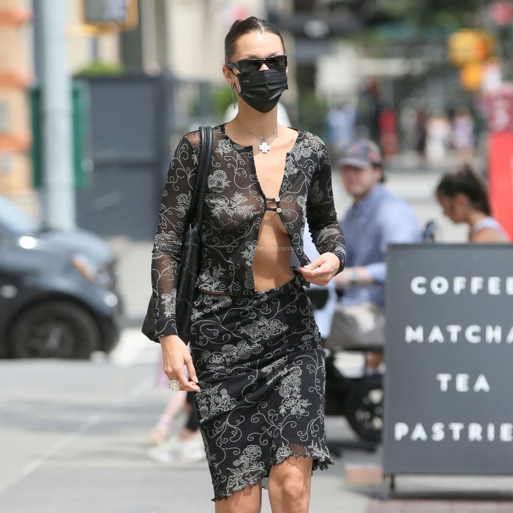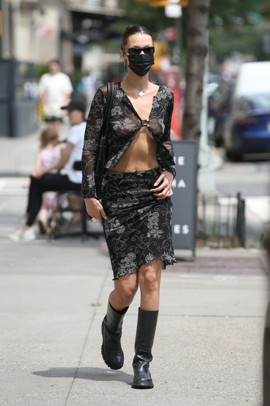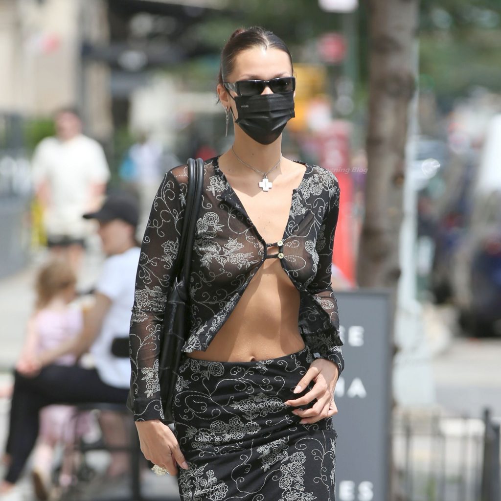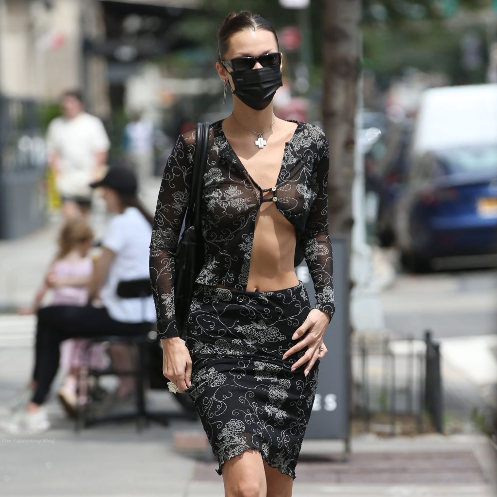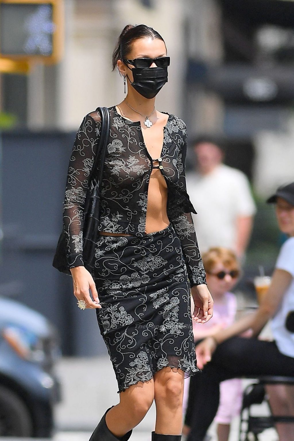 Model Bella Hadid leaves for the airport in New York City, 08/01/2021. She flashes more than just midriff as she goes braless in a patterned mesh set.