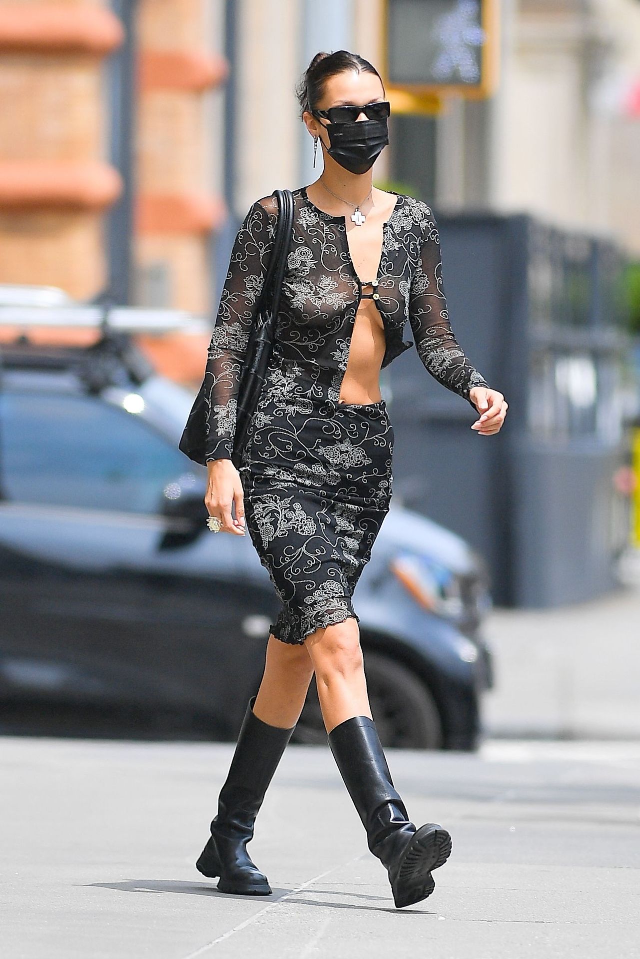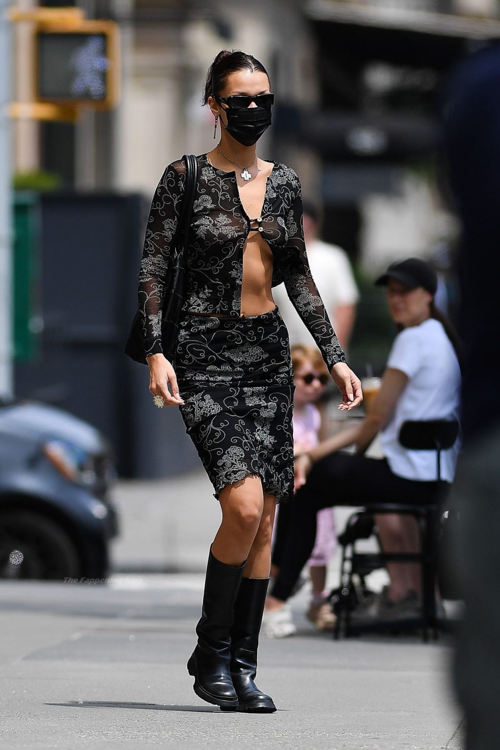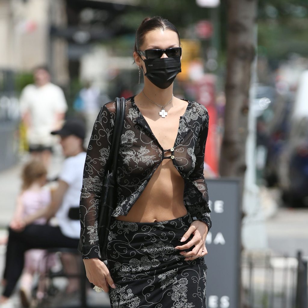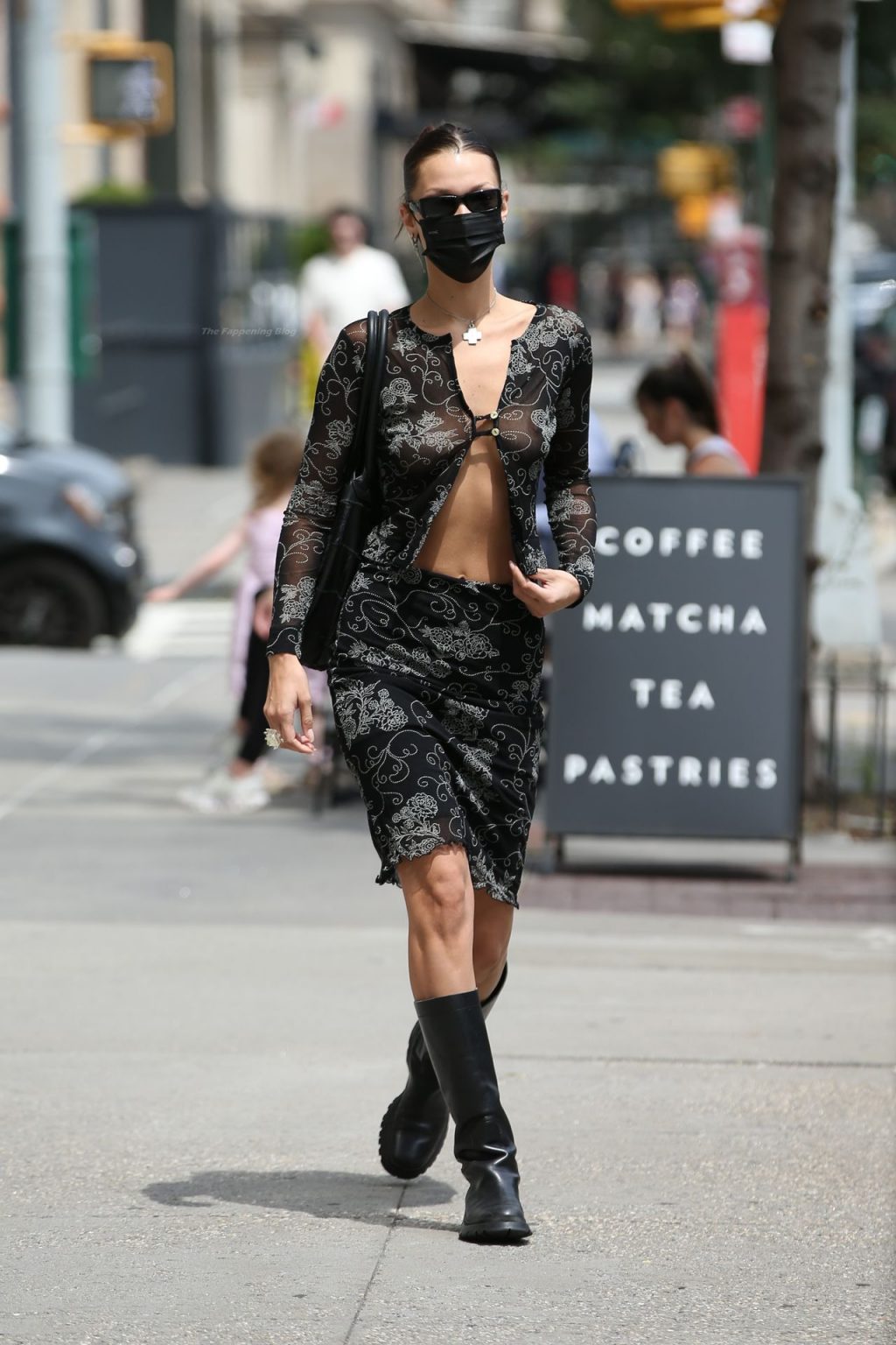 Model Bella Hadid leaves for the airport in New York City, 08/01/2021. She flashes more than just midriff as she goes braless in a patterned mesh set.