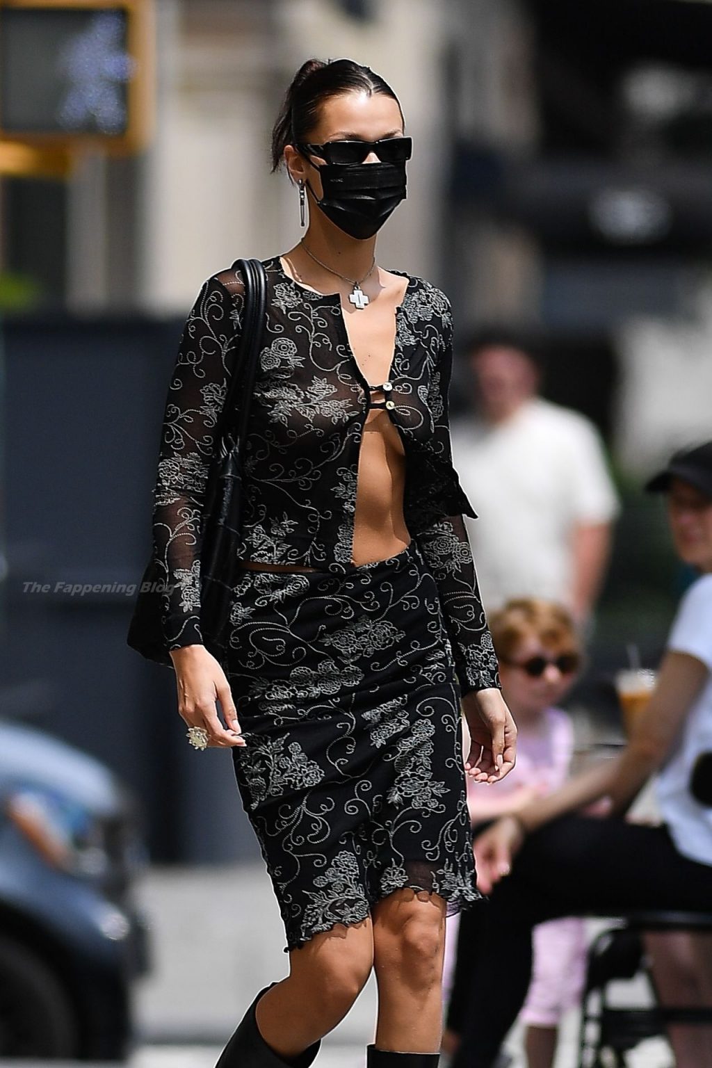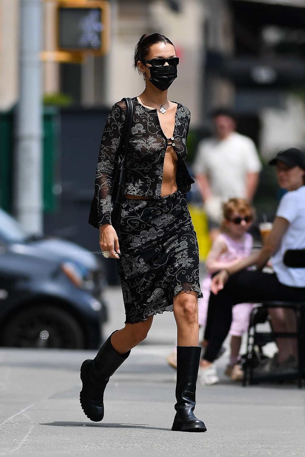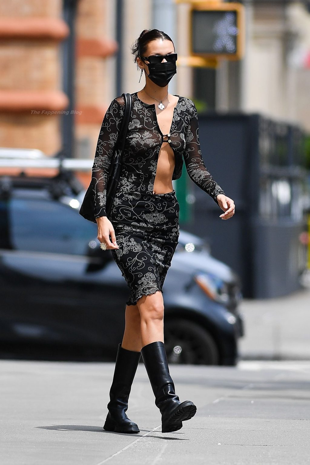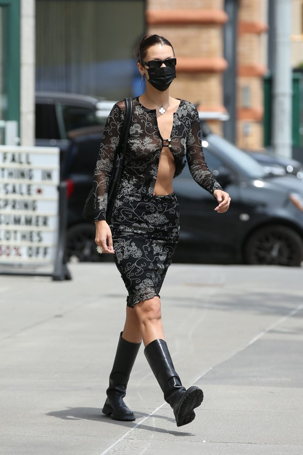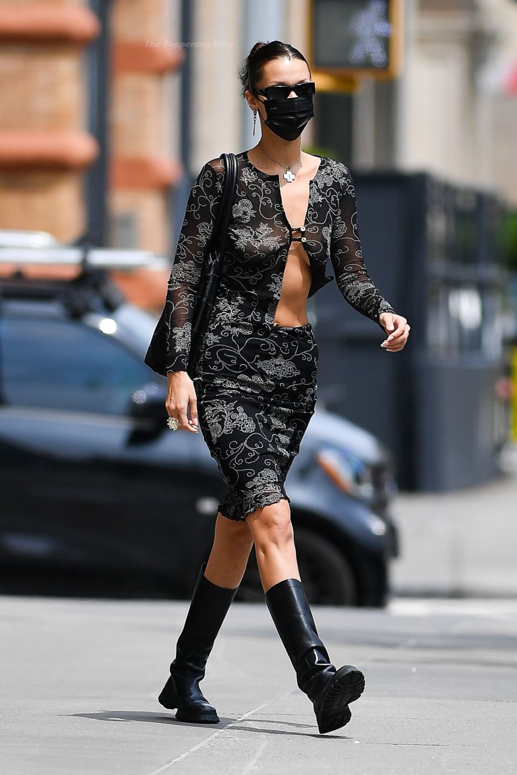 Model Bella Hadid leaves for the airport in New York City, 08/01/2021. She flashes more than just midriff as she goes braless in a patterned mesh set.