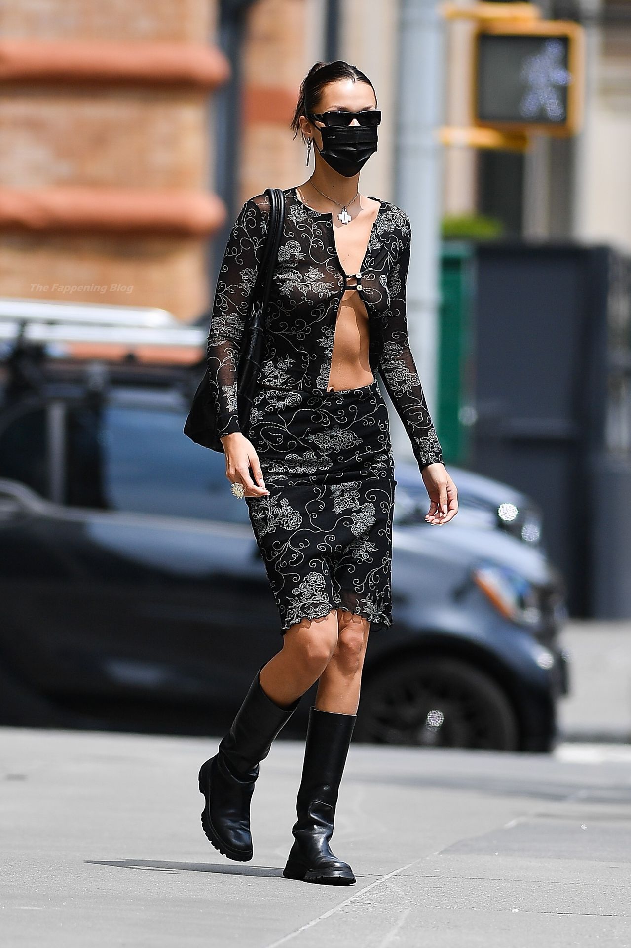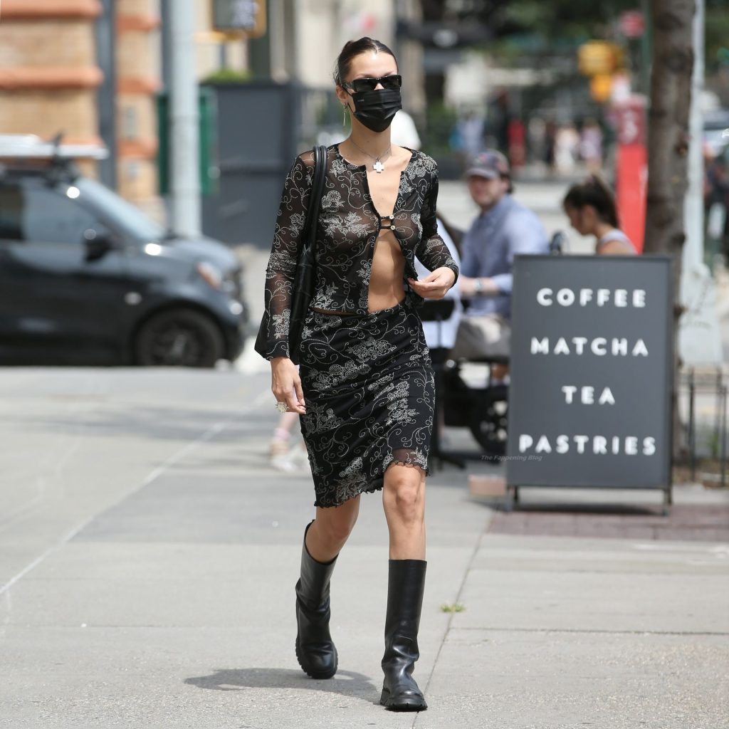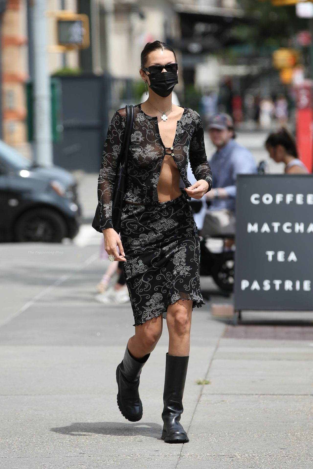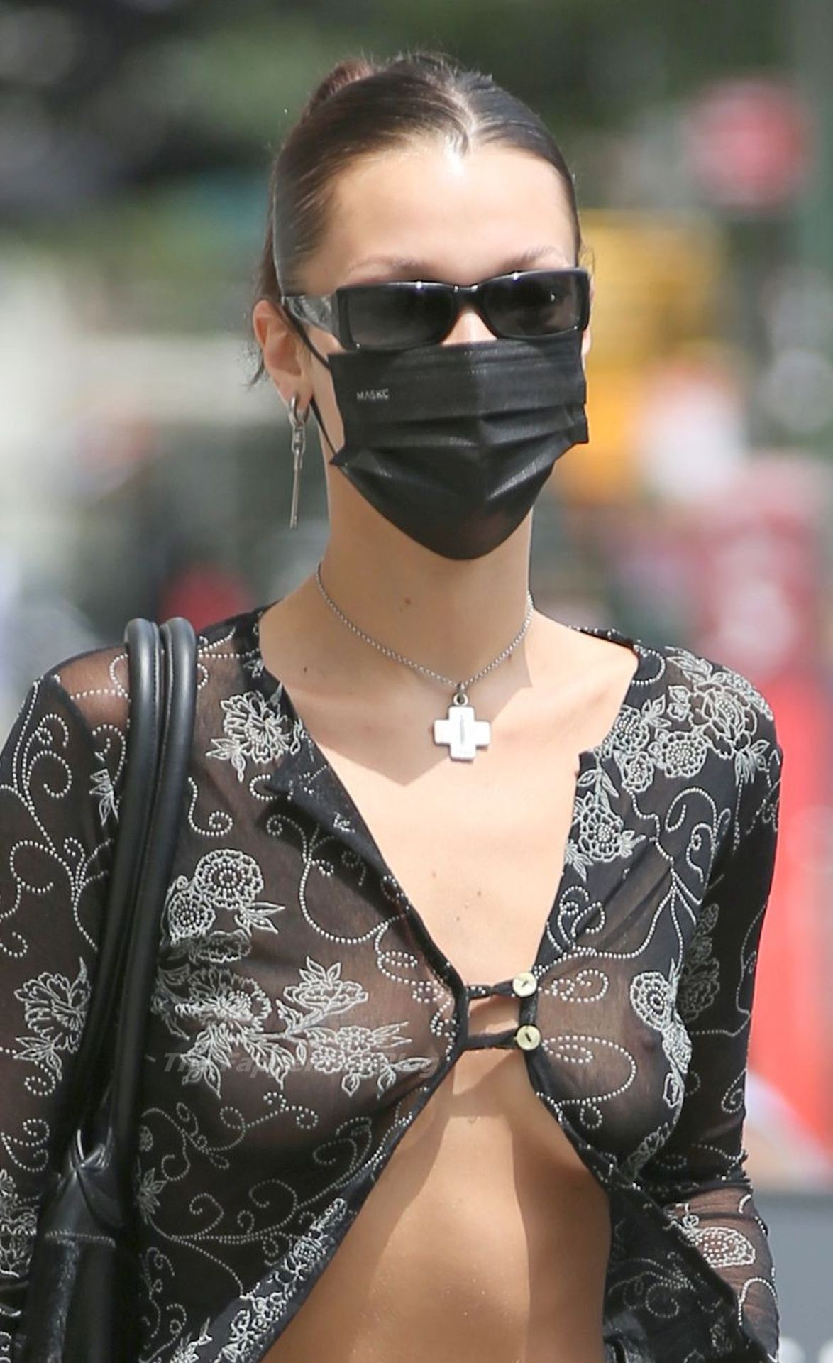 Model Bella Hadid leaves for the airport in New York City, 08/01/2021. She flashes more than just midriff as she goes braless in a patterned mesh set.
