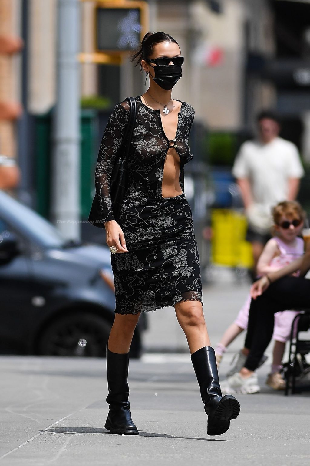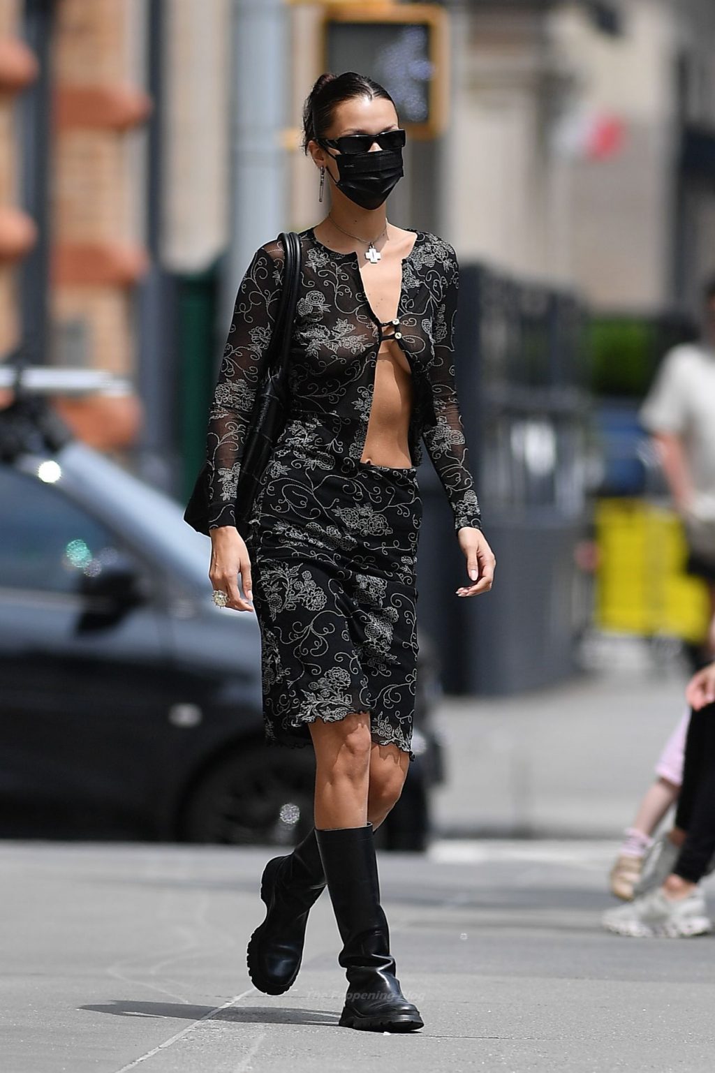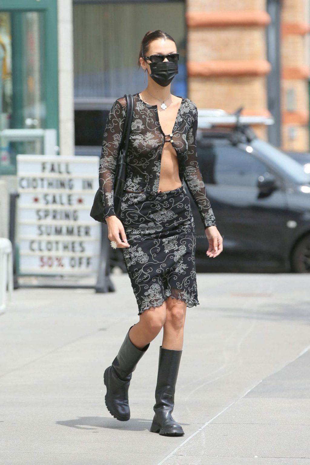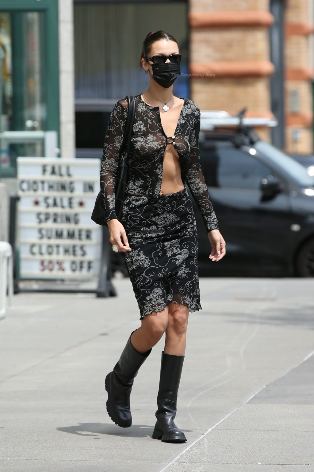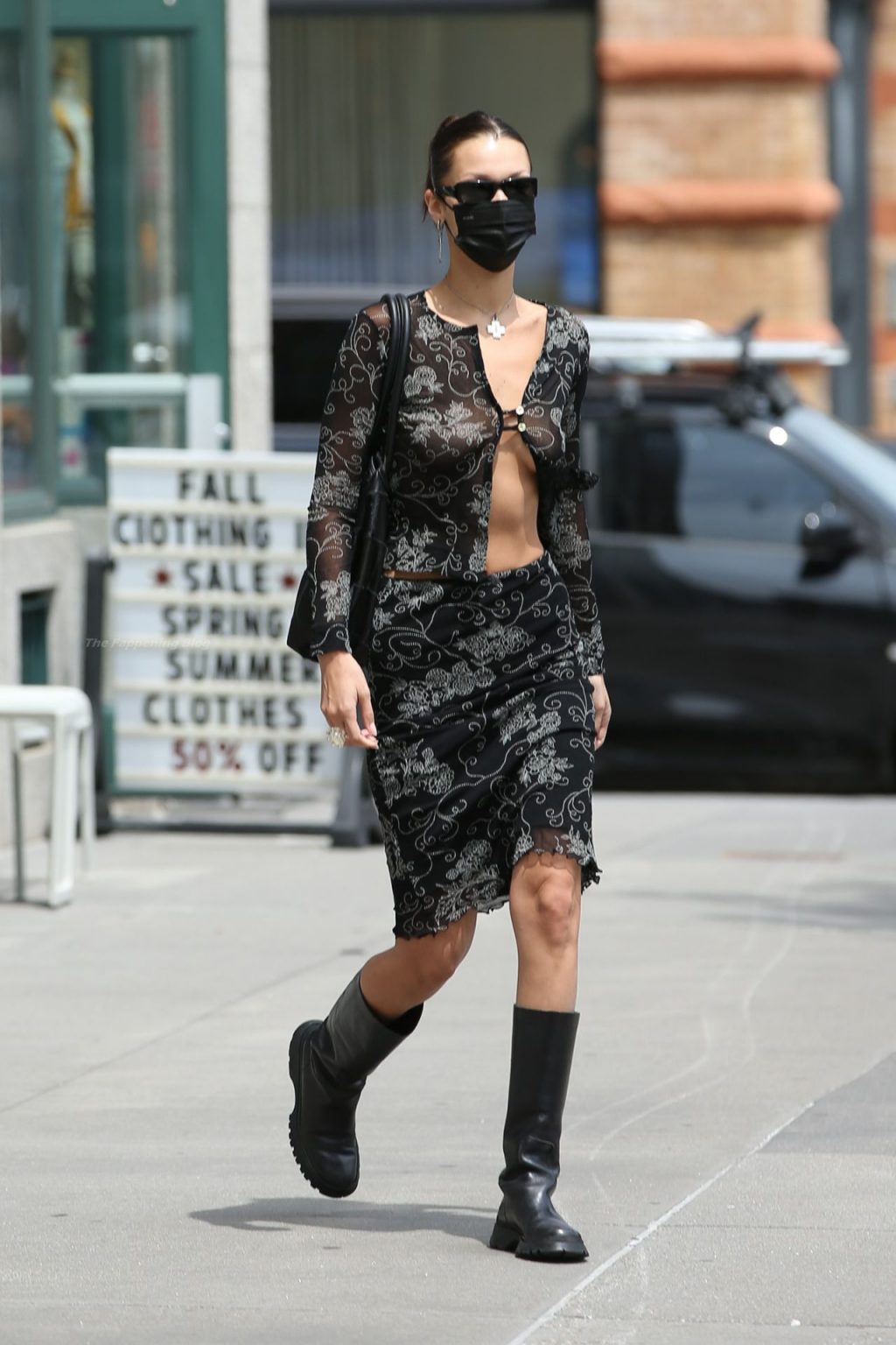 Model Bella Hadid leaves for the airport in New York City, 08/01/2021. She flashes more than just midriff as she goes braless in a patterned mesh set.