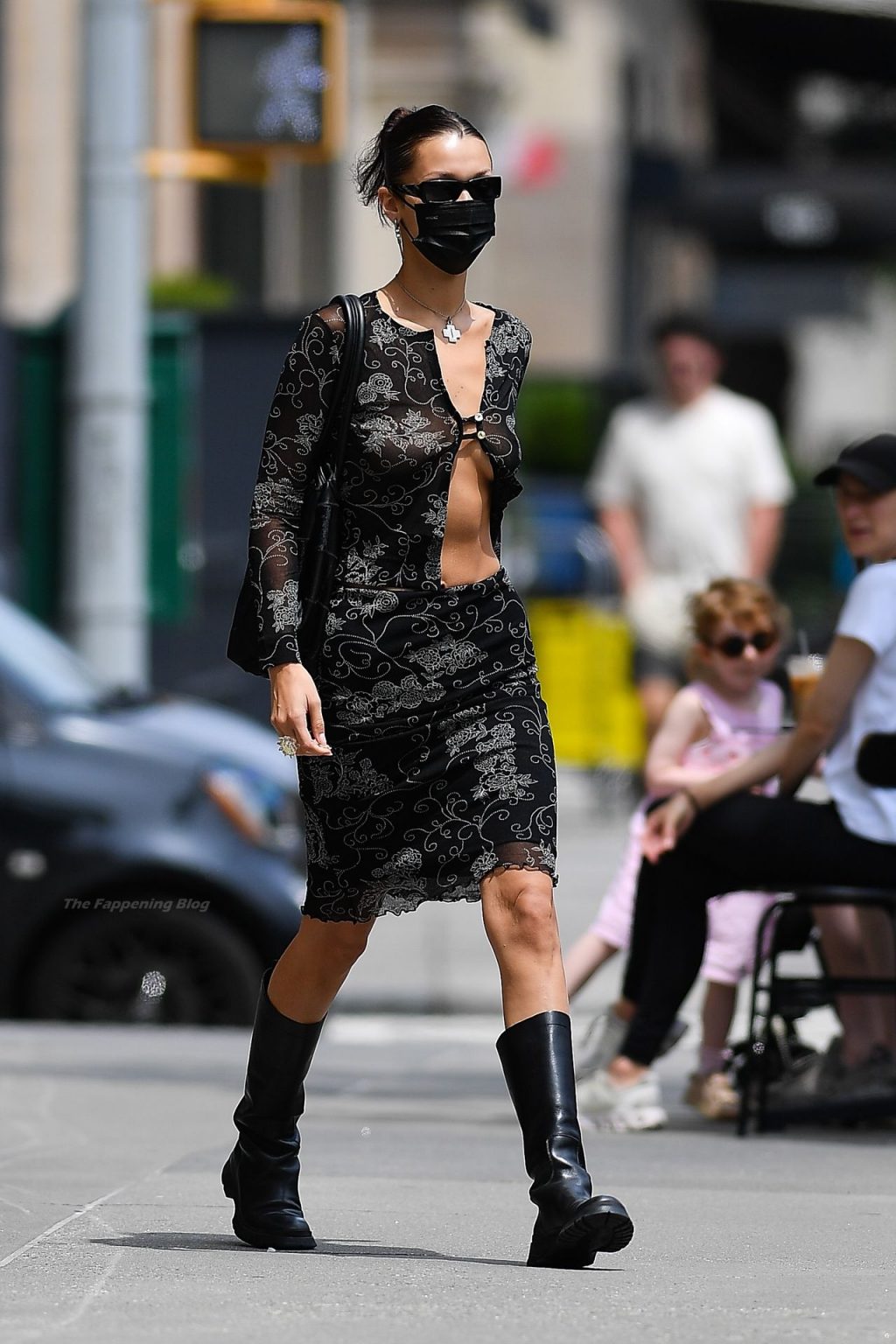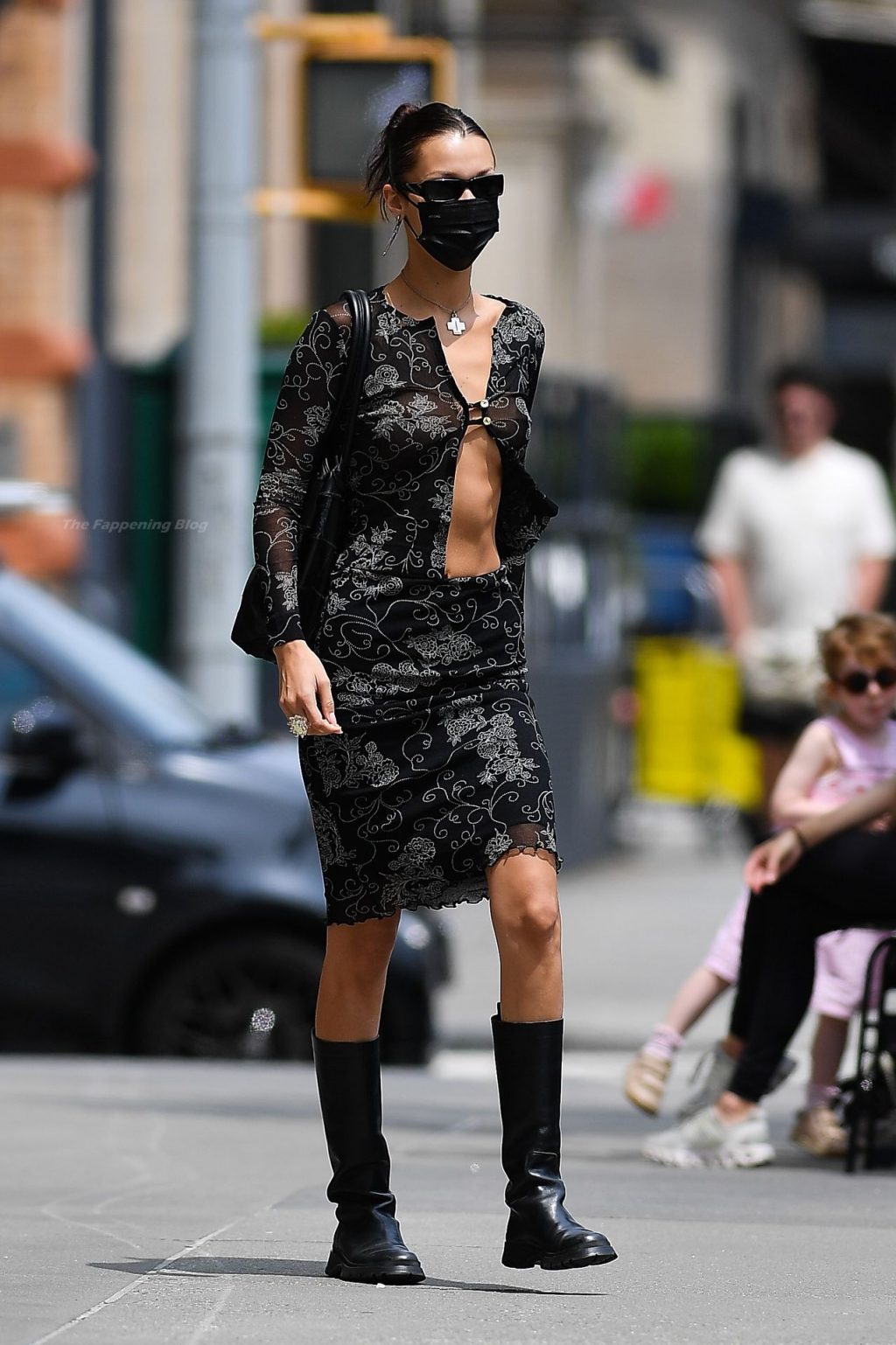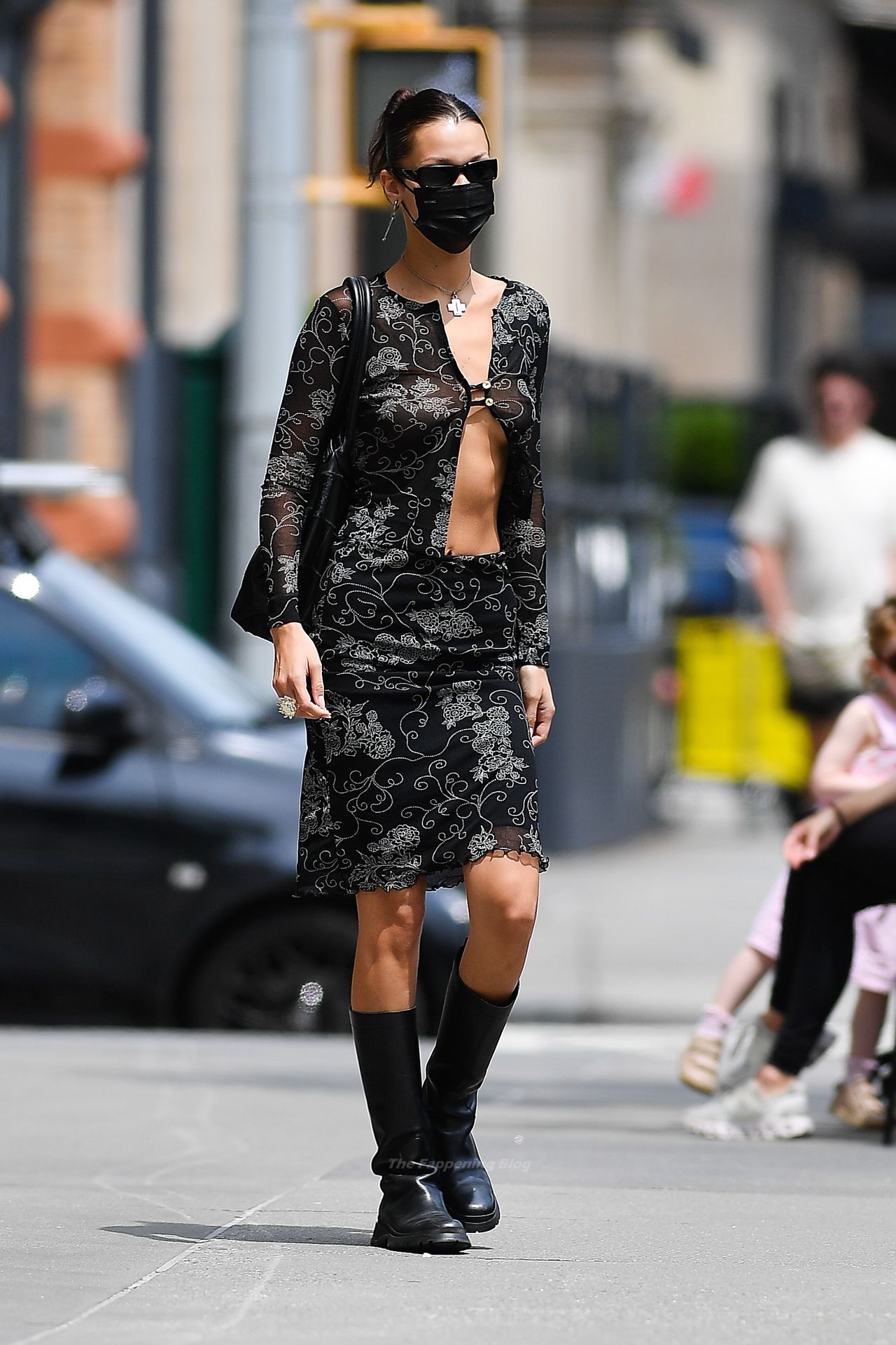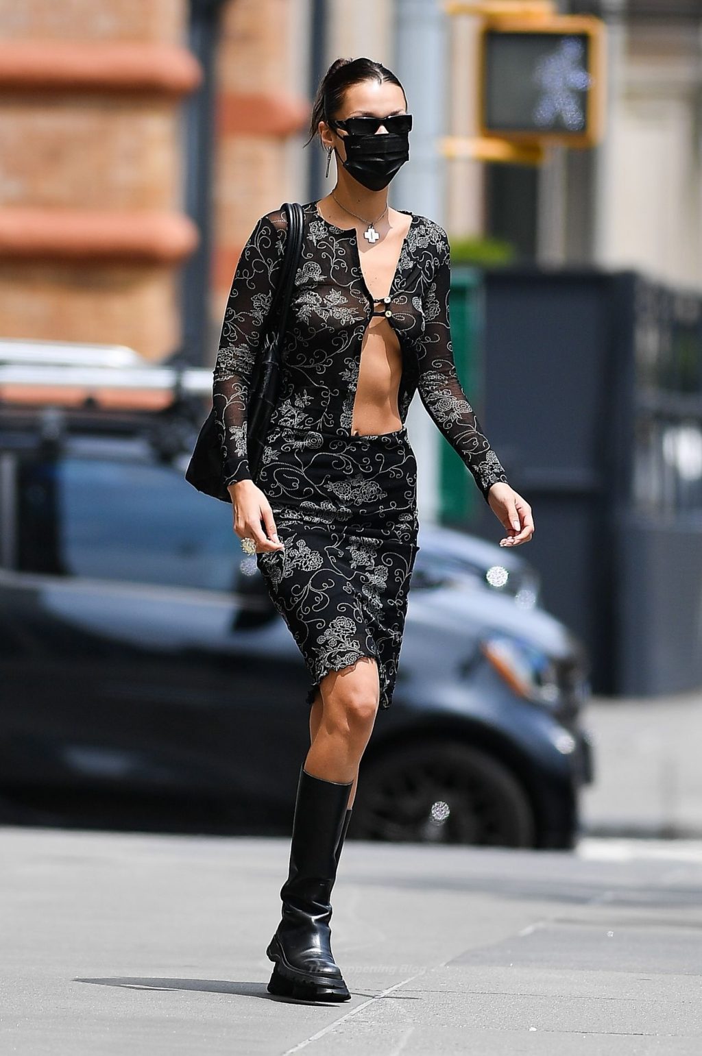 Model Bella Hadid leaves for the airport in New York City, 08/01/2021. She flashes more than just midriff as she goes braless in a patterned mesh set.