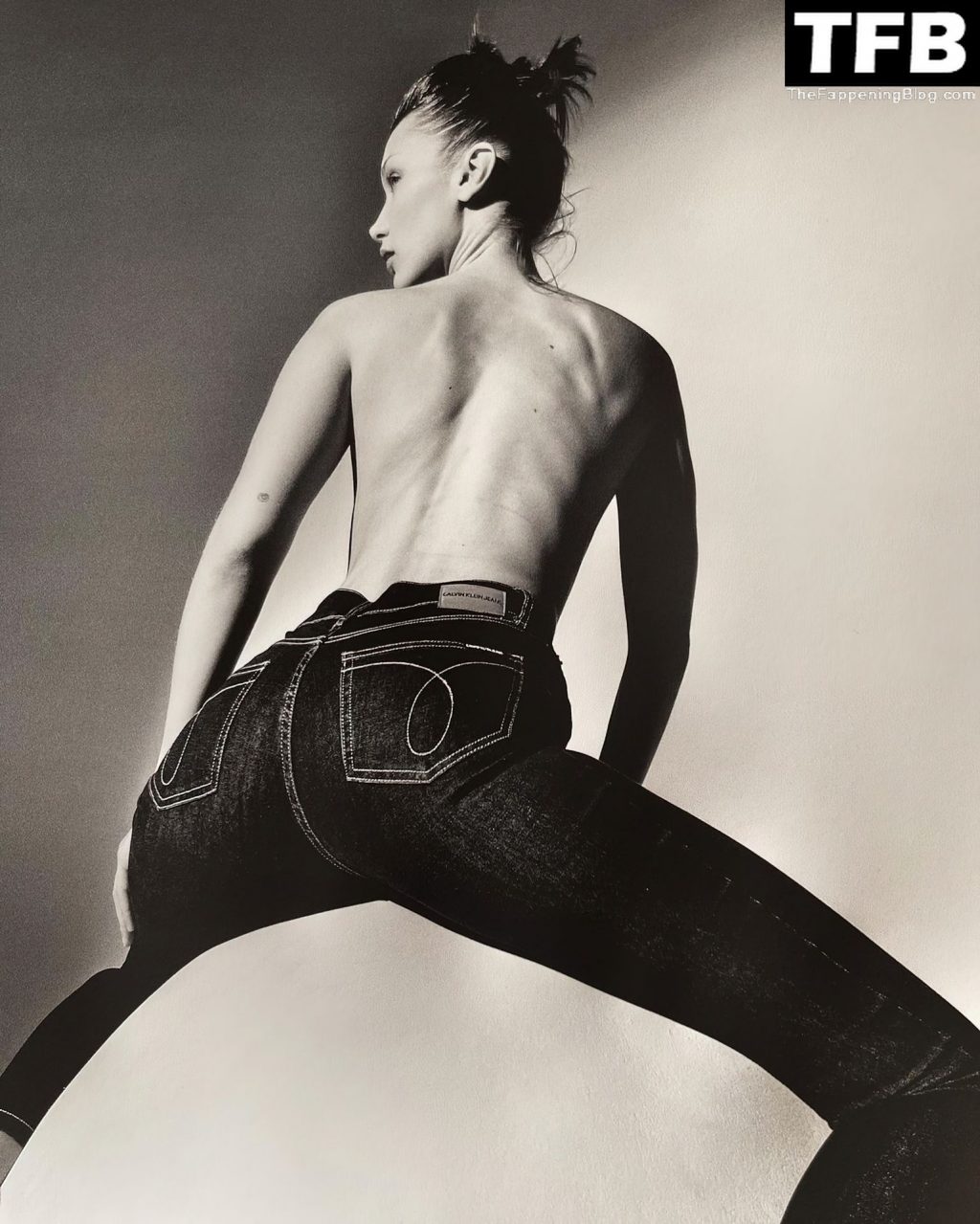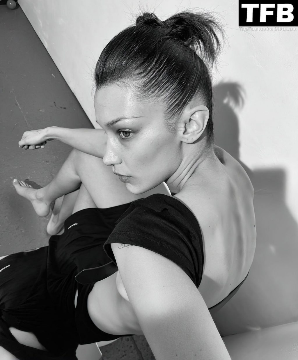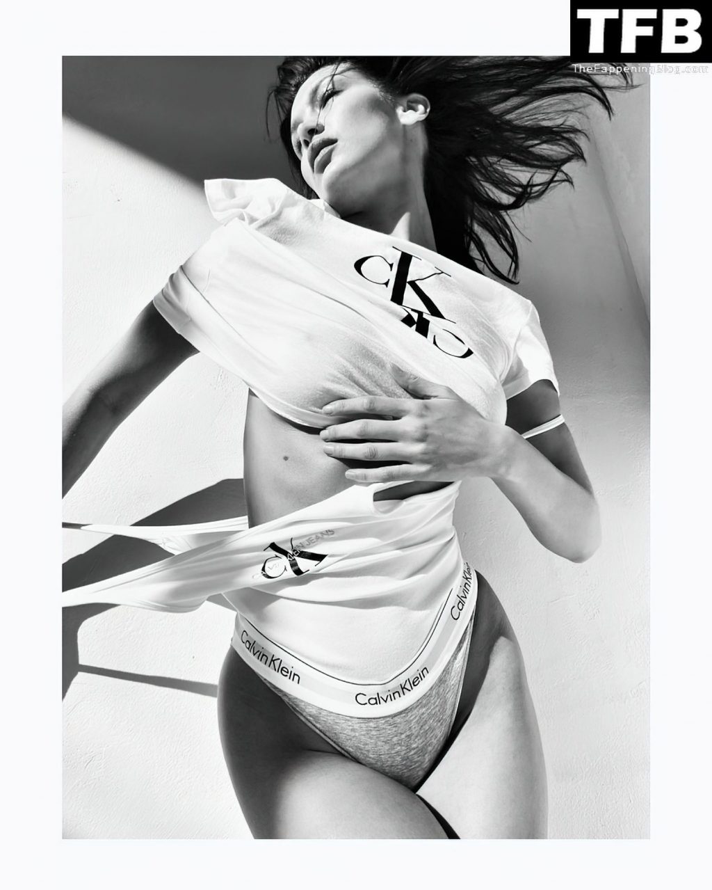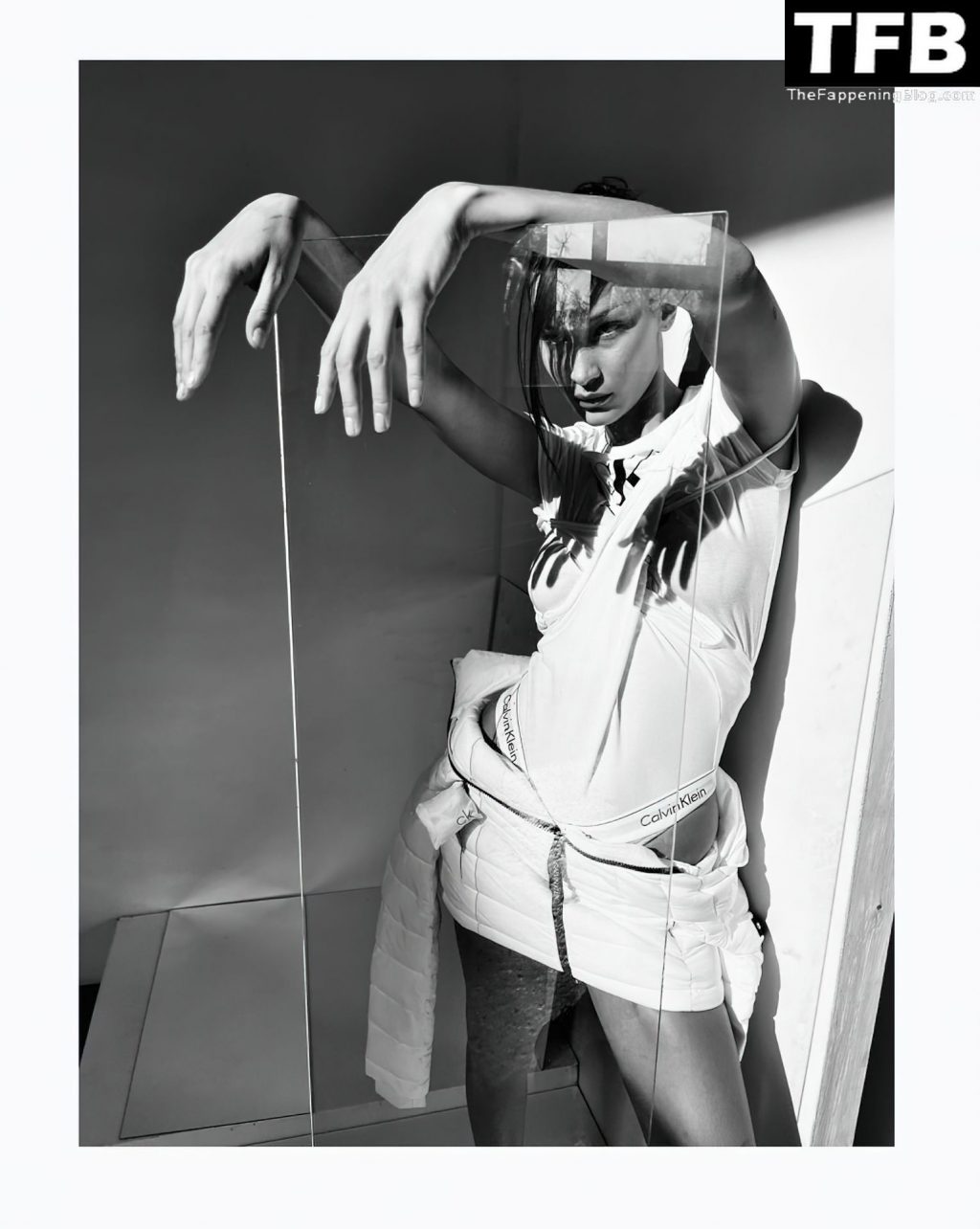 La estrella de la televisión de realidad y modelo Bella Hadid muestra su cuerpo casi desnudo y nos provoca con sus sensuales pechos posando en una sesión fotográfica de Katie Burnett para Calvin Klein (2021).