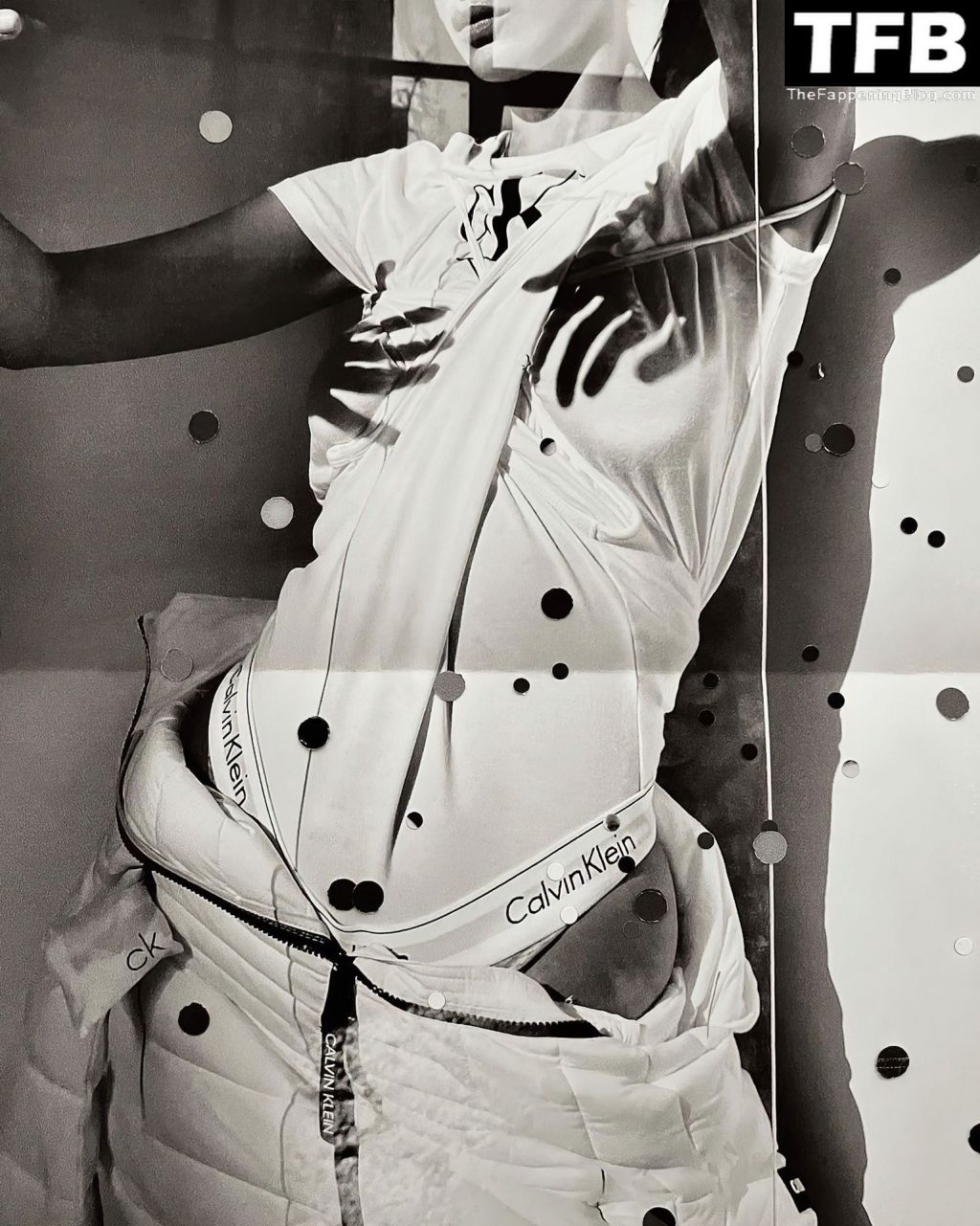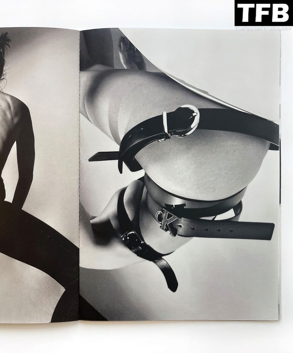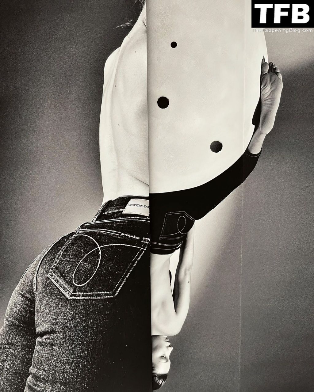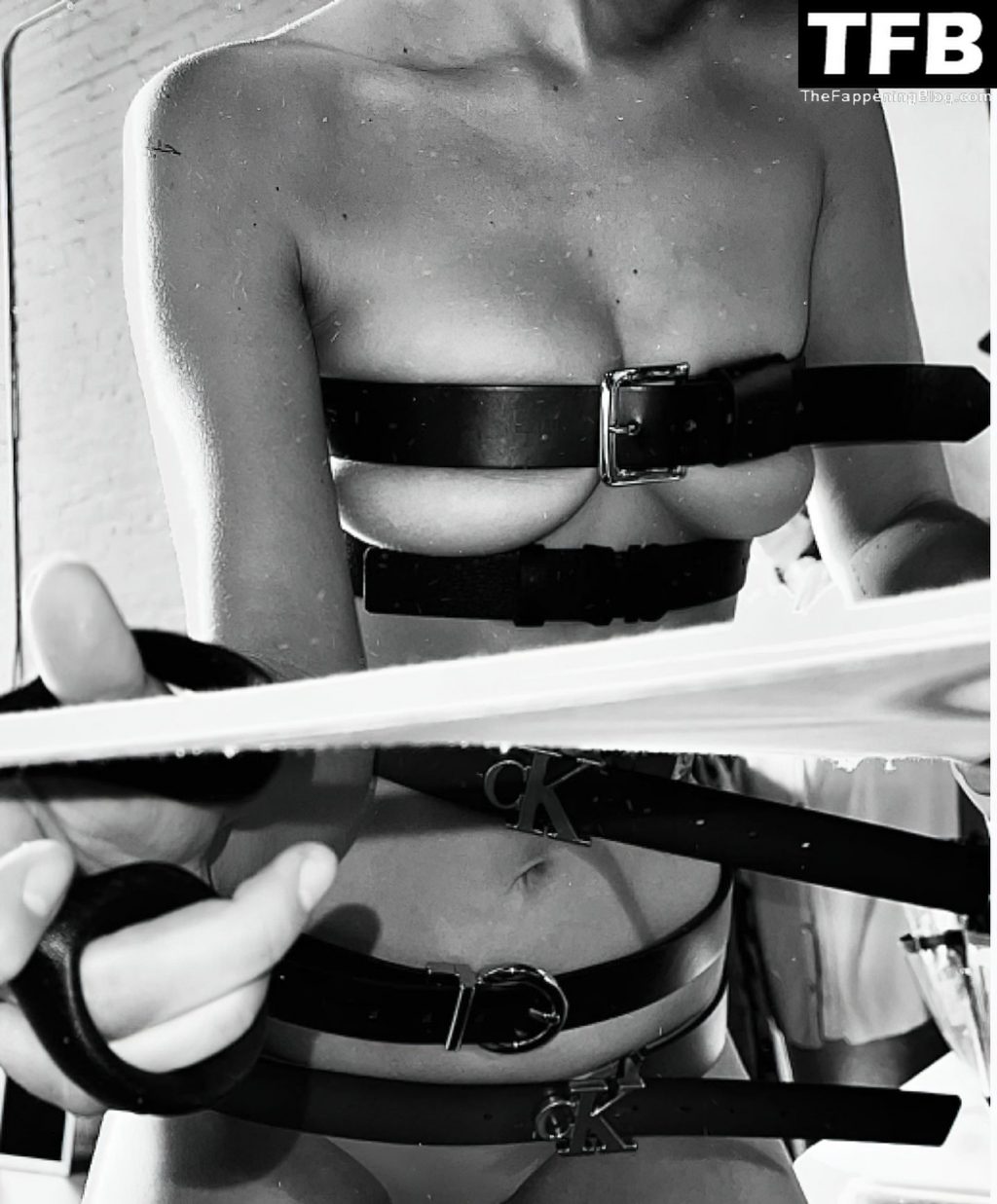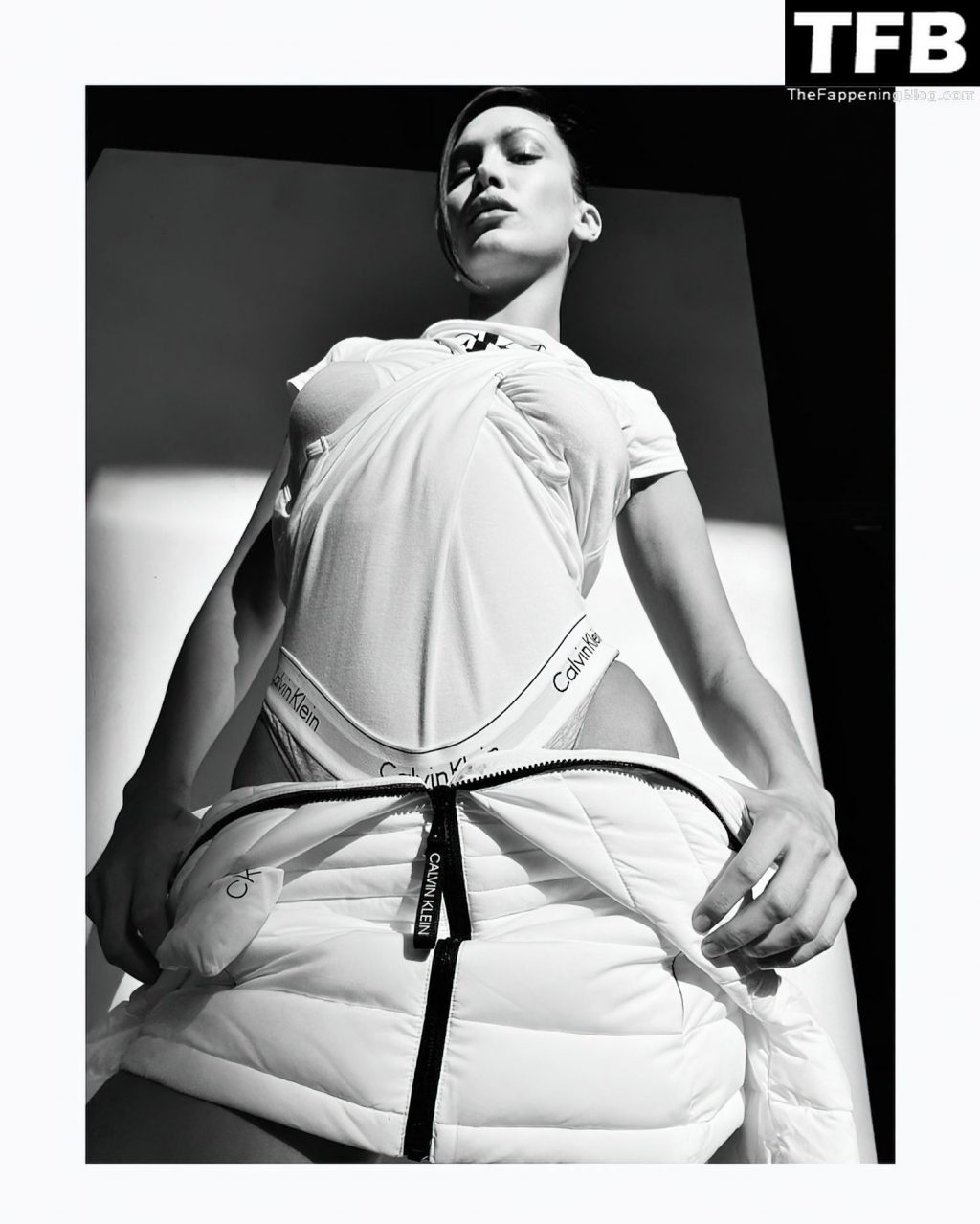 La estrella de la televisión de realidad y modelo Bella Hadid muestra su cuerpo casi desnudo y nos provoca con sus sensuales pechos posando en una sesión fotográfica de Katie Burnett para Calvin Klein (2021).