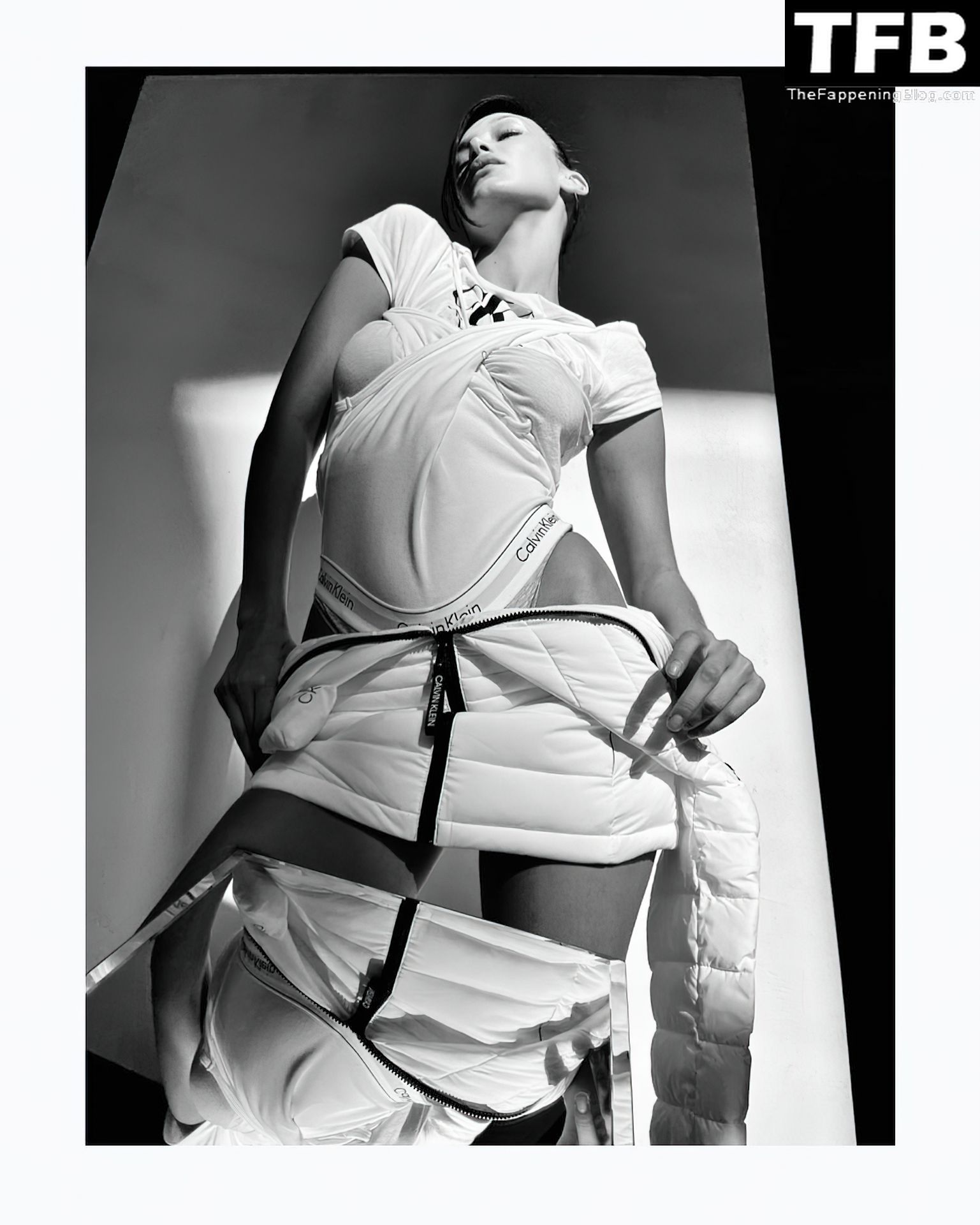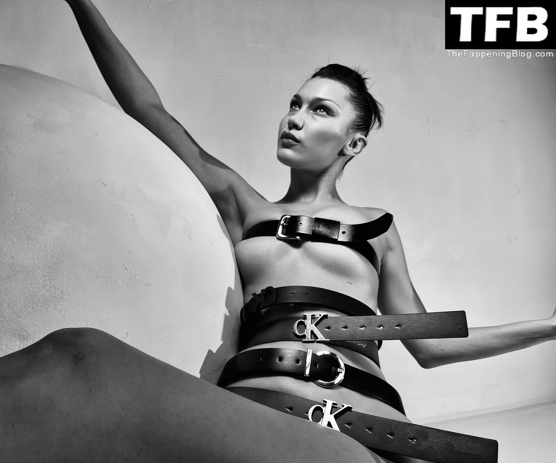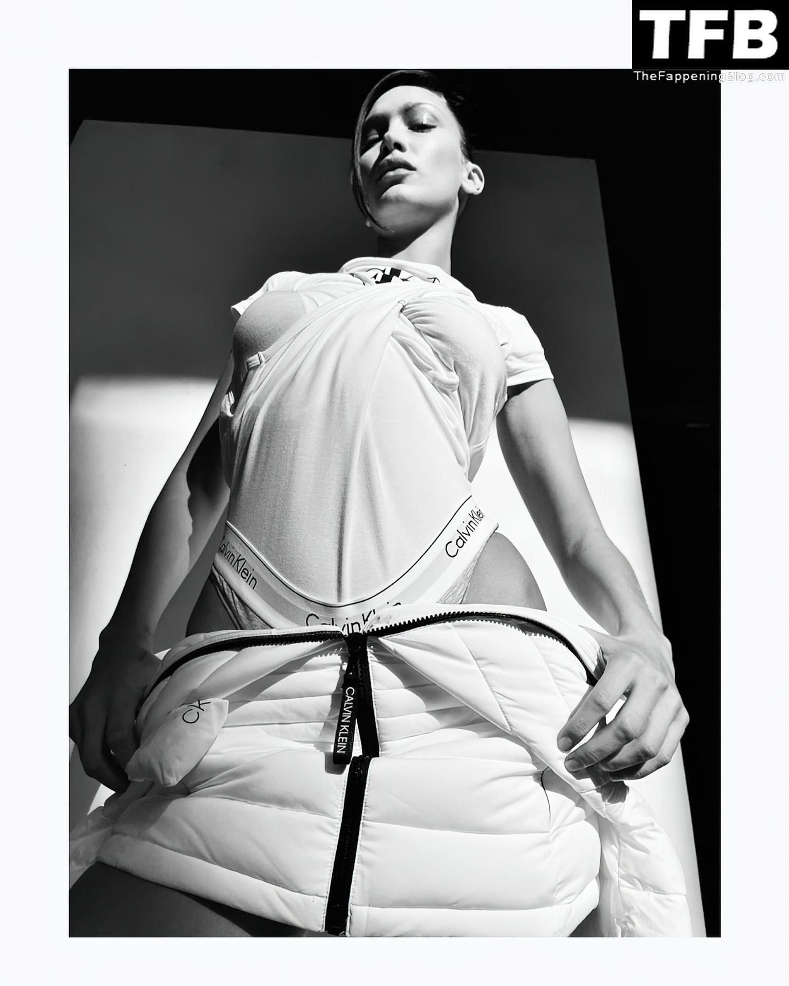 La estrella de la televisión de realidad y modelo Bella Hadid muestra su cuerpo casi desnudo y nos provoca con sus sensuales pechos posando en una sesión fotográfica de Katie Burnett para Calvin Klein (2021).