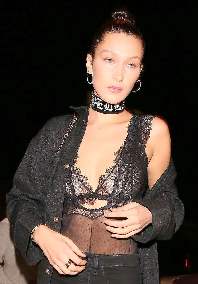 Bella Hadid lleva una blusa transparente mientras salía del restaurante Delilah en West Hollywood, 11/05/2016. Bella Hadid es una modelo estadounidense. Edad: 20 (9 de octubre de 1996).