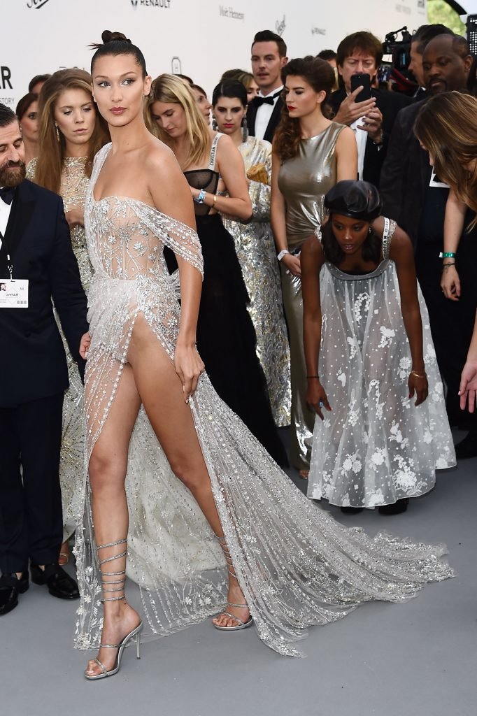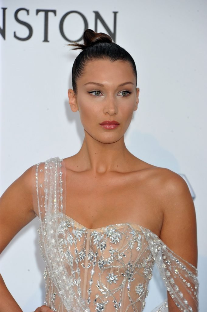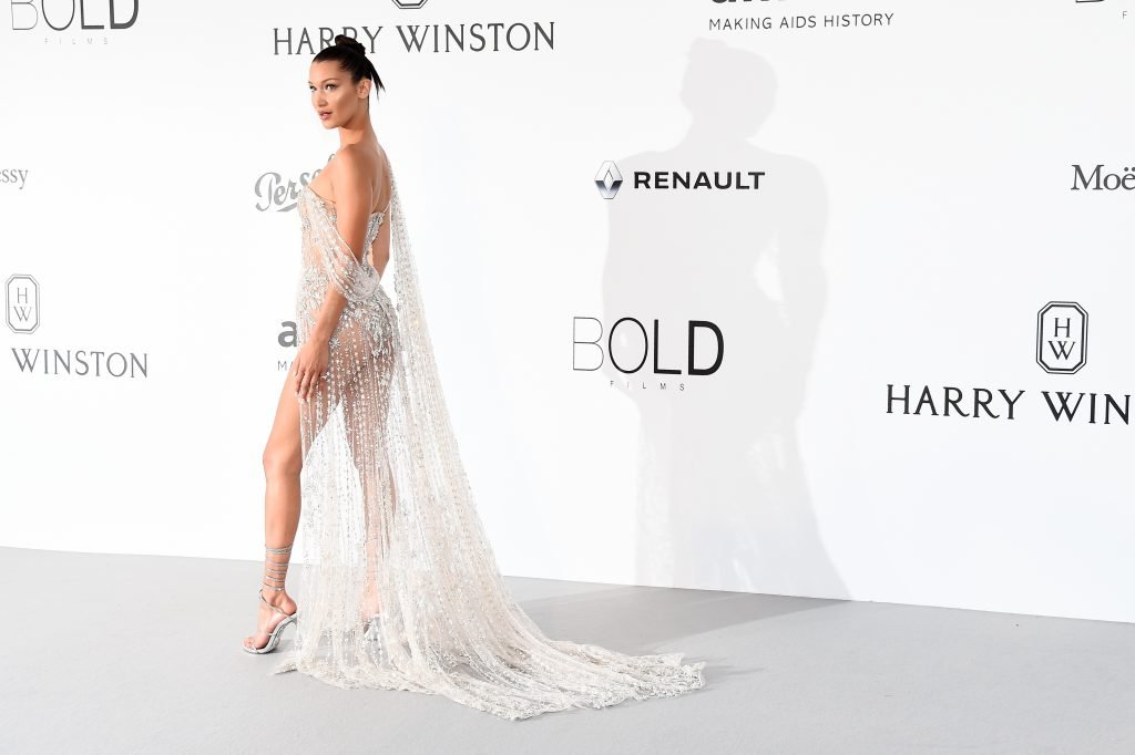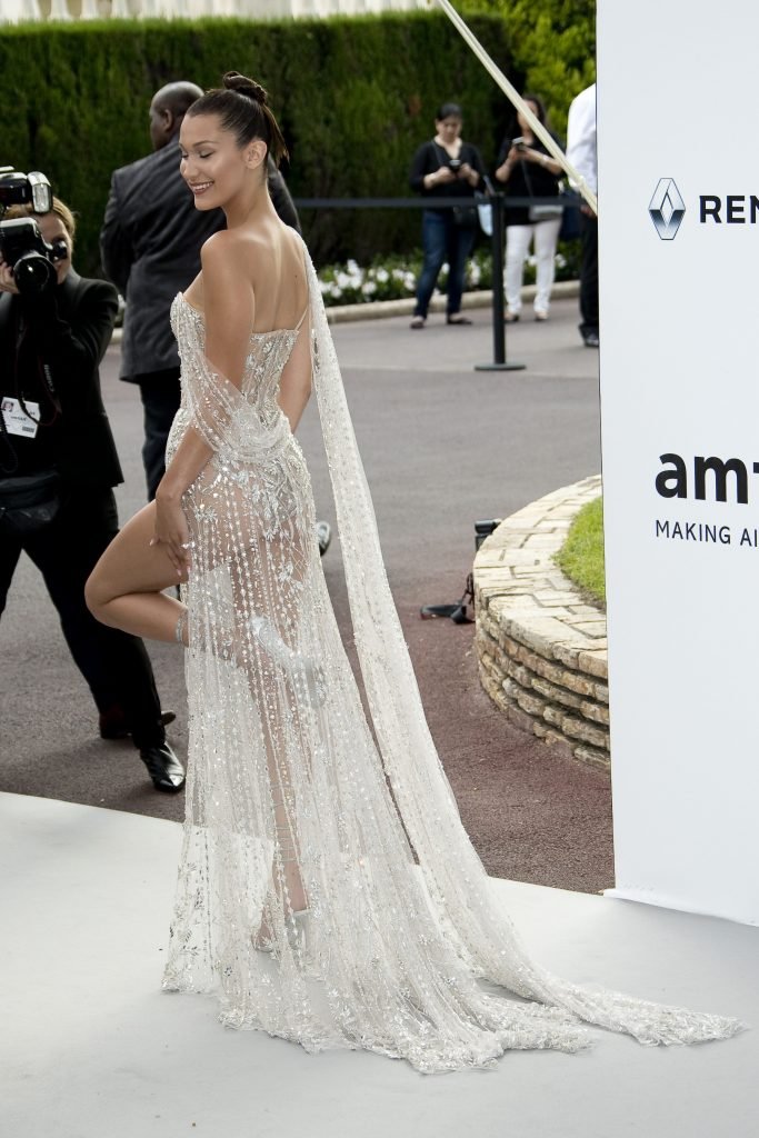 Bella Hadid lleva un vestido blanco transparente en la 24ª Gala de Cine Contra el SIDA de amfAR en el 70º Festival de Cine de Cannes, 25/05/2017. Isabella Hadid es una modelo de moda y actriz estadounidense. Edad – 20 años.