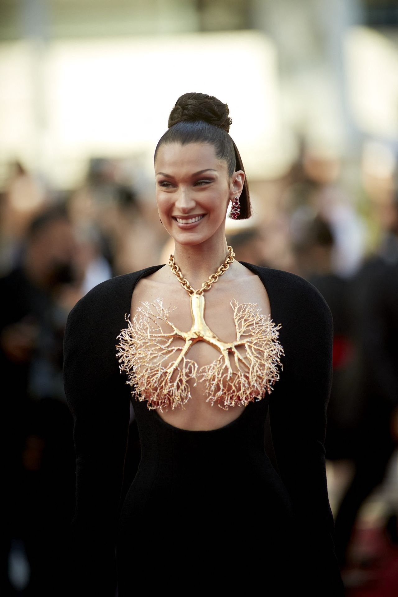 Puedes incluir el nuevo vestido de Bella Hadid de Schiaparelli en la lista de los vestidos más increíbles. En el estreno de la película ‘Tres pisos’, la supermodelo impresionó a absolutamente todos.
