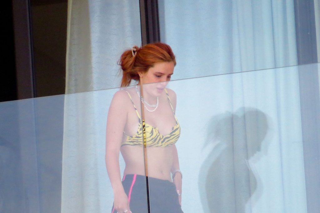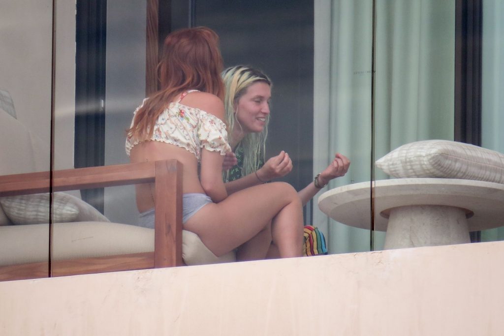 Bella Thorne y Benjamin Mascolo se relajan en el balcón de su hotel con amigos durante unas vacaciones en Cabo San Lucas, México, 15/07/2020. Se puede ver al grupo pasando un cigarro y relajándose después de nadar.