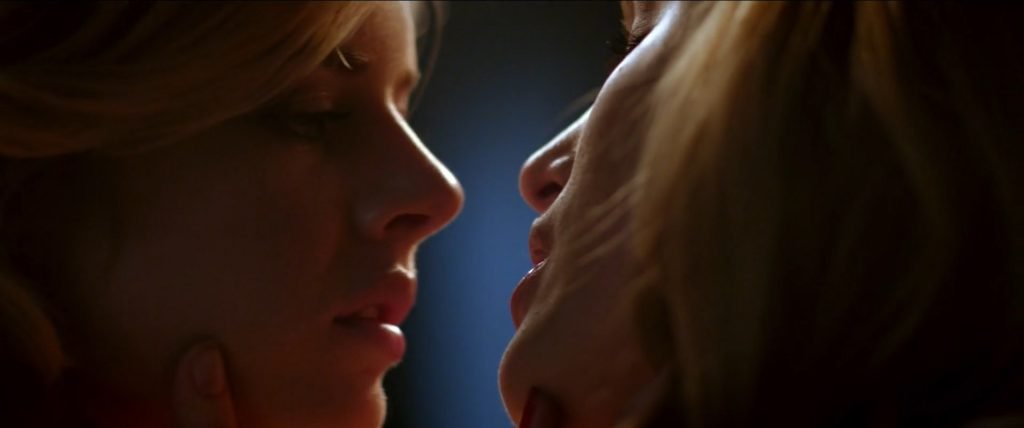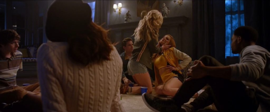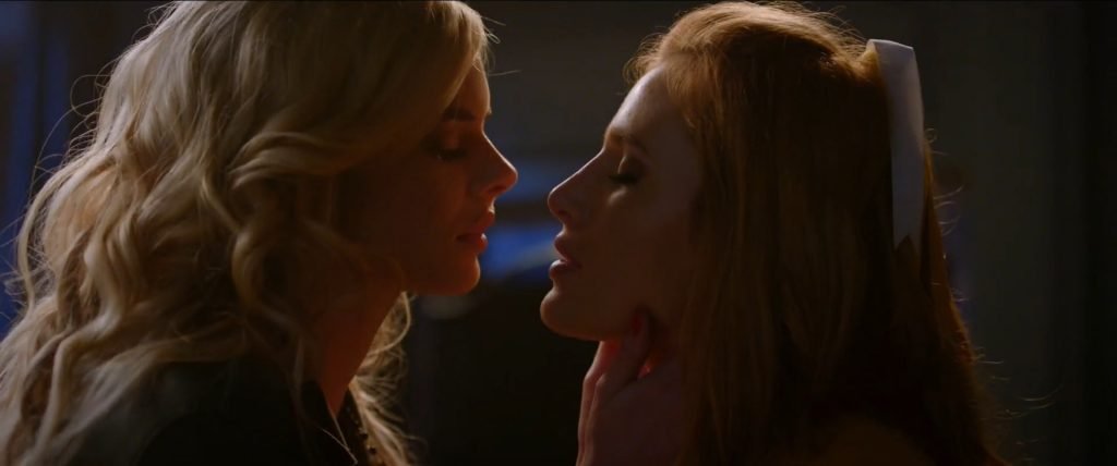 Bella Thorne (como Allison) y Samara Weaving (como Bee) beso lésbico con lengua de The Babysitter (2017).