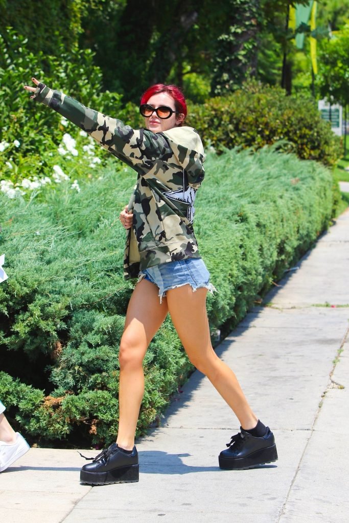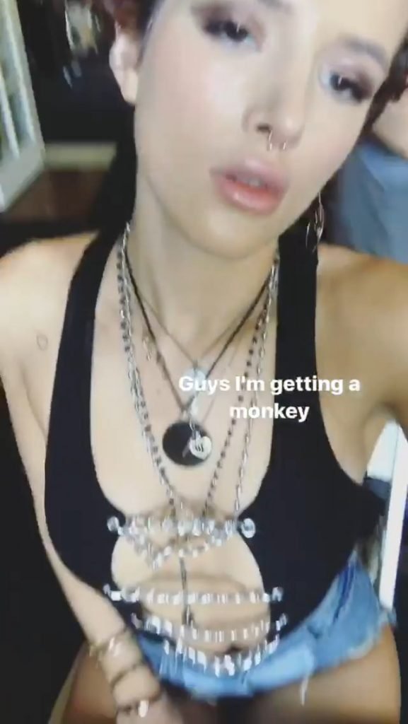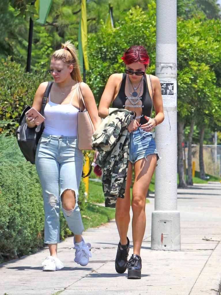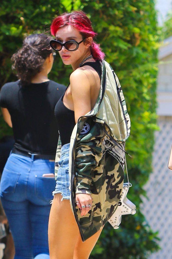 Bella Thorne sin sostén lleva un arriesgado body negro y shorts en Los Ángeles, 07/11/2017. Bella Thorne es modelo, actriz de cine (Be Here Now), cantante, estrella de las redes sociales. Edad: 19.