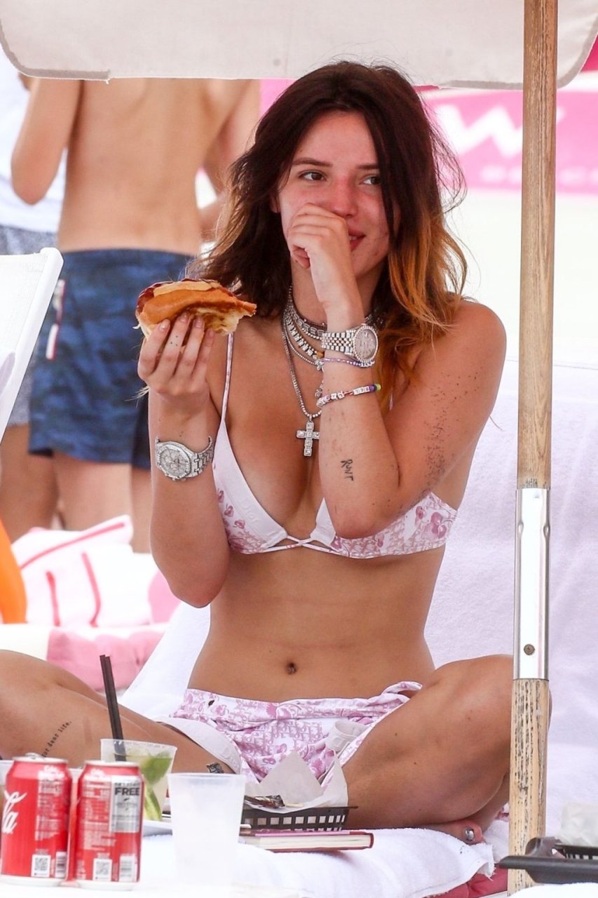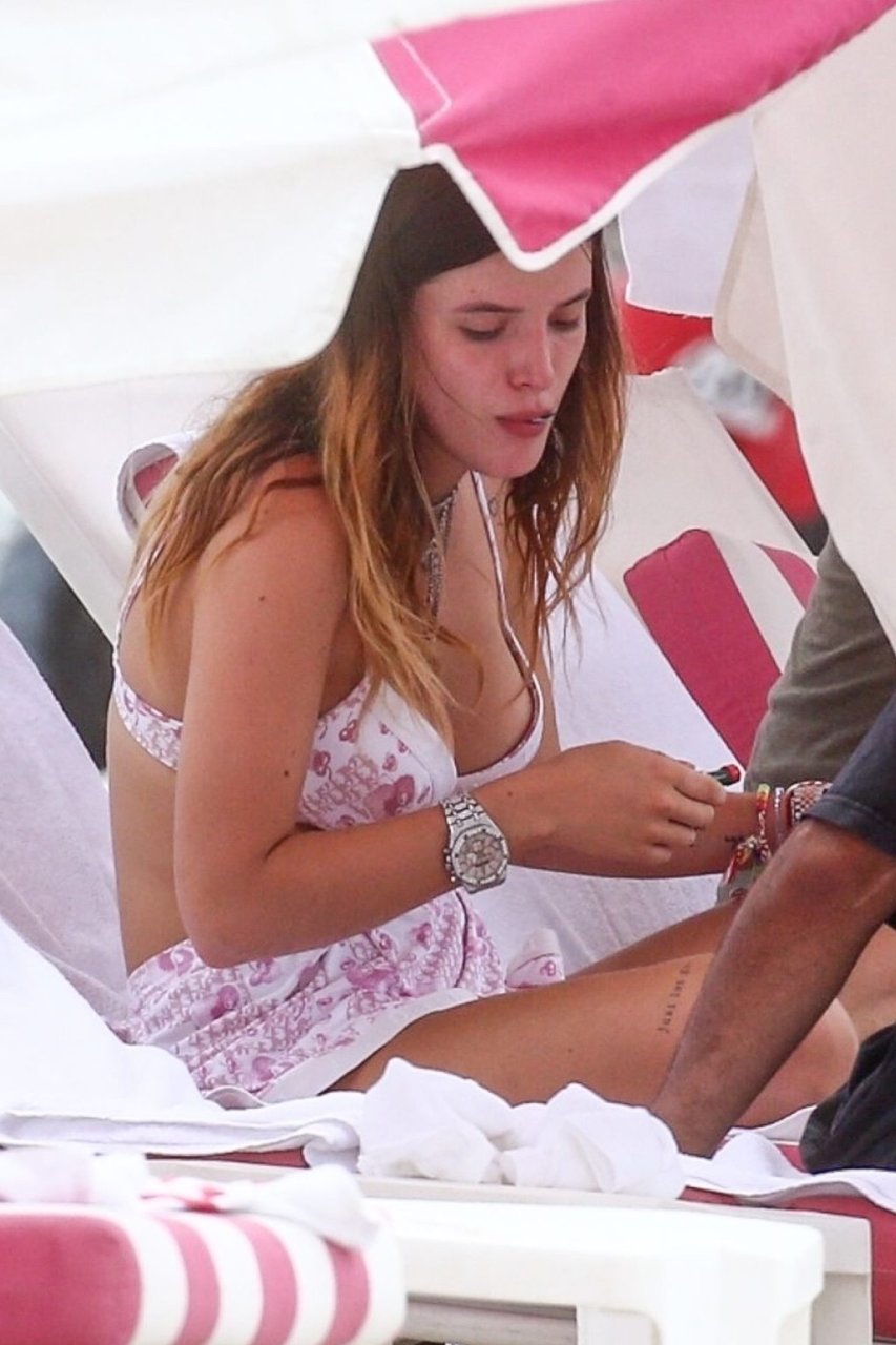 Bella Thorne sufre algunos rasguños mientras intenta sacar a su perro del agua en Miami, 07/08/2019. La actriz/cantante lleva un bikini rosa de Dior durante su tiempo libre con amigos. Ella va a la playa con su propio libro.