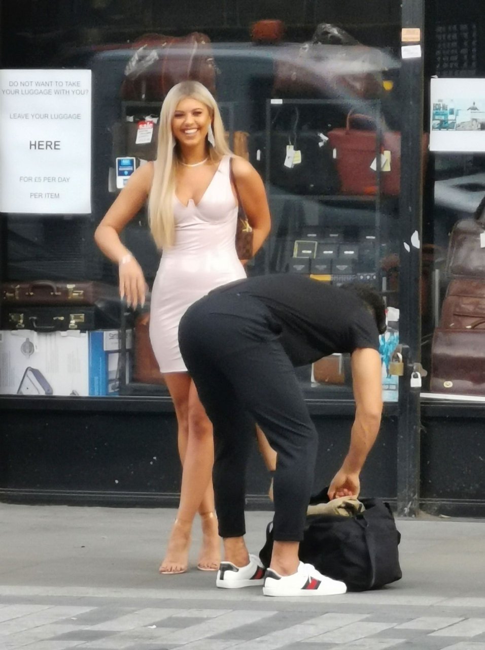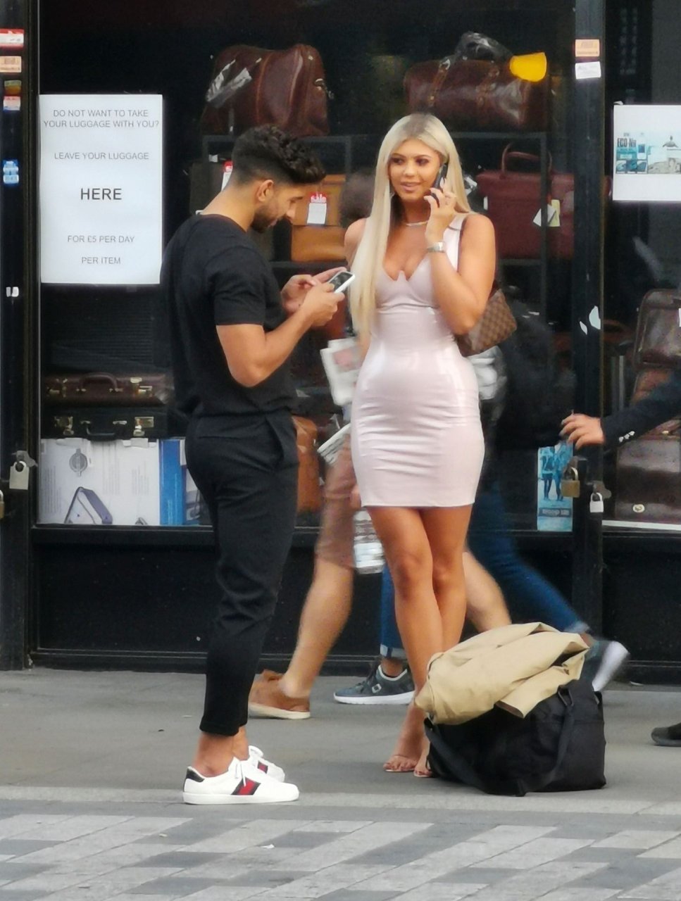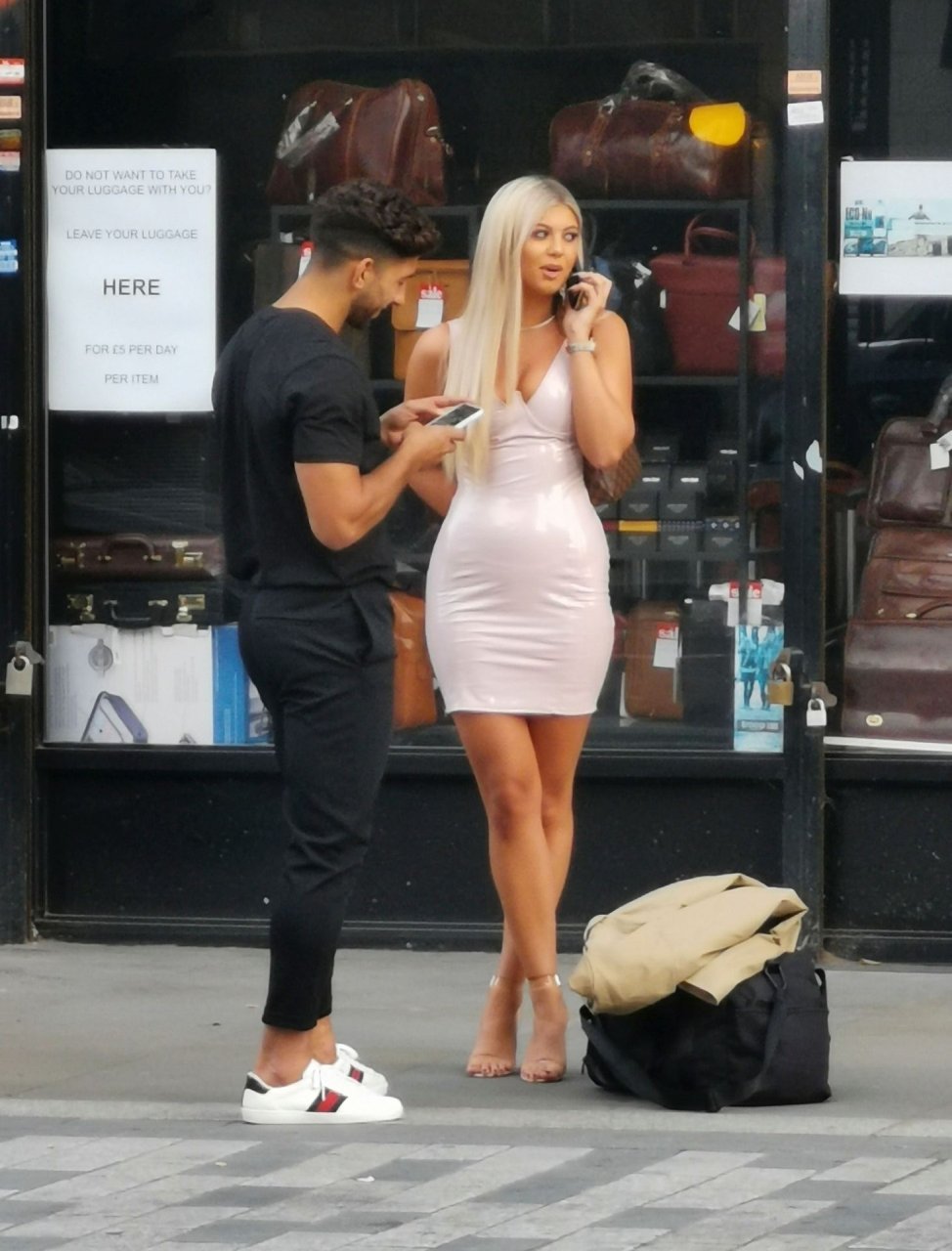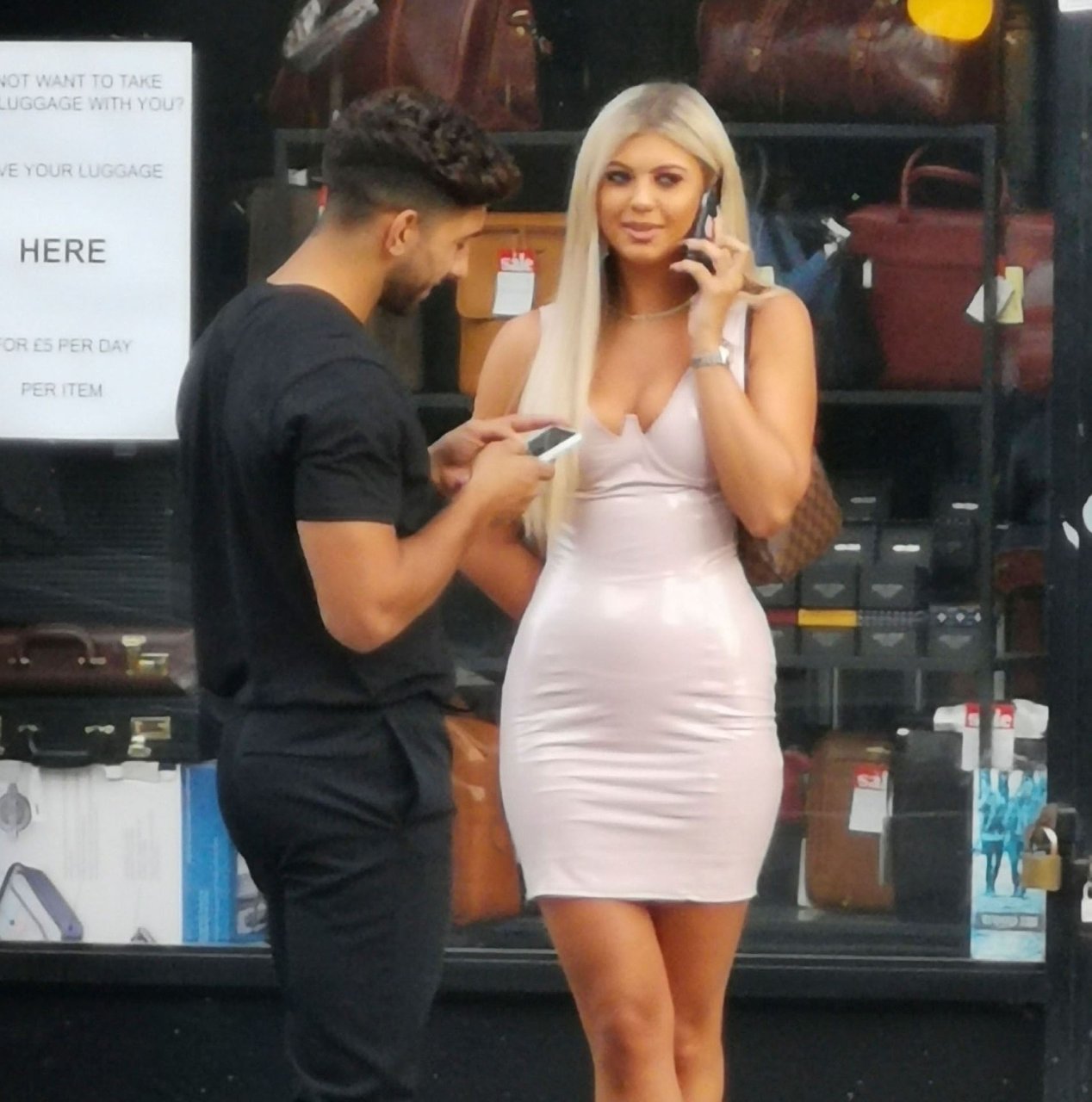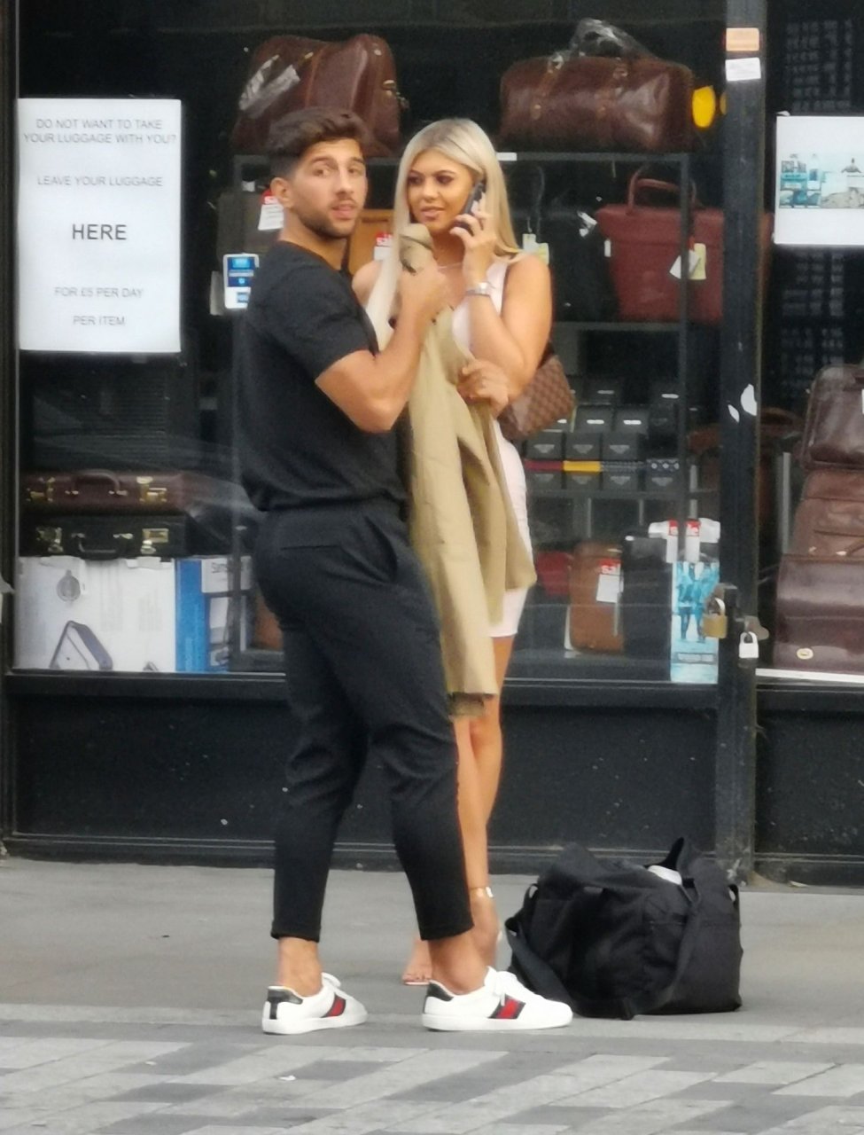 Belle tuvo que pedir ayuda para coser la parte trasera de su vestido y entró en un restaurante para arreglarlo, pero luego salió sonriendo acompañada por su compañero de Love Island, Marvin Brooks.