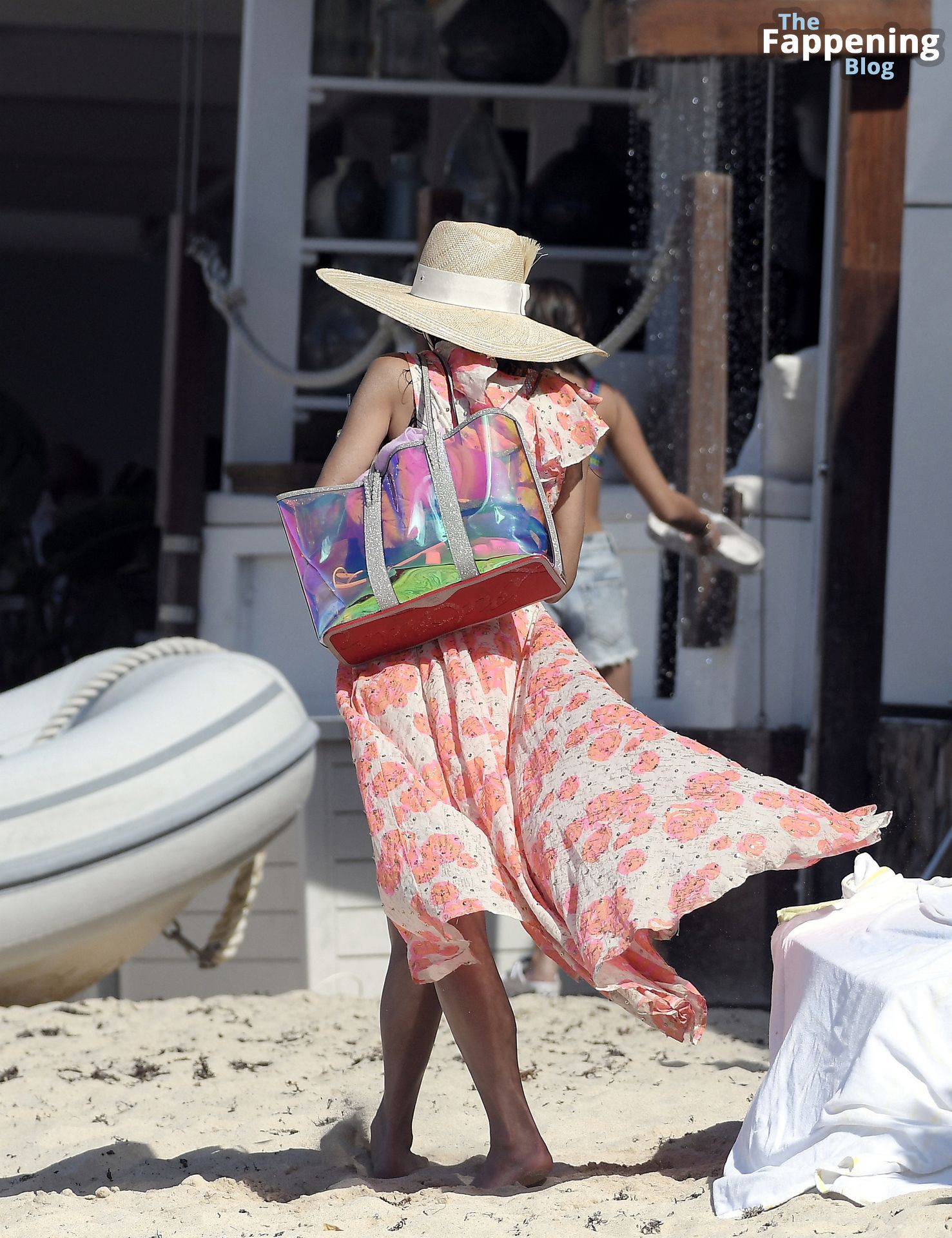 La ex estrella de reality de 52 años lució su famosa figura con un llamativo traje de baño con volantes mientras tomaba el sol y se refrescaba con un baño en el océano. Completó su look con un gran sombrero de paja y una cubierta floral fluida.