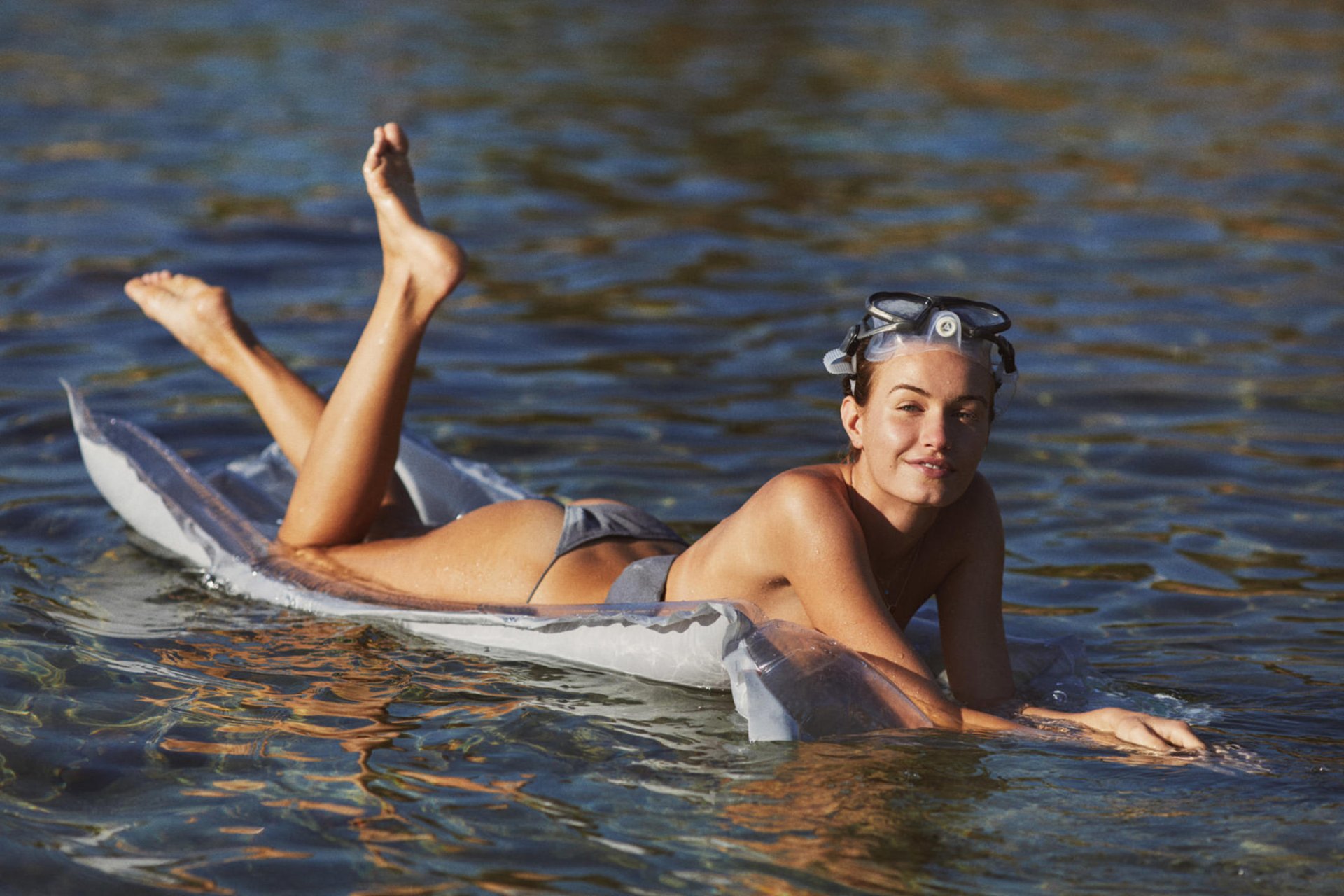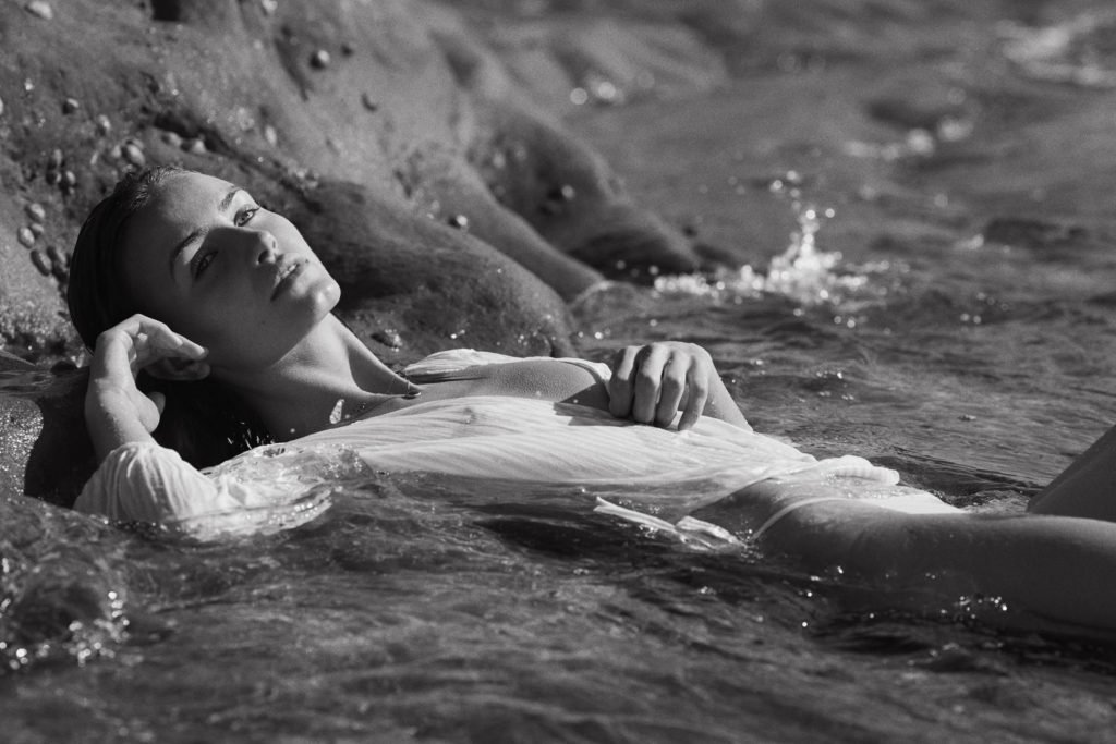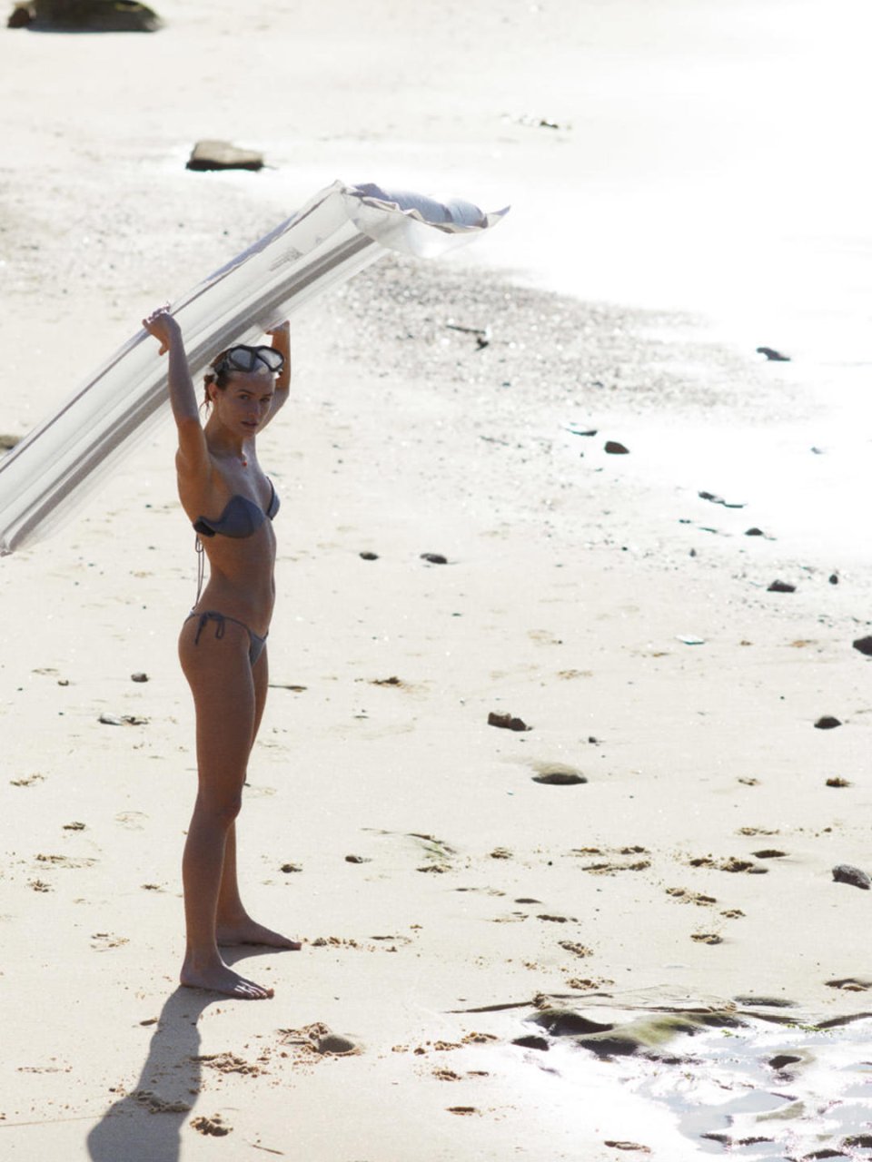 La chica delgada posó desnuda de pecho y en trajes de baño para una sesión de fotos caliente. Mostró sus pequeños pechos, piernas delgadas y bronceadas, y trasero.