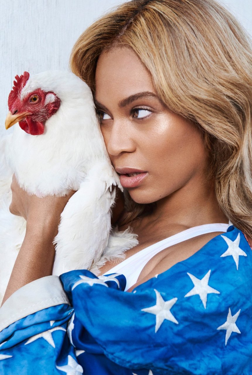 Con ella sosteniendo un pollo, no es la Coronel Sanders, ¡gracias a Dios! Al menos es una belleza asada al horno, con partes rosadas por dentro, apuesto...