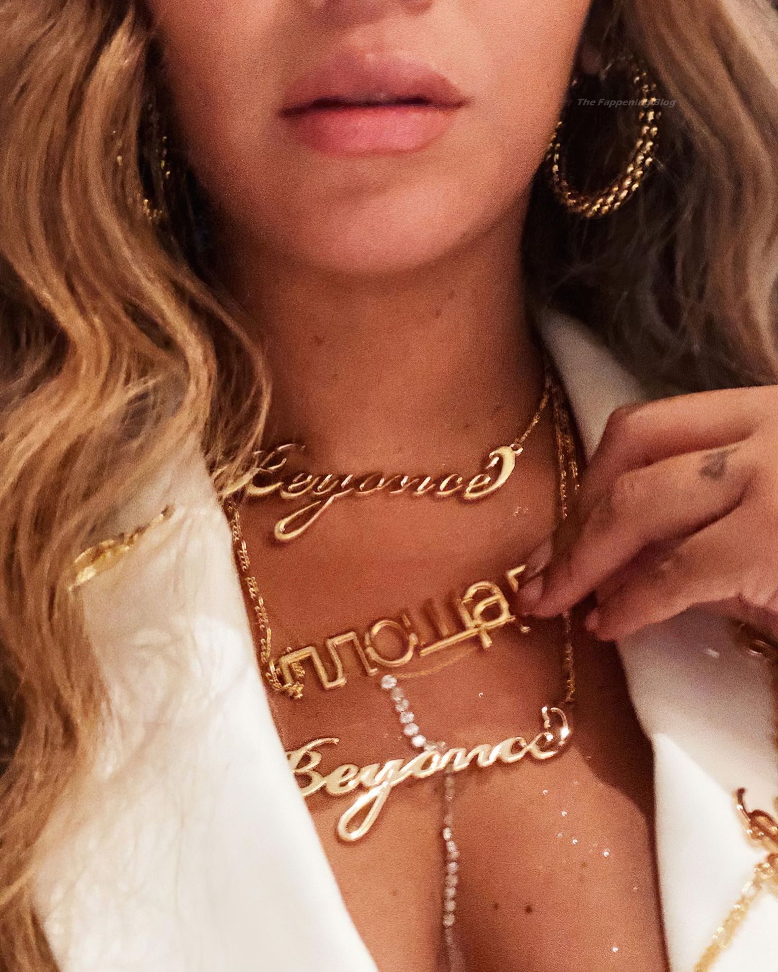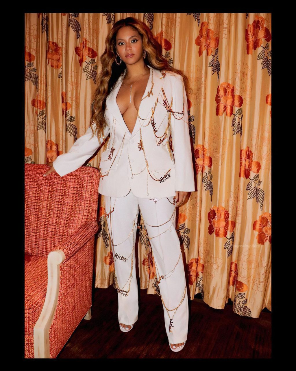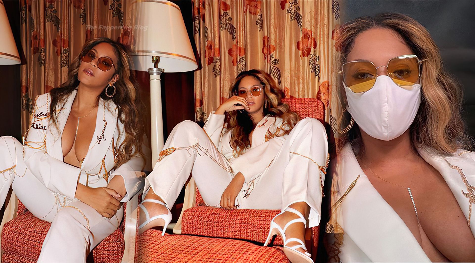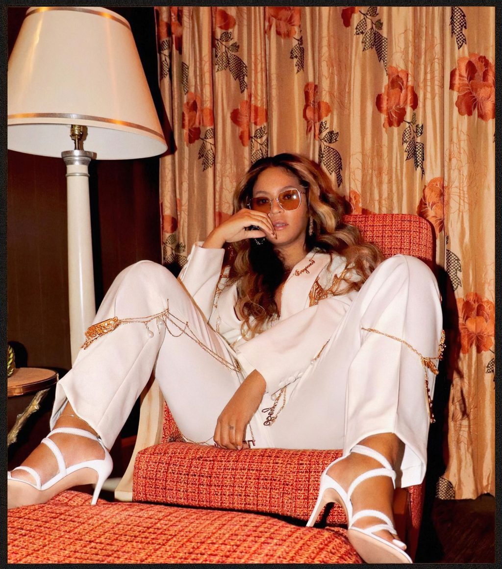 La cantante Beyoncé muestra su bonito escote y joyas, posando sin sostén con un traje de pantalón blanco en una nueva sesión de fotos en redes sociales (abril de 2021).