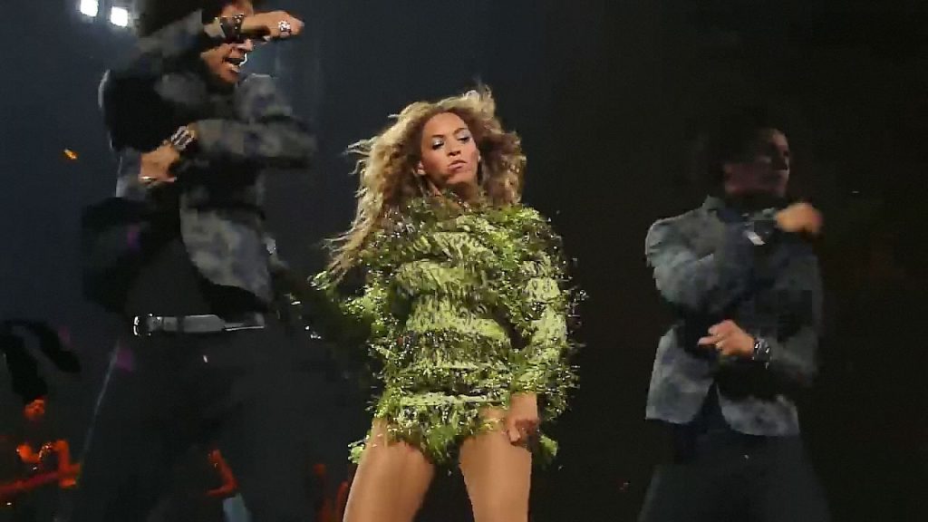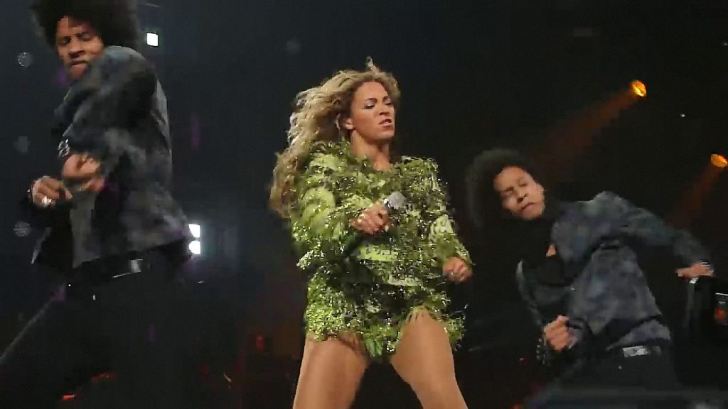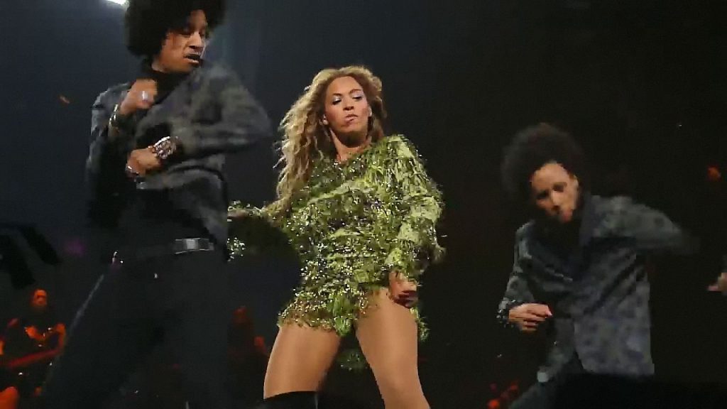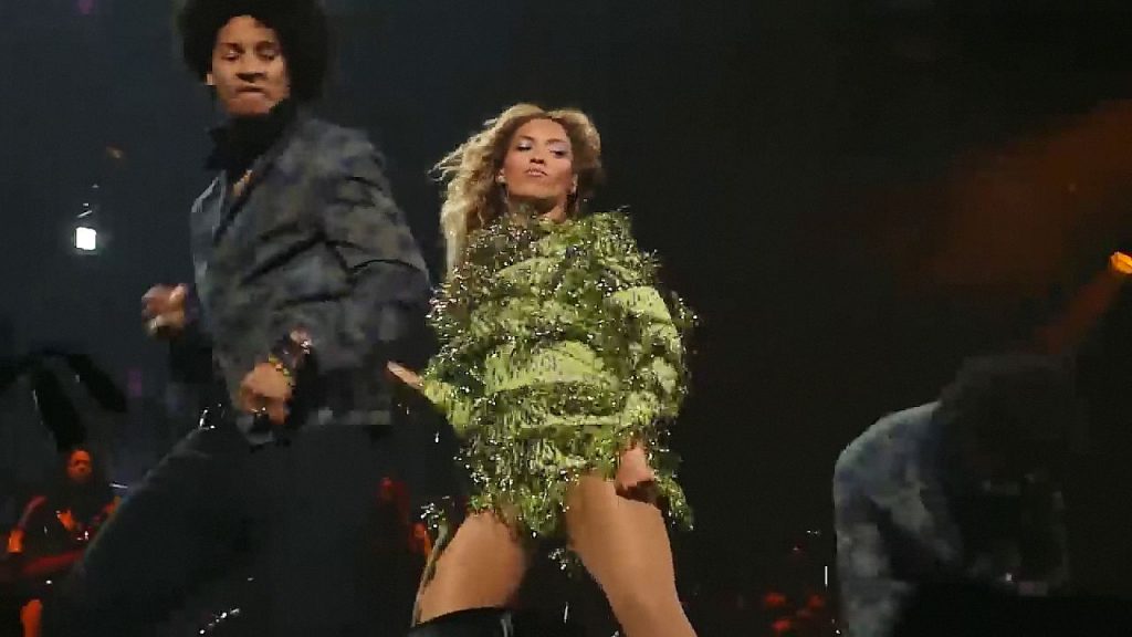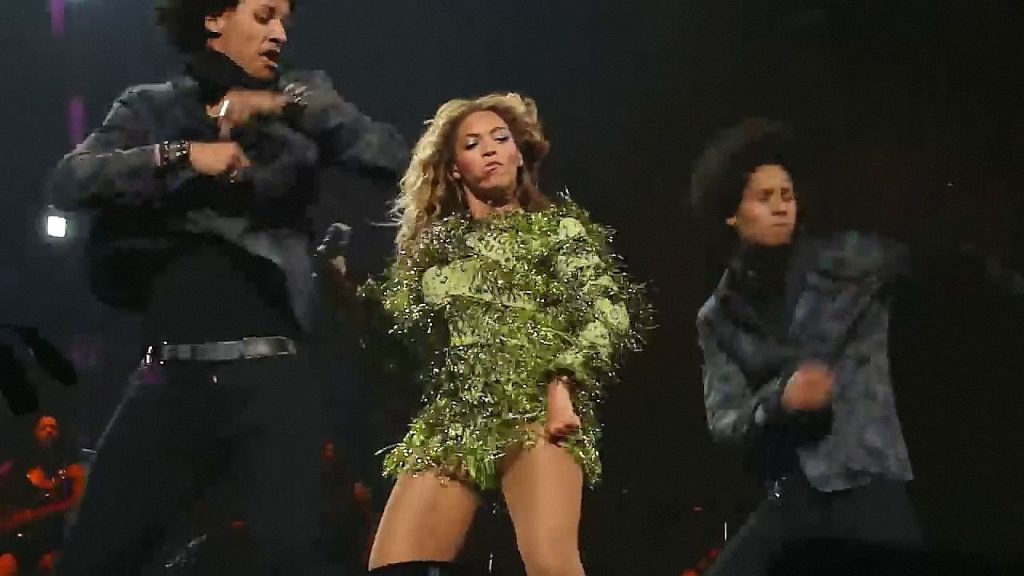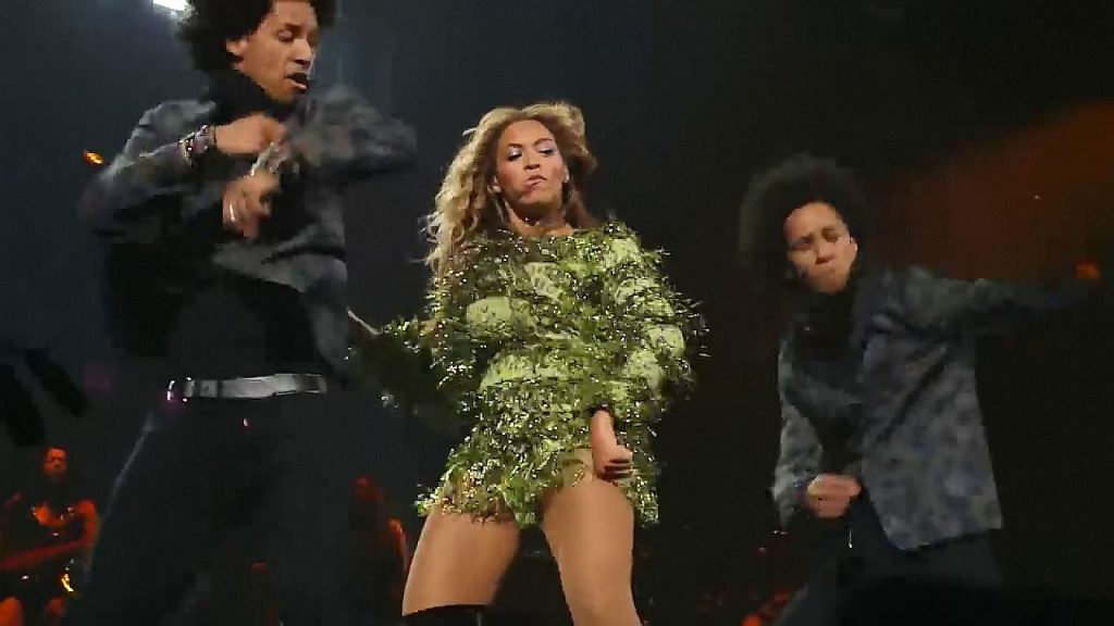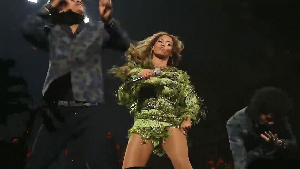 Aquí hay algunas capturas de pantalla de baja calidad del video de Beyoncé en el Mrs. Carter Show WT en Nueva York, 23/07/2013. Tal vez viste bragas verdes y los labios de su vagina durante la actuación.