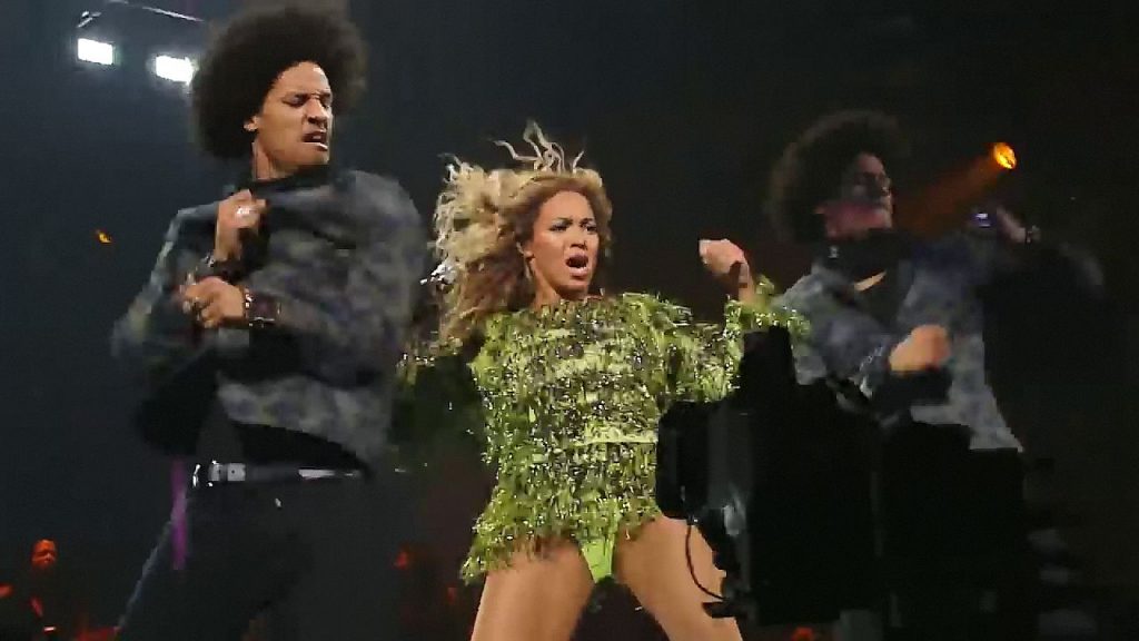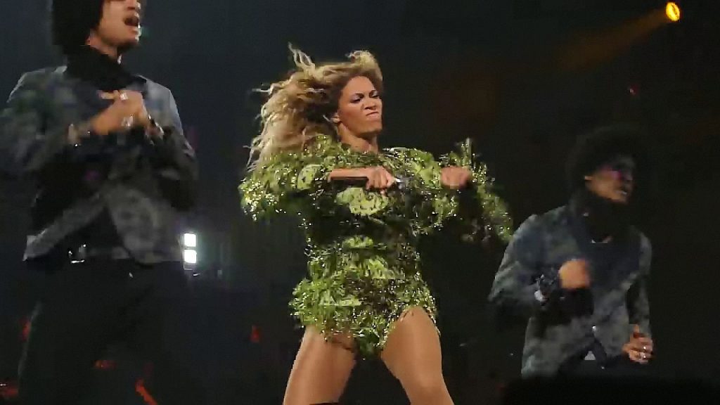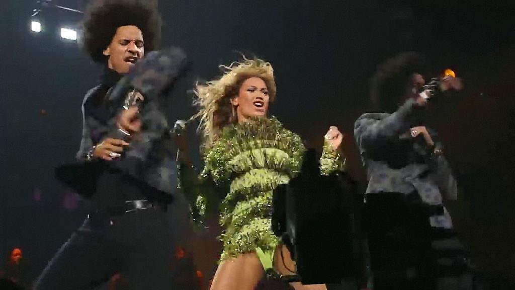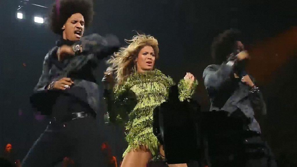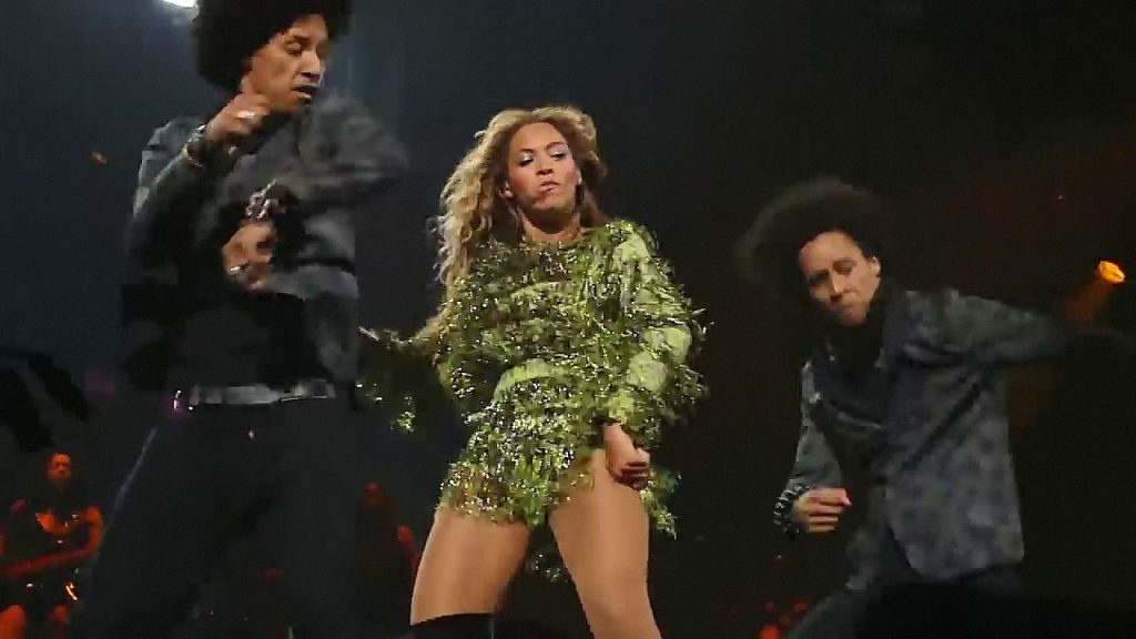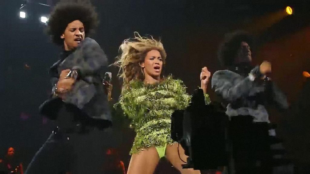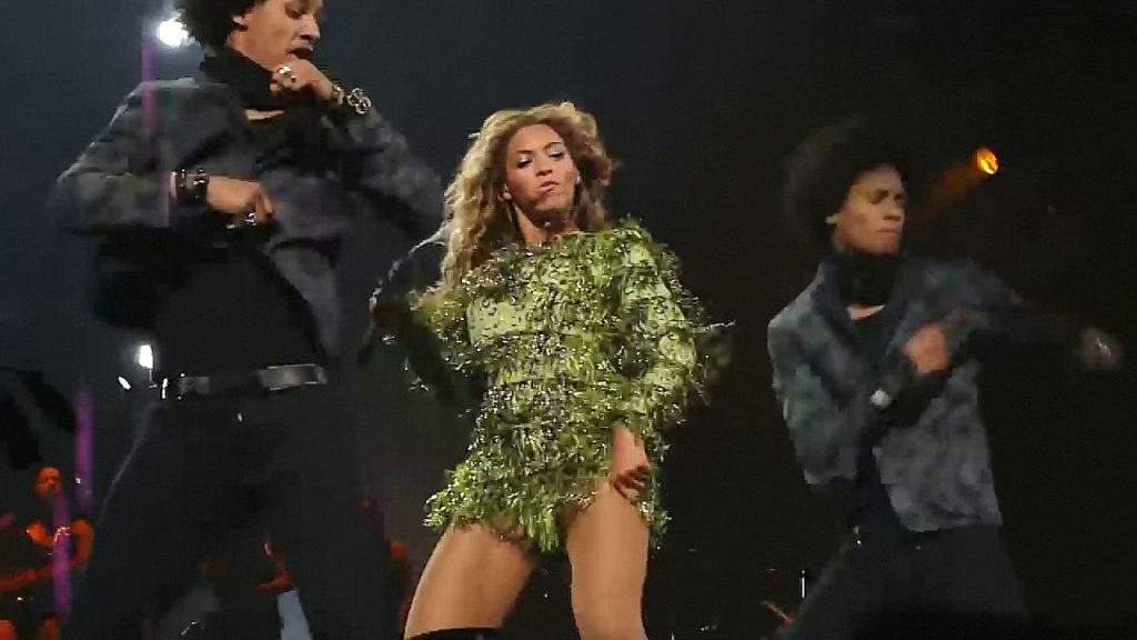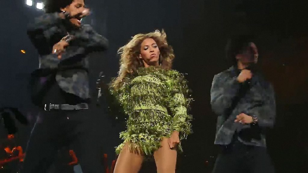 Aquí hay algunas capturas de pantalla de baja calidad del video de Beyoncé en el Mrs. Carter Show WT en Nueva York, 23/07/2013. Tal vez viste bragas verdes y los labios de su vagina durante la actuación.