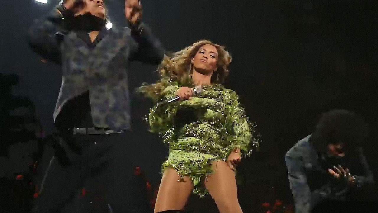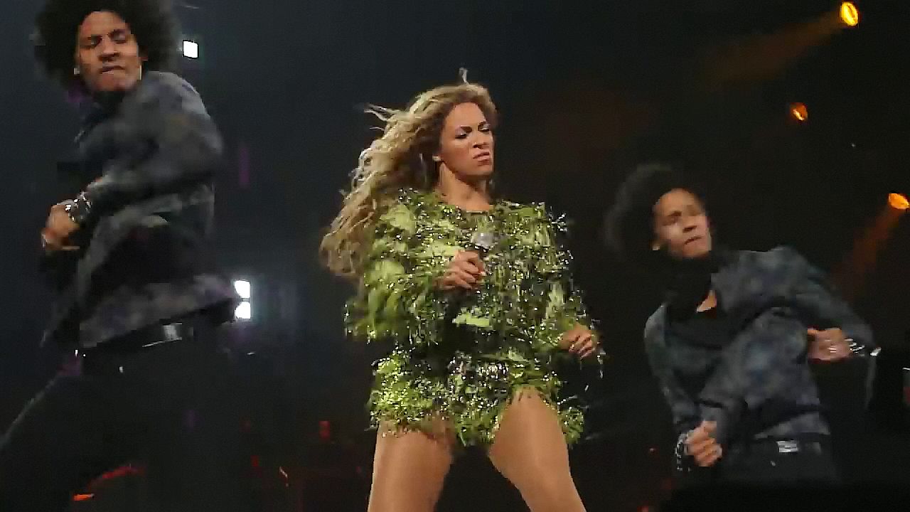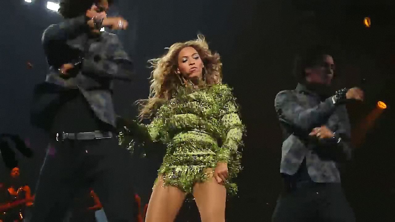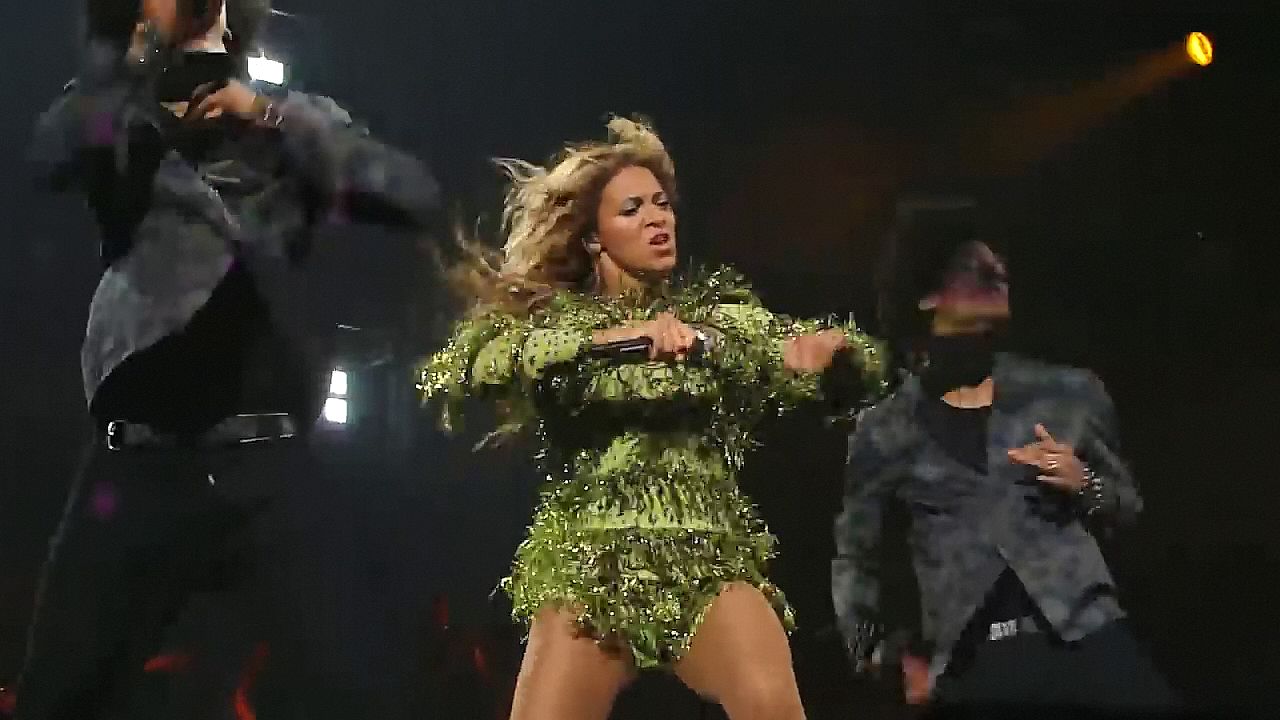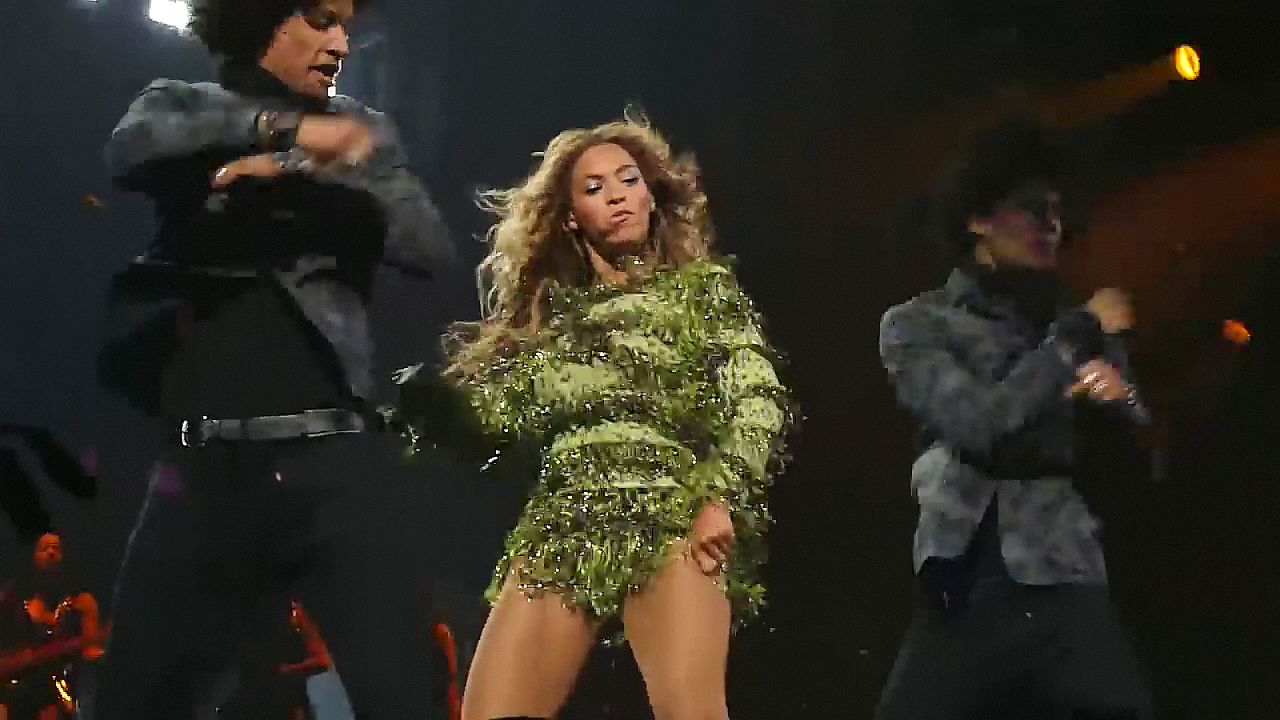 Aquí hay algunas capturas de pantalla de baja calidad del video de Beyoncé en el Mrs. Carter Show WT en Nueva York, 23/07/2013. Tal vez viste bragas verdes y los labios de su vagina durante la actuación.