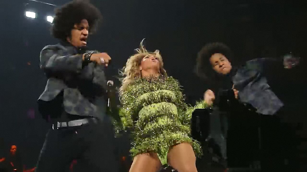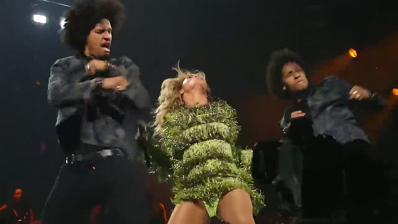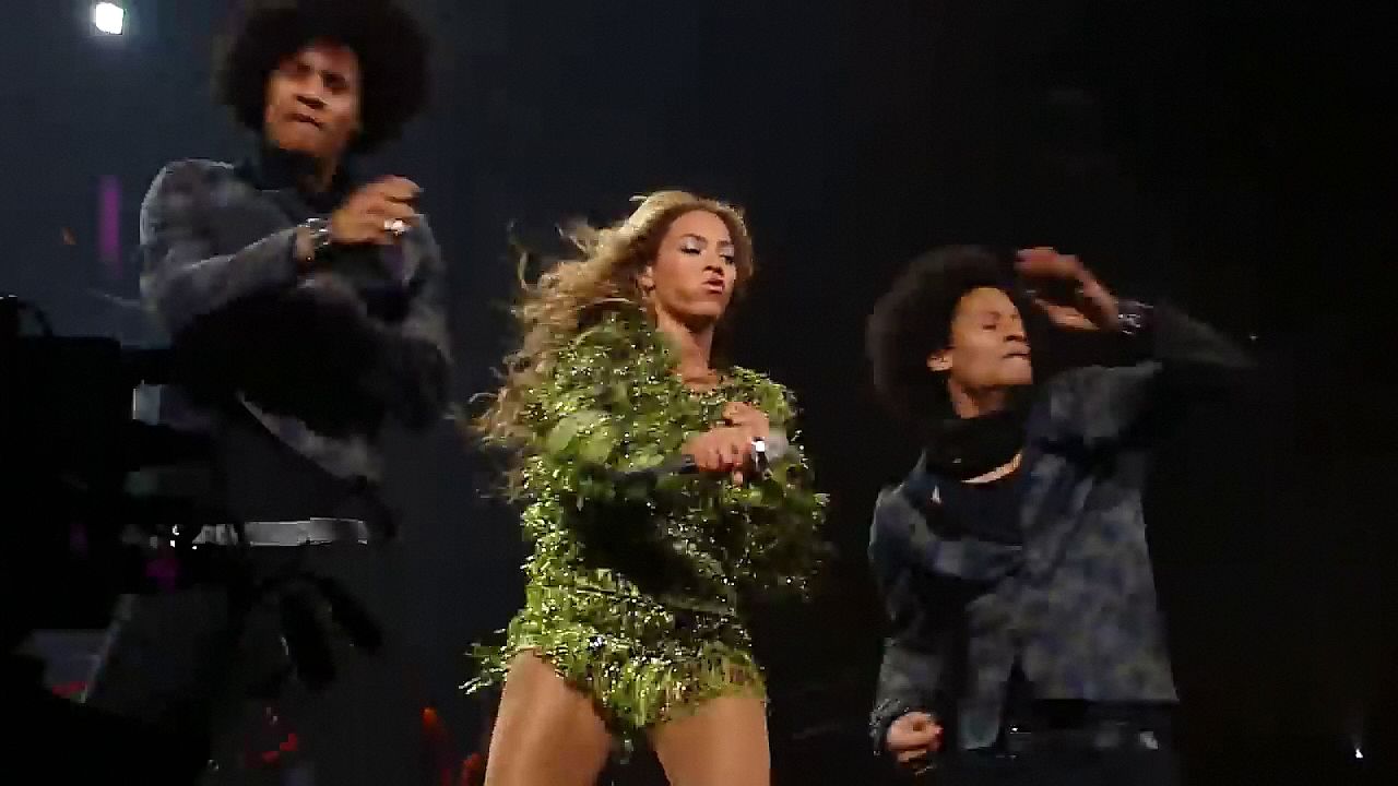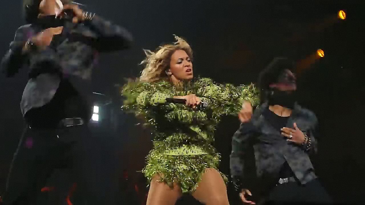 Aquí hay algunas capturas de pantalla de baja calidad del video de Beyoncé en el Mrs. Carter Show WT en Nueva York, 23/07/2013. Tal vez viste bragas verdes y los labios de su vagina durante la actuación.