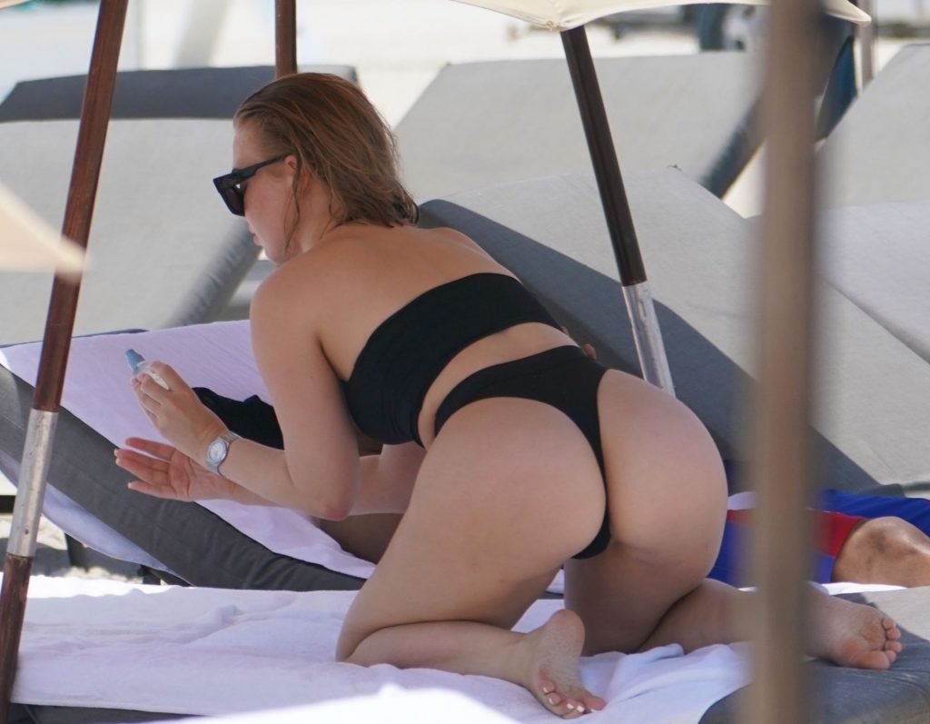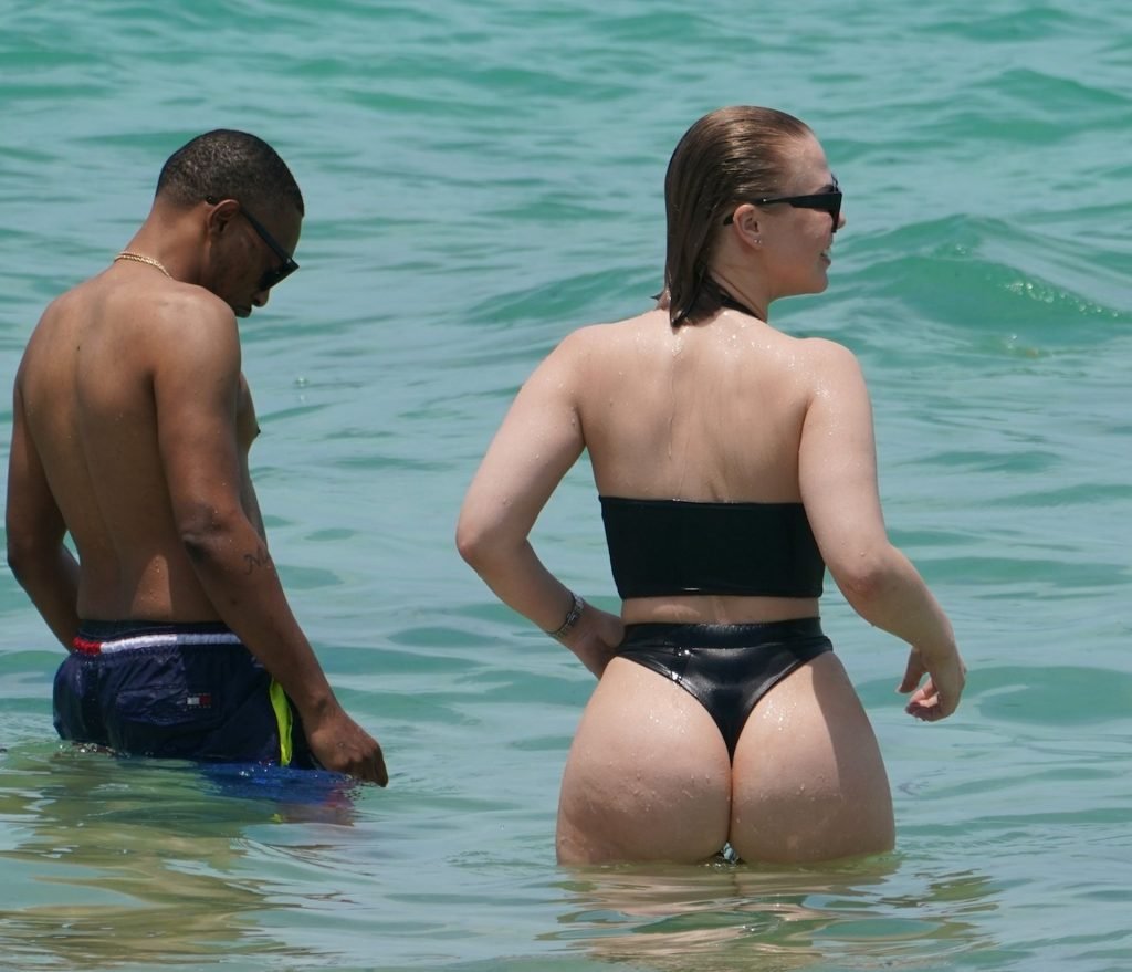 La diseñadora de moda australiana Bianca Elouise (28) fue vista en un bikini negro con tanga en la playa con el rapero Sunny – Miami Beach, 07/10/2019.