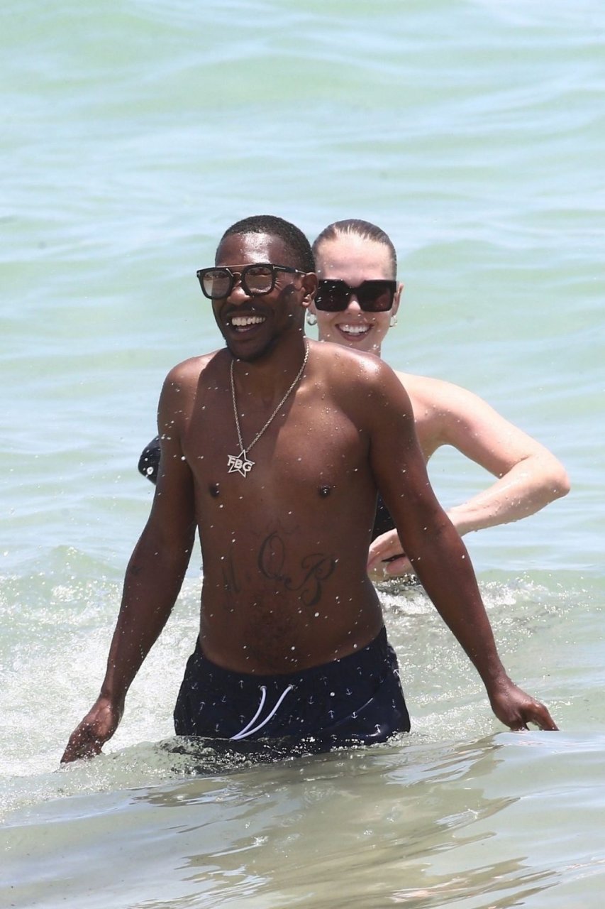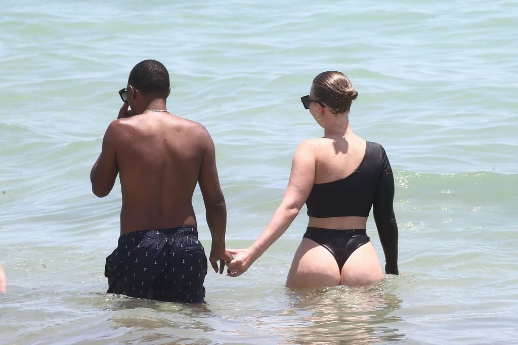 La modelo de bikini Bianca Elouise llega a la playa con su novio para tomar el sol en un día relajado – Miami, 15/08/2019. Bianca lució un traje de baño negro de dos piezas y refrescó sus curvas sexys en el agua.