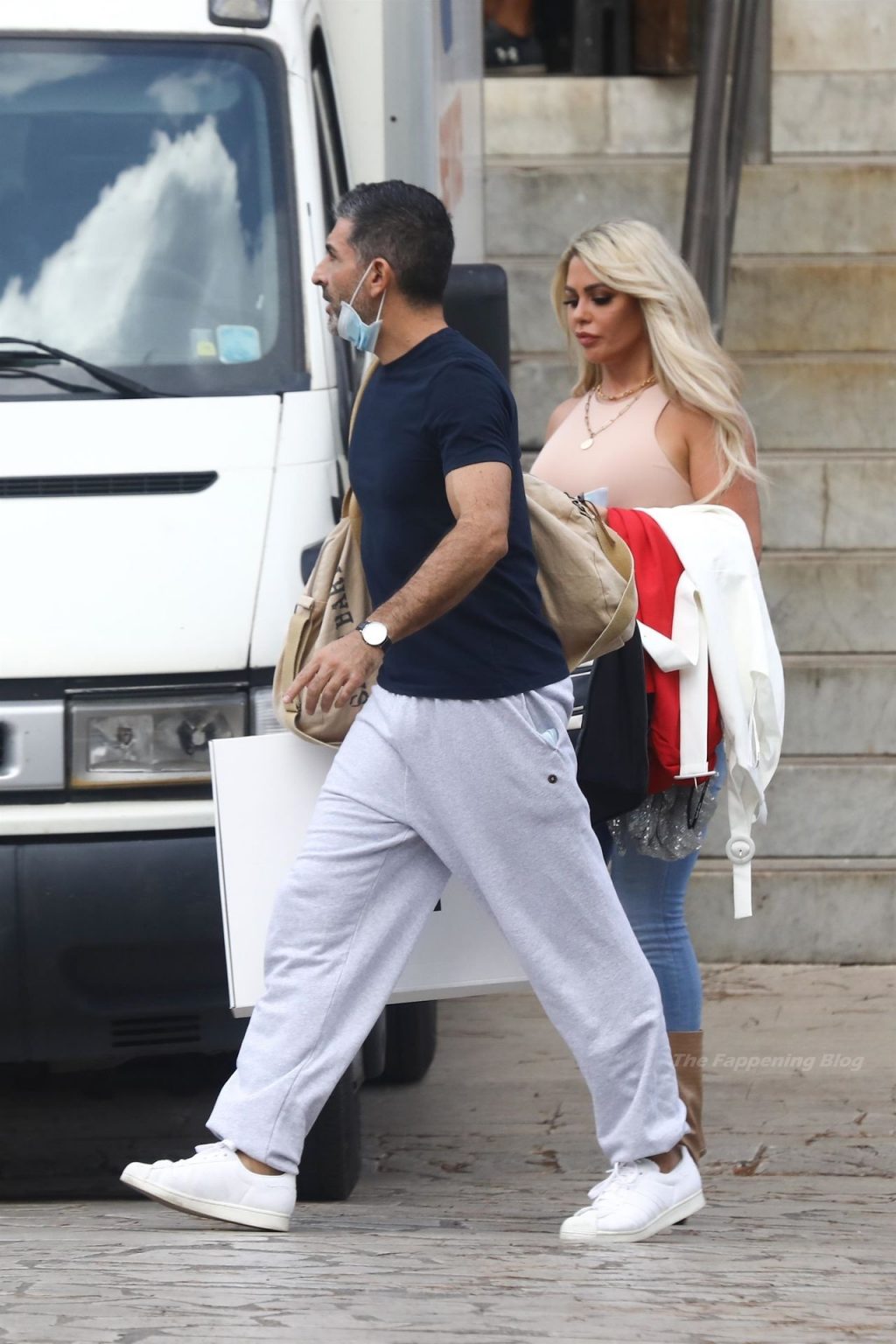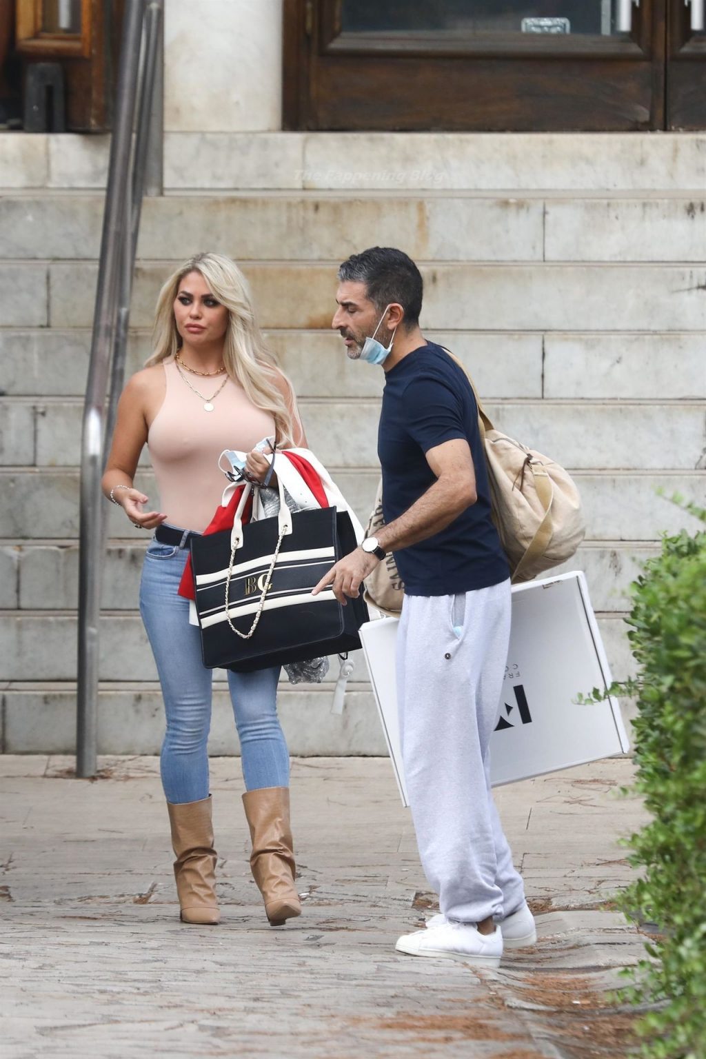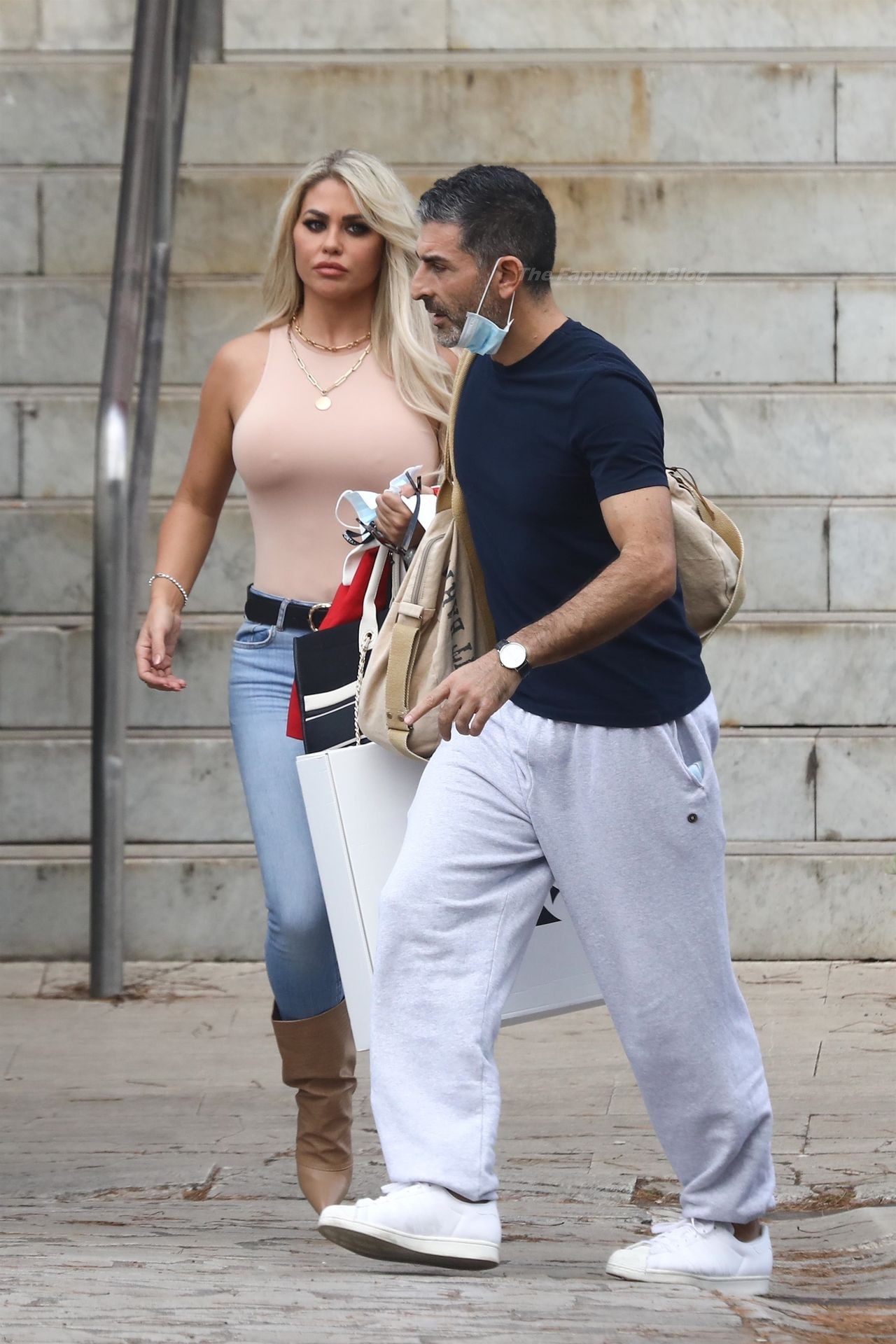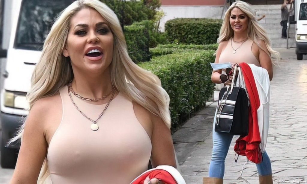 La estrella de reality TV Bianca Gascoigne sin sujetador llama la atención con una camiseta ajustada color “nude” y jeans camino a los ensayos de “Bailando con las Estrellas” en Italia, 27/08/2021.