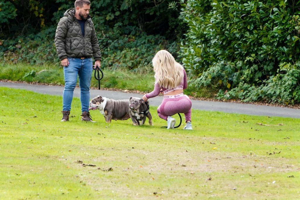 La estrella curvilínea de la TV Bianca Gascoigne fue vista paseando a su perro con su novio Adam Burton en un parque en Kent, 10/09/2018.