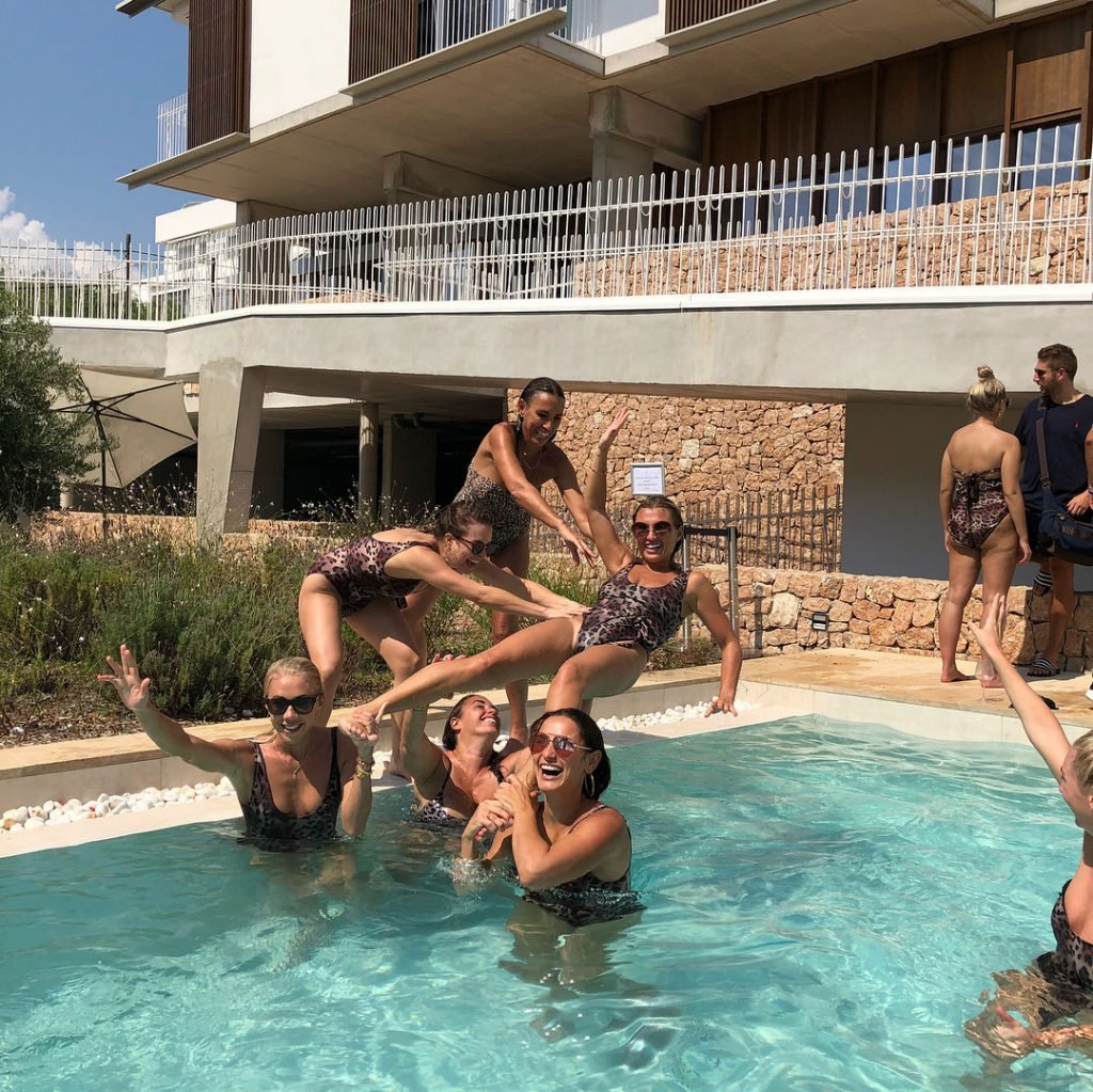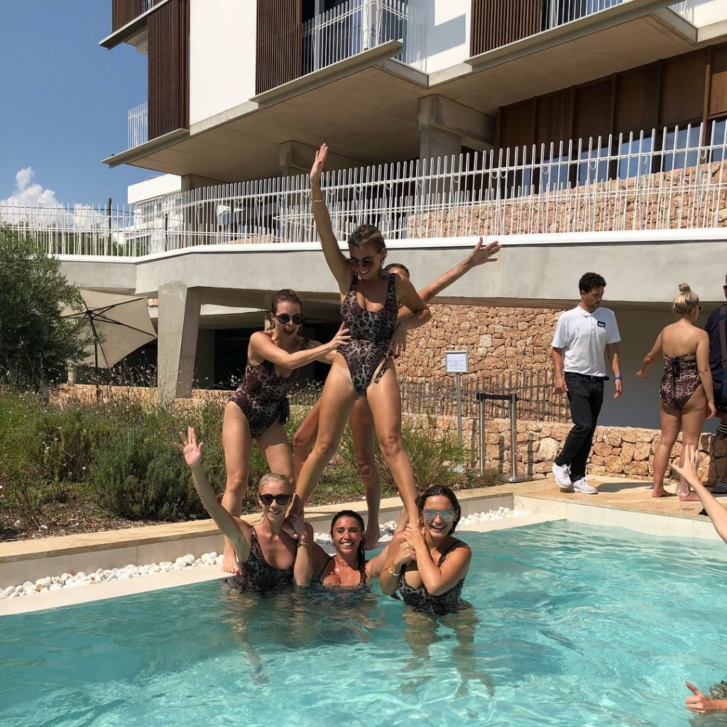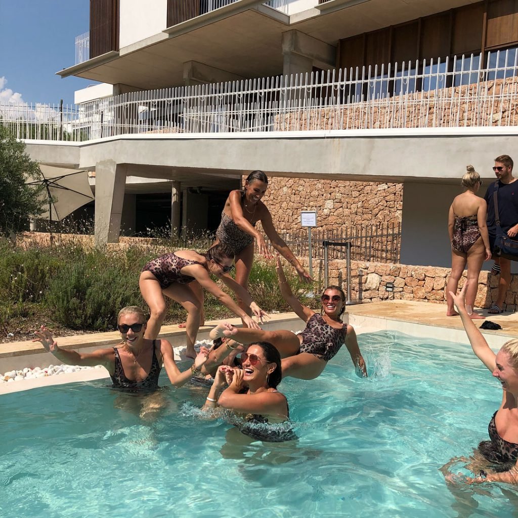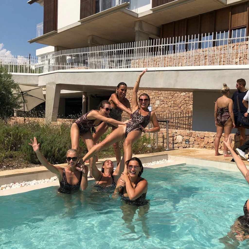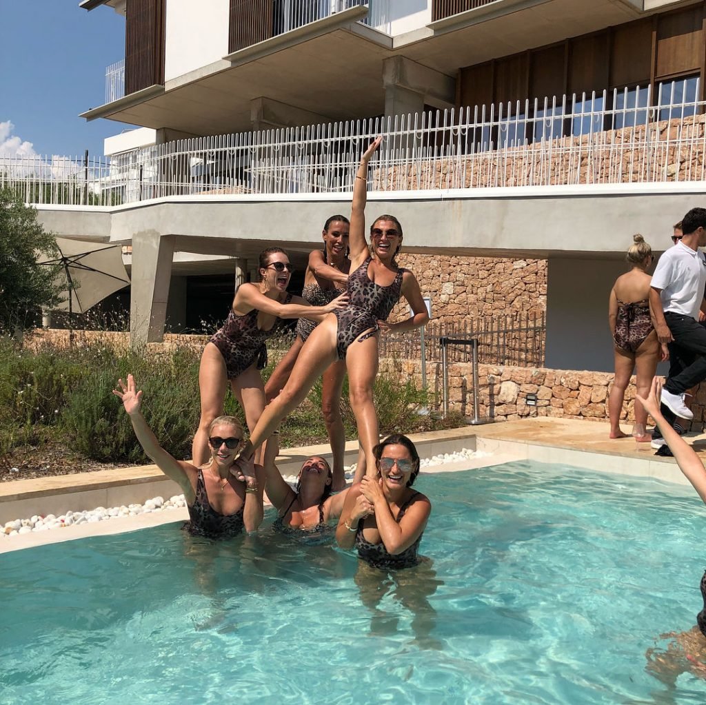 Billie Faiers se ve en Ibiza en su despedida de soltera donde todos sus invitados estaban vestidos con trajes de baño enterizos de estampado de leopardo, 23/08/2018. Entre los invitados estaban las estrellas de TOWIE Sam Faiers, su hermana, y Ferne McCann.