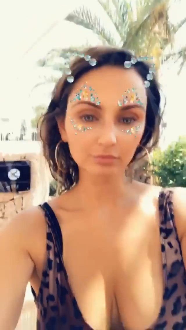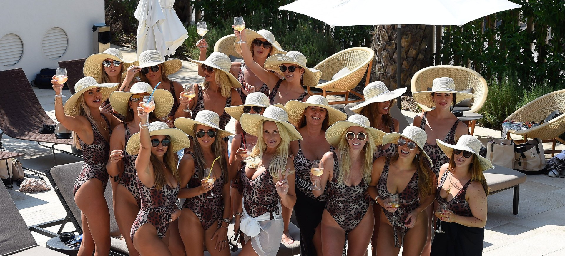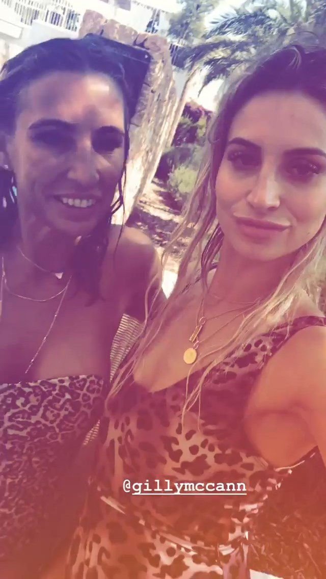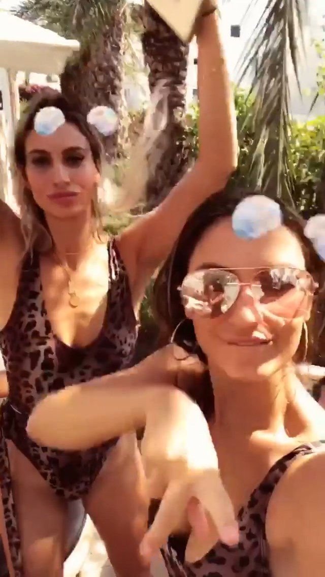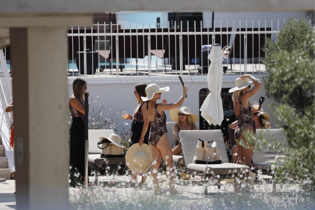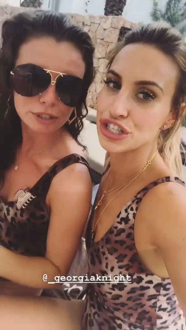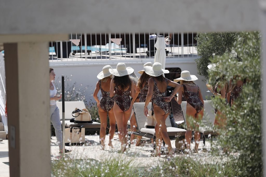 Billie Faiers se ve en Ibiza en su despedida de soltera donde todos sus invitados estaban vestidos con trajes de baño enterizos de estampado de leopardo, 23/08/2018. Entre los invitados estaban las estrellas de TOWIE Sam Faiers, su hermana, y Ferne McCann.
