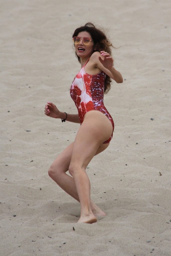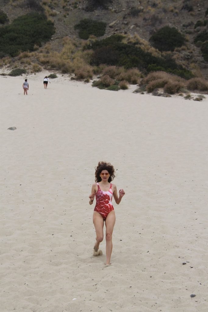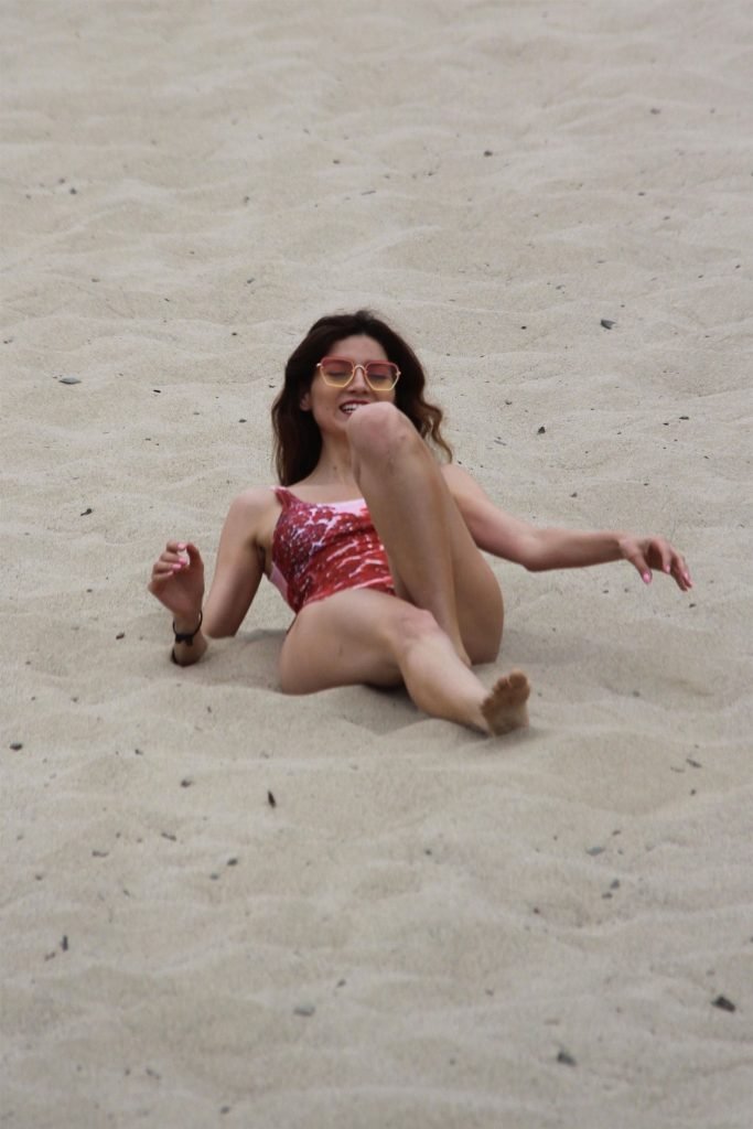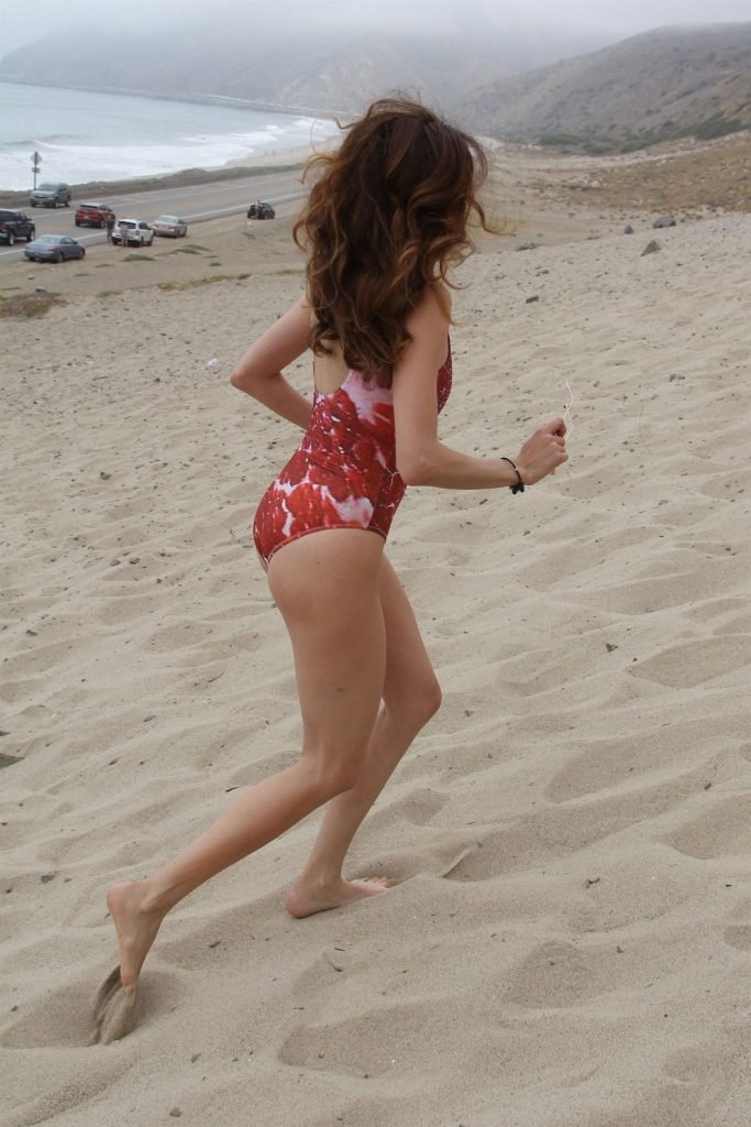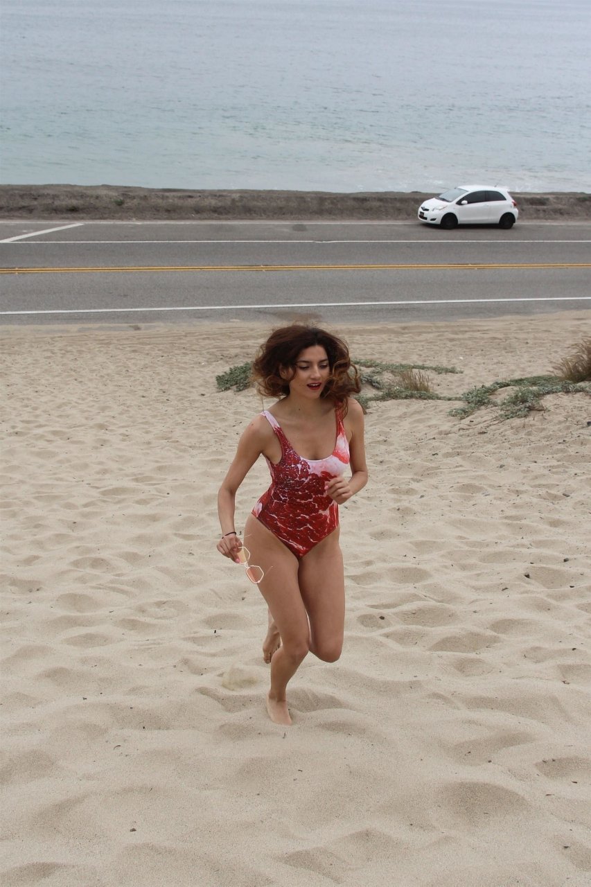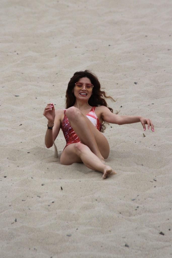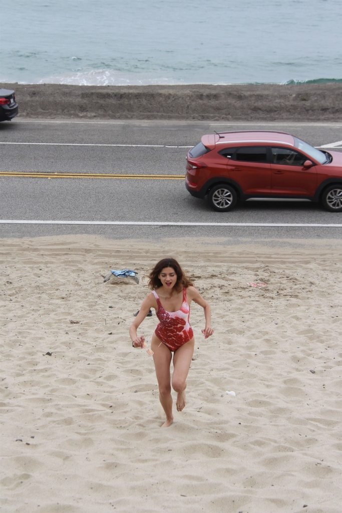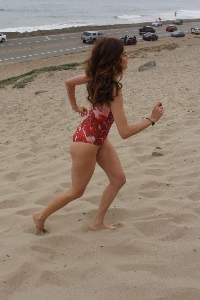 Actriz Blanca Blanco se divierte corriendo y saltando en una colina de arena en Malibu, 03/07/2018. Blanca llevaba un traje de baño rojo y blanco mientras jugaba en la colina.