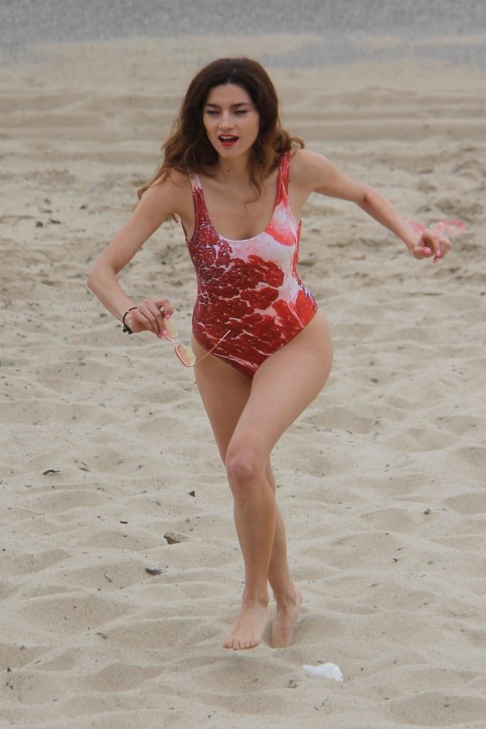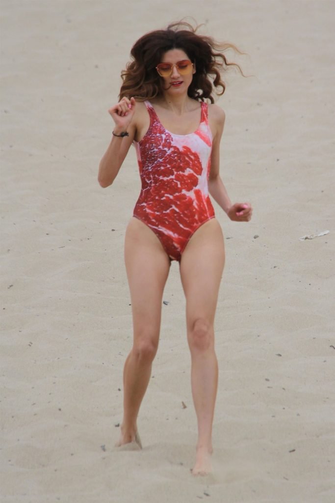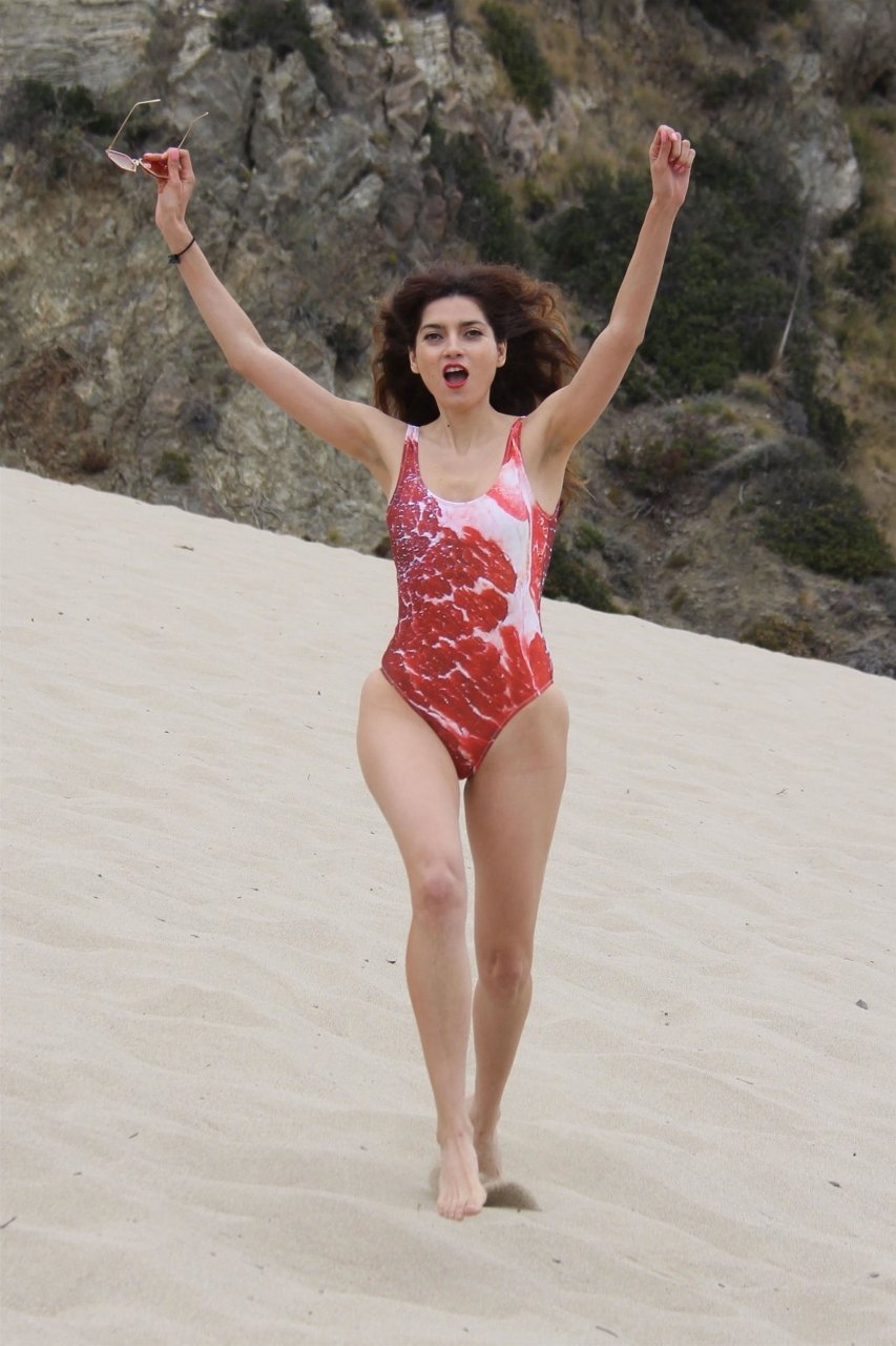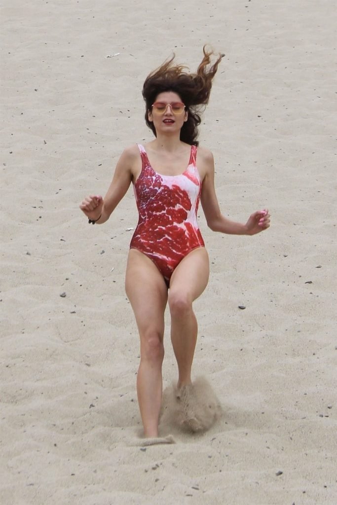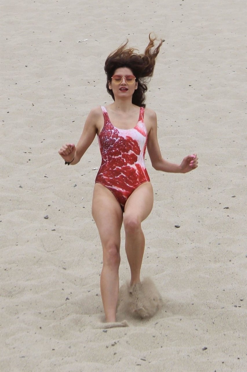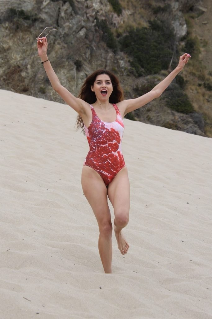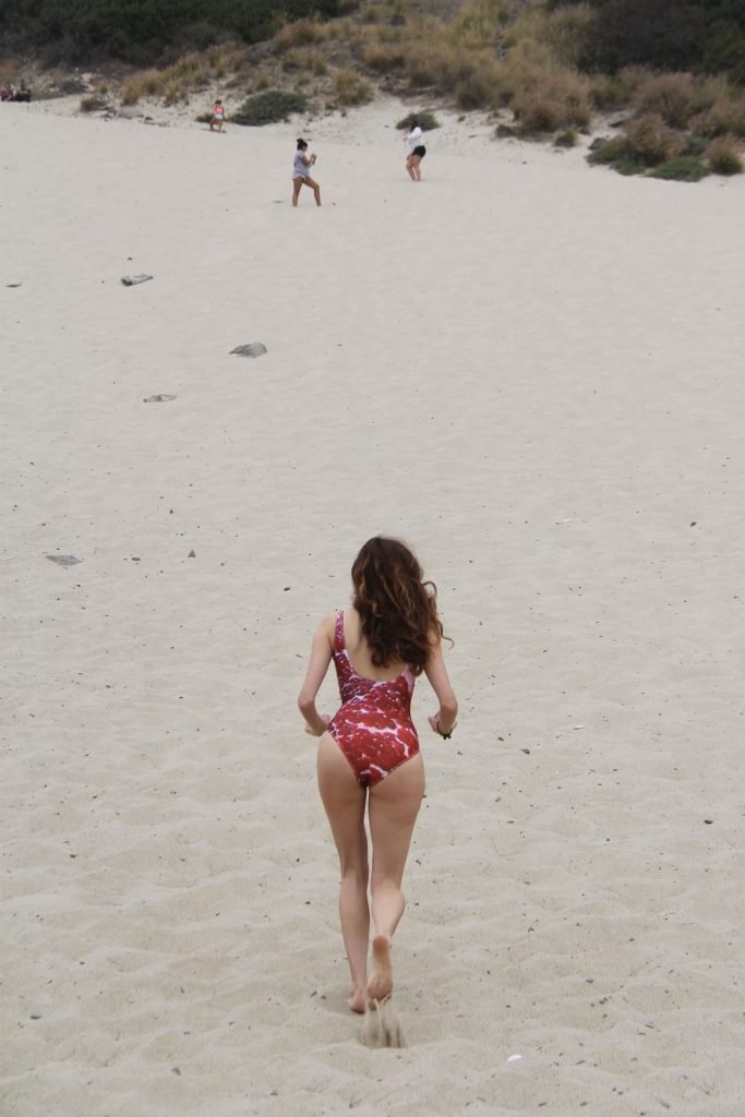 Actriz Blanca Blanco se divierte corriendo y saltando en una colina de arena en Malibu, 03/07/2018. Blanca llevaba un traje de baño rojo y blanco mientras jugaba en la colina.