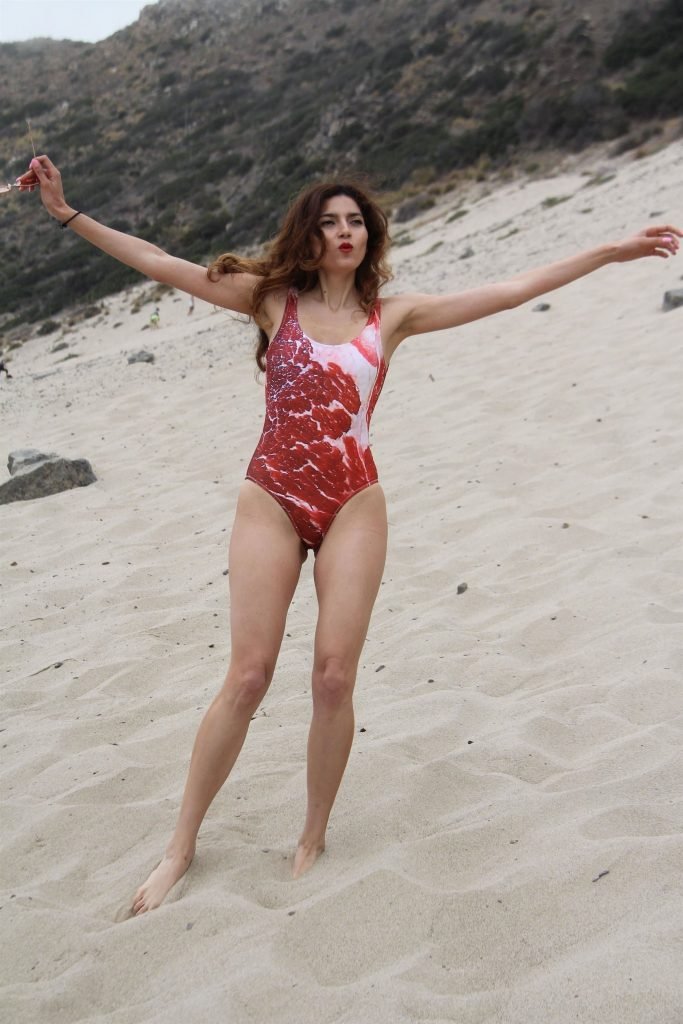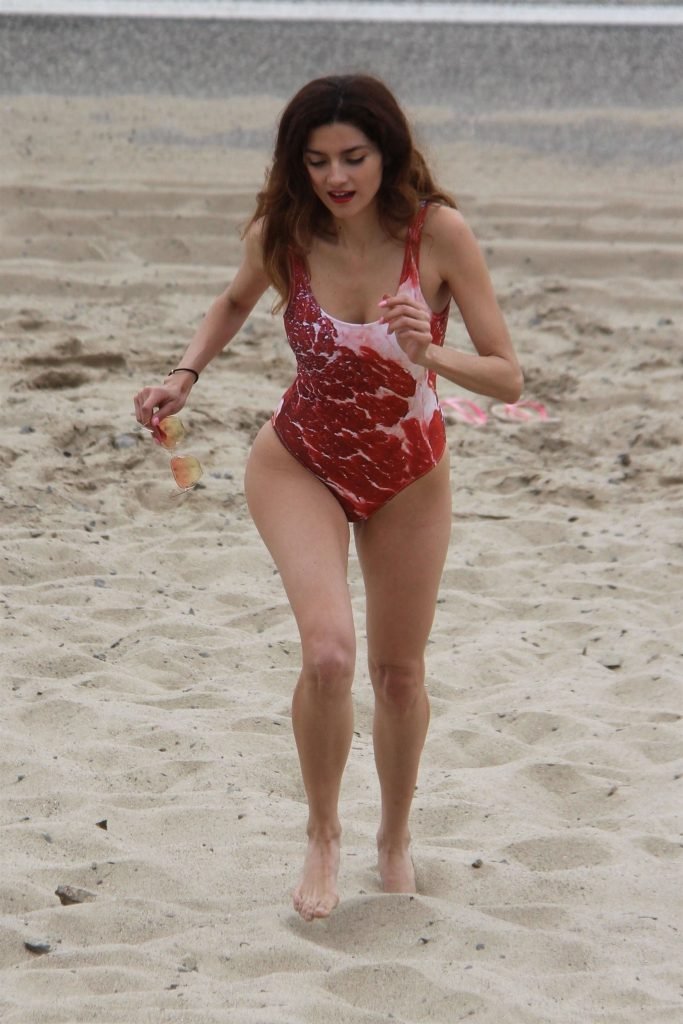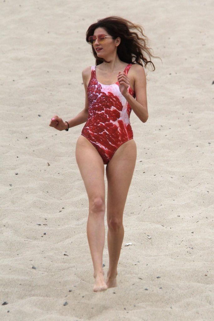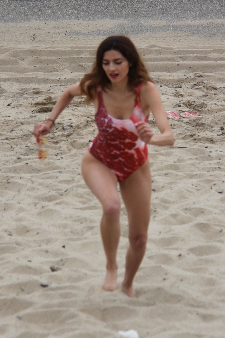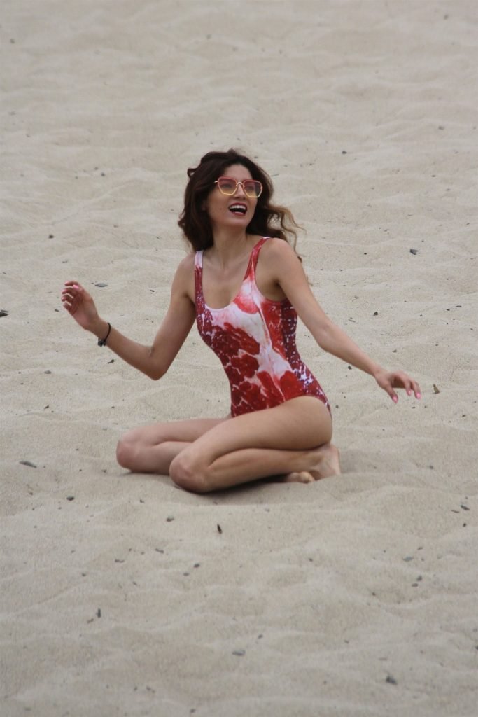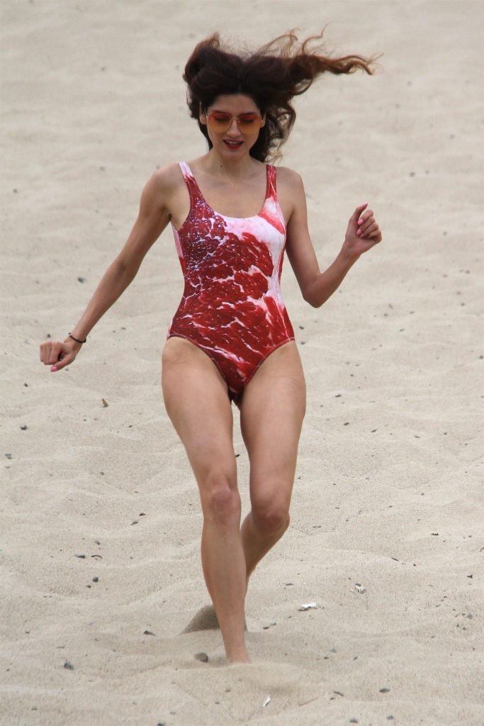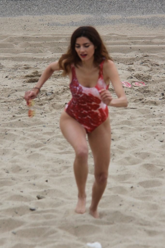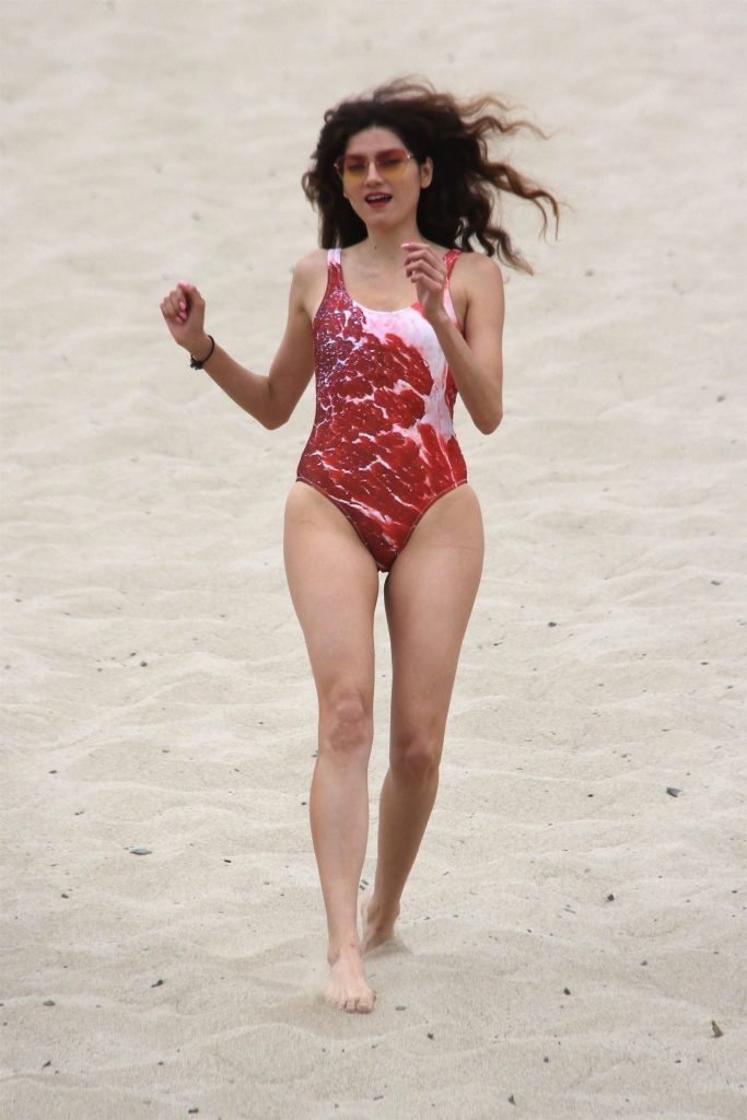 Actriz Blanca Blanco se divierte corriendo y saltando en una colina de arena en Malibu, 03/07/2018. Blanca llevaba un traje de baño rojo y blanco mientras jugaba en la colina.