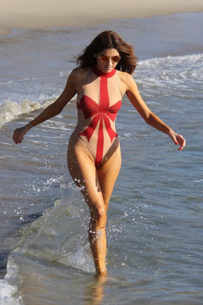 Actriz Blanca Blanco (36) se mete en el espíritu navideño en la playa de Malibu con un bañador transparente con lazo de Navidad, 23/12/2017.