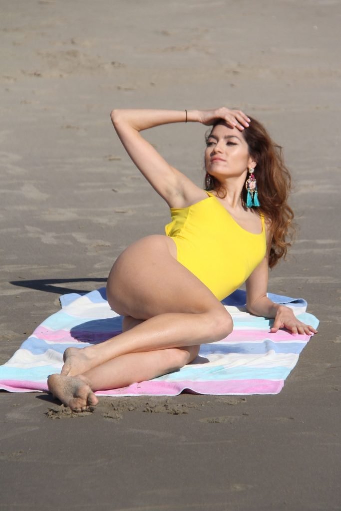 Actriz Blanca Blanco (36) desafía el frío para una sesión de fotos en la playa. Blanca destaca con un traje de baño entero amarillo brillante mientras pasea por las playas de Malibu, 30/12/2017.