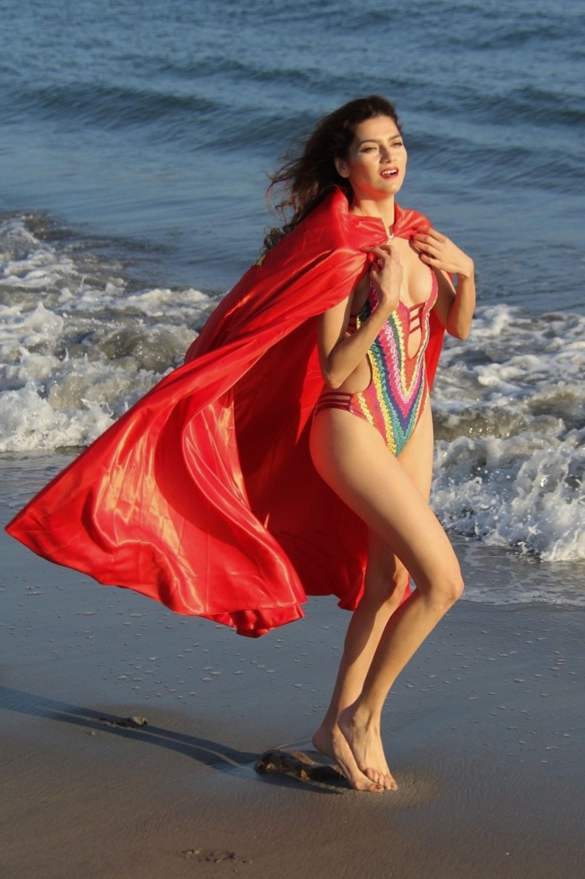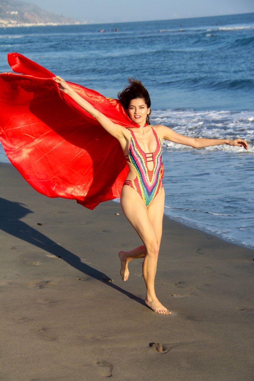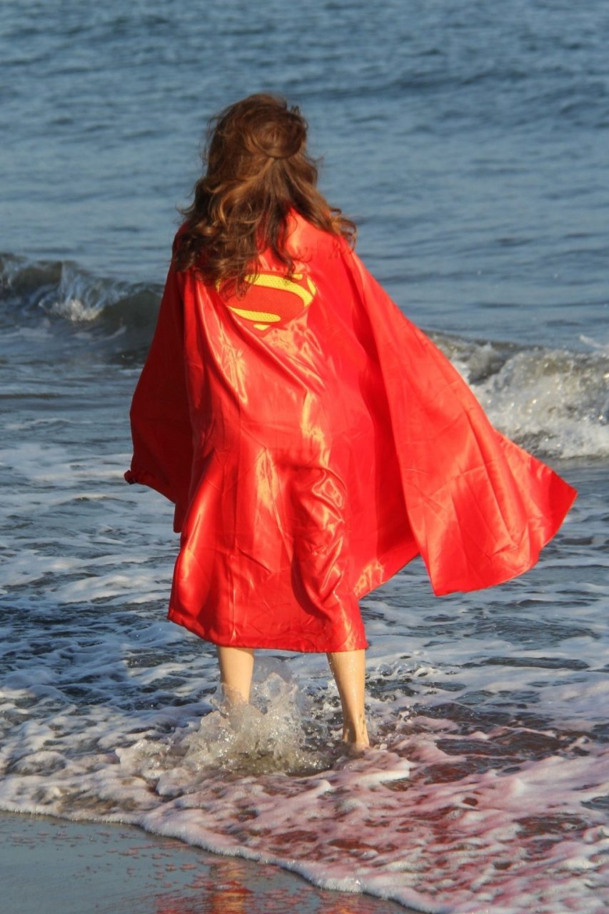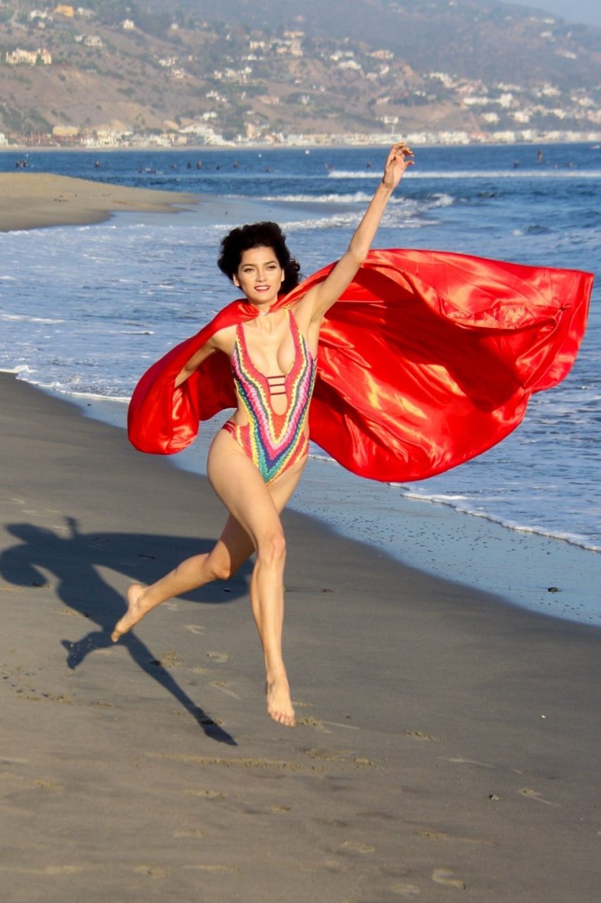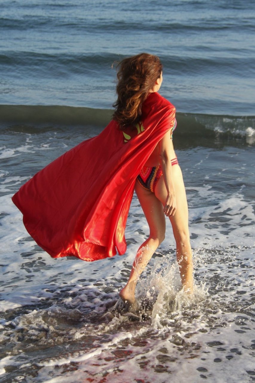 Actriz Blanca Blanco se viste como Supergirl (o robó la capa de Superman) en Halloween para una sesión de fotos en la playa de Malibu en la arena, 31/10/2018.
