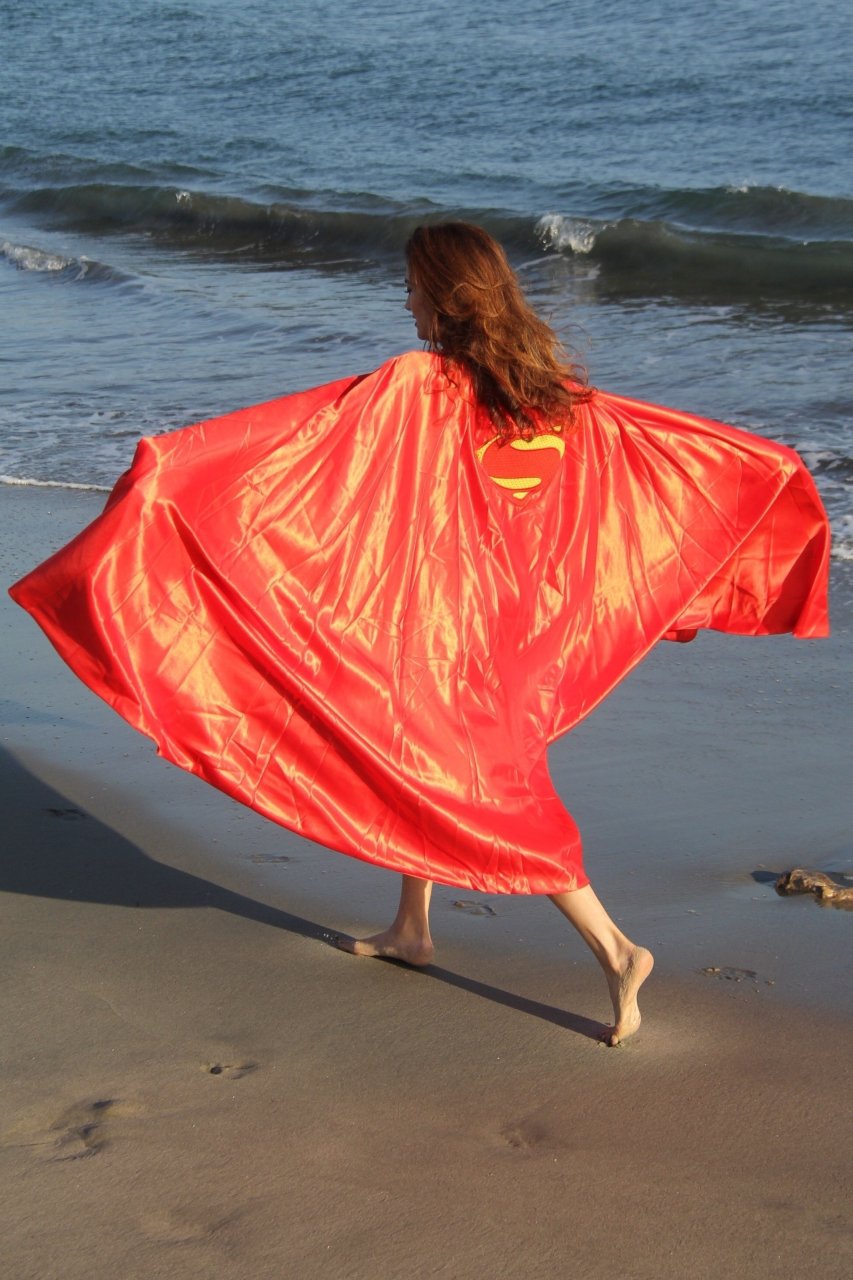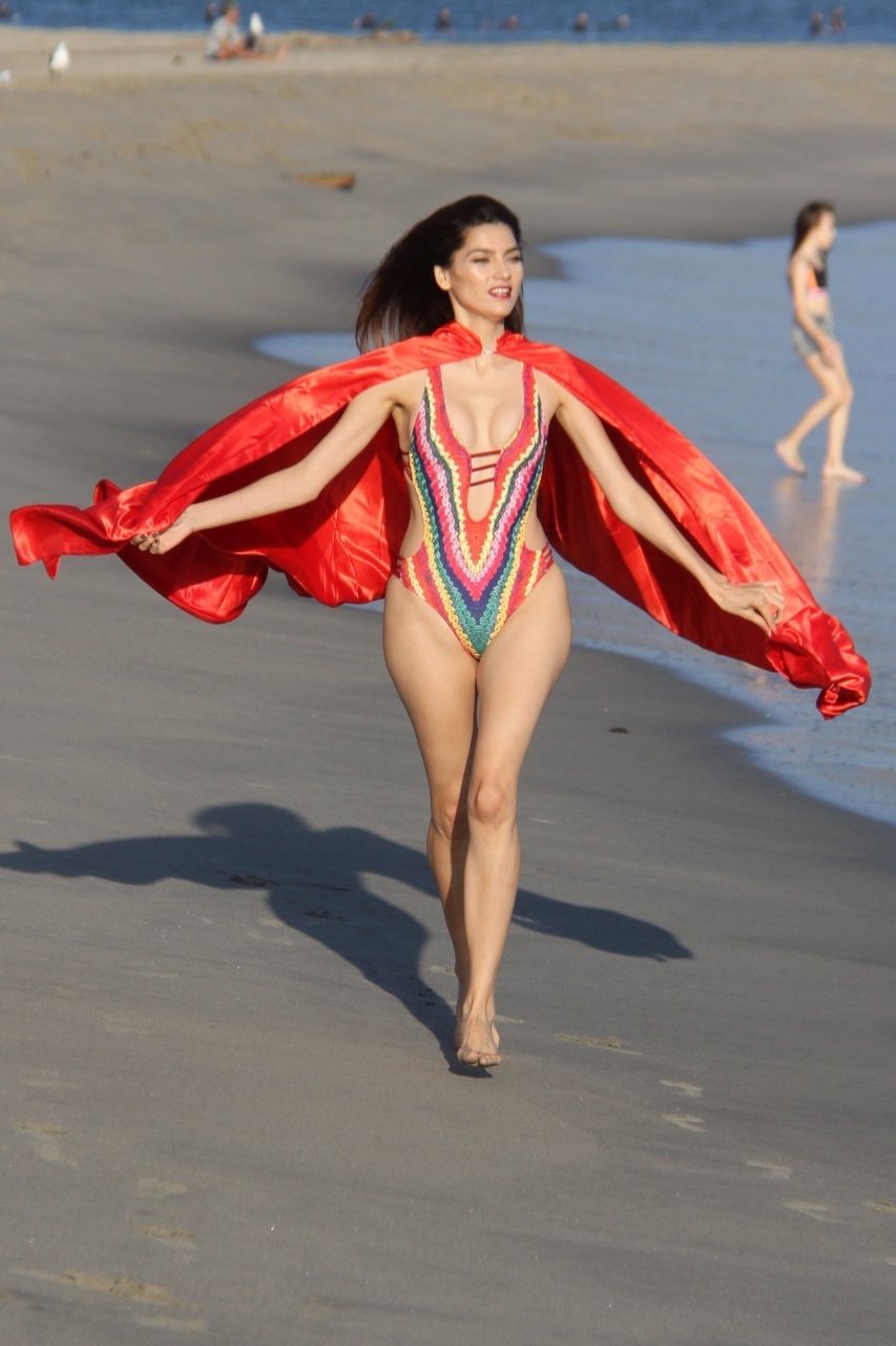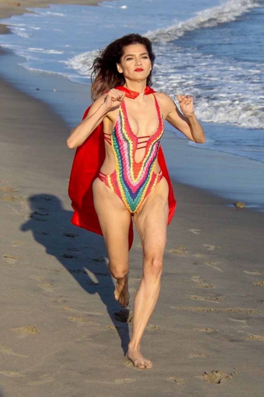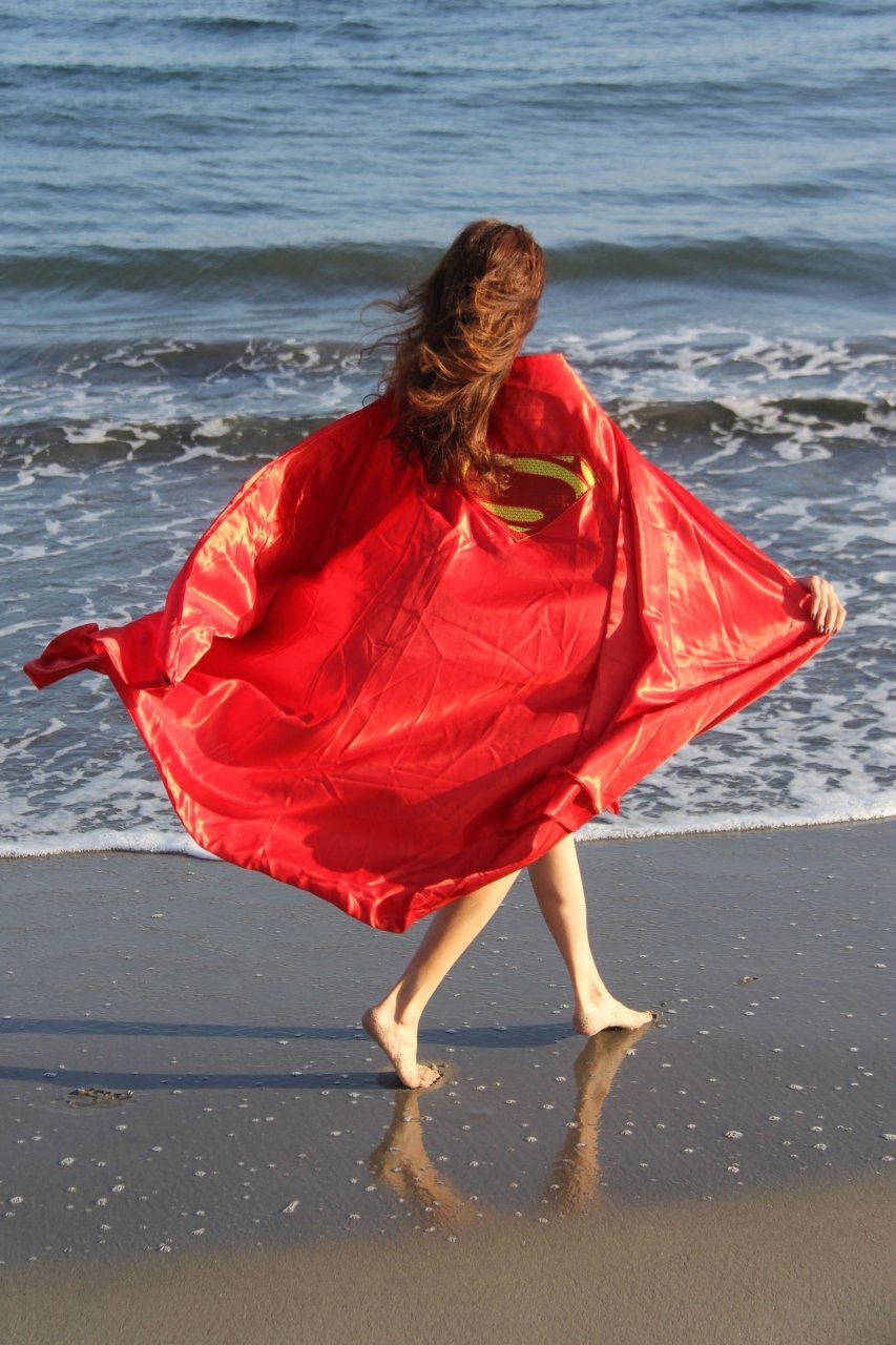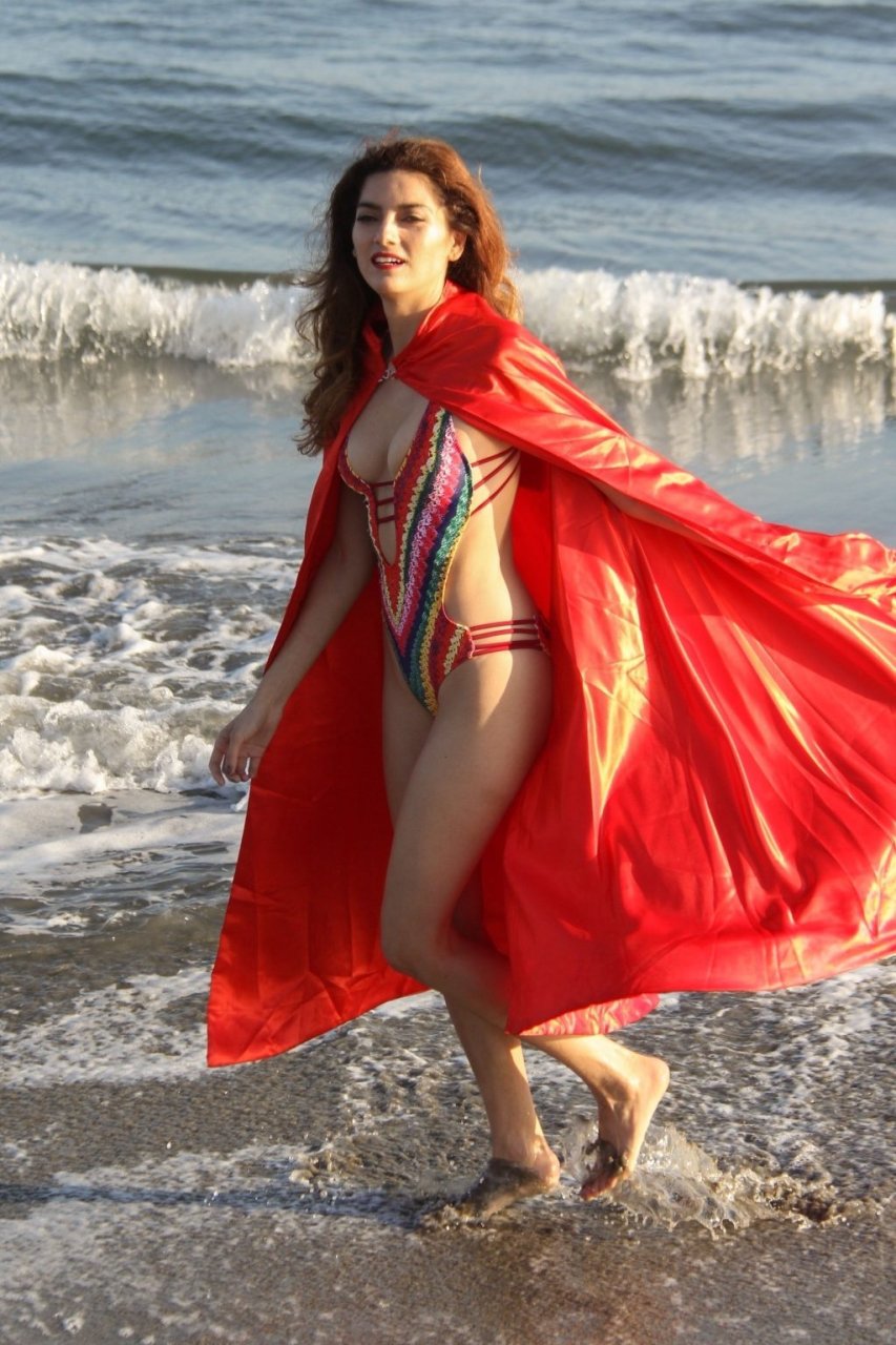 Actriz Blanca Blanco se viste como Supergirl (o robó la capa de Superman) en Halloween para una sesión de fotos en la playa de Malibu en la arena, 31/10/2018.