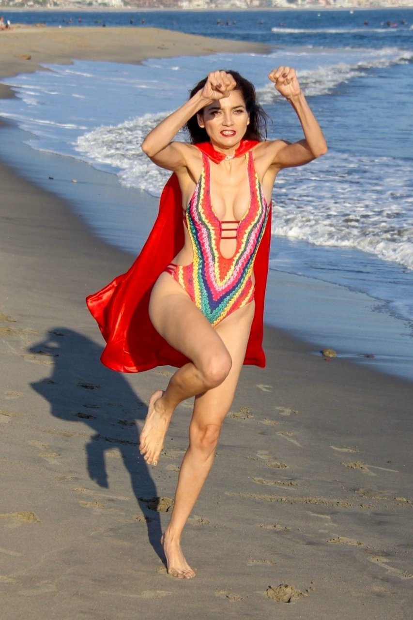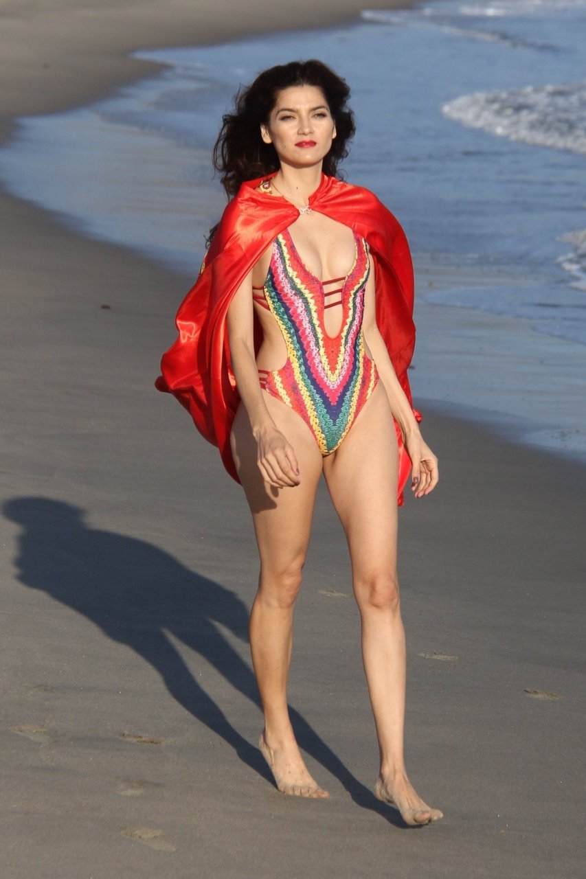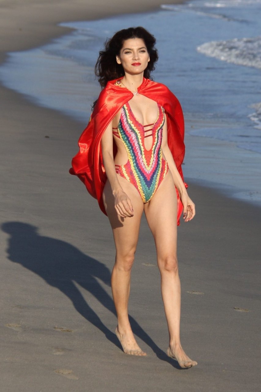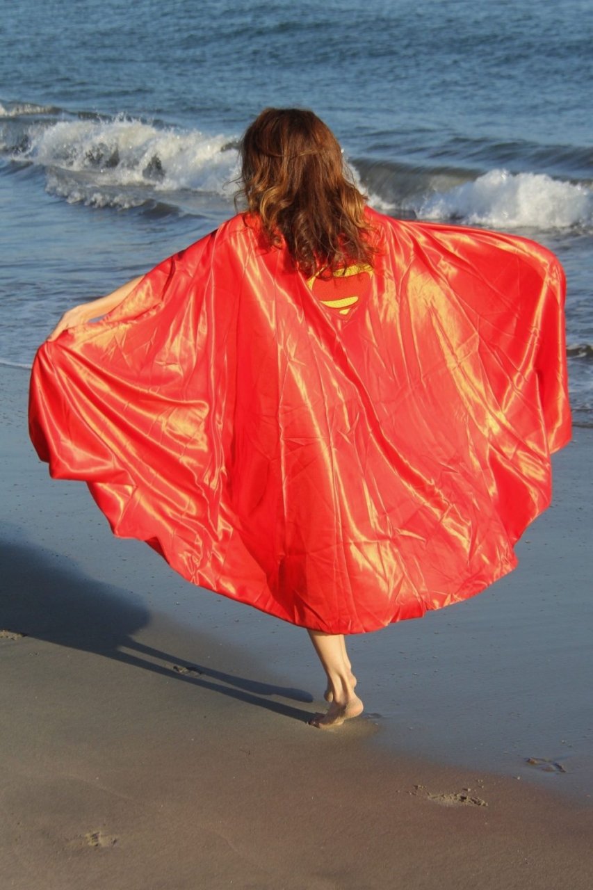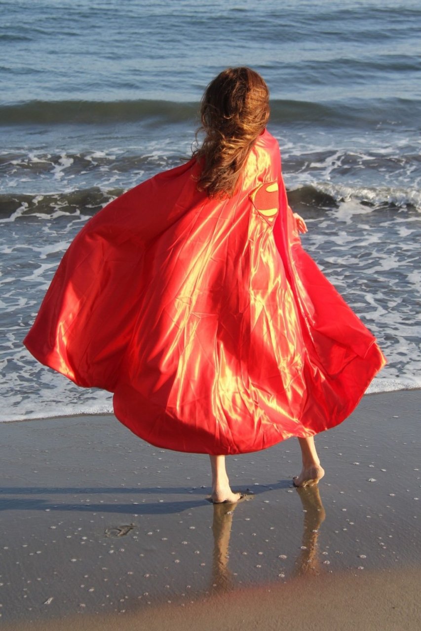 Actriz Blanca Blanco se viste como Supergirl (o robó la capa de Superman) en Halloween para una sesión de fotos en la playa de Malibu en la arena, 31/10/2018.