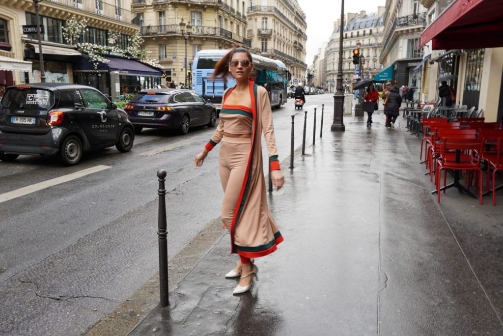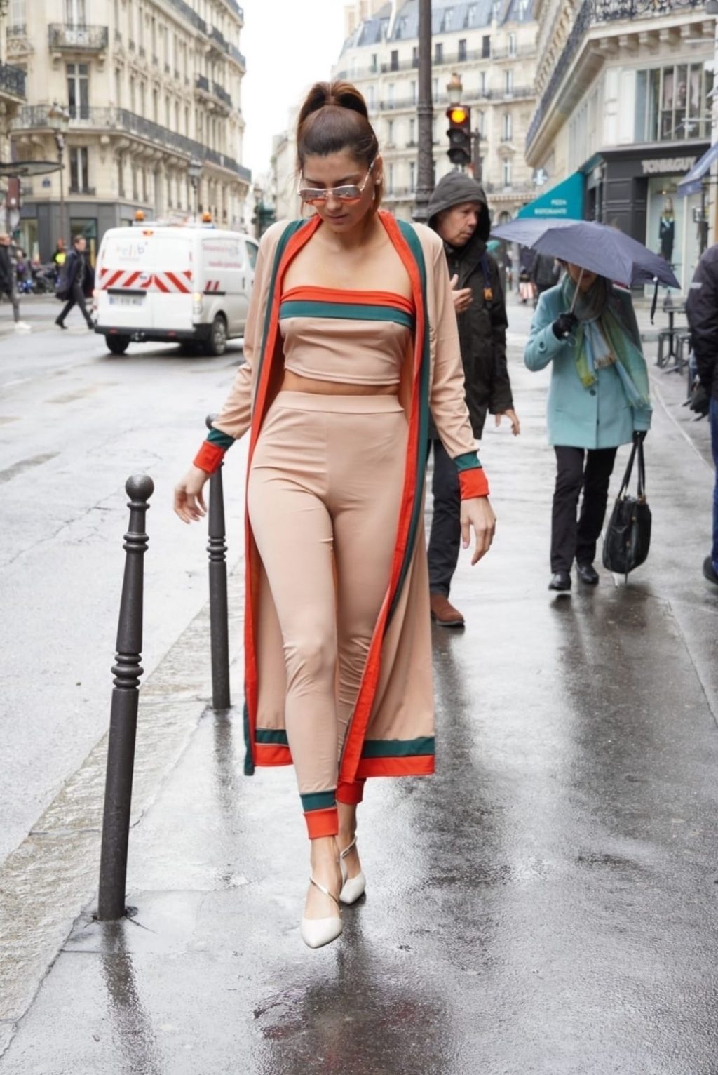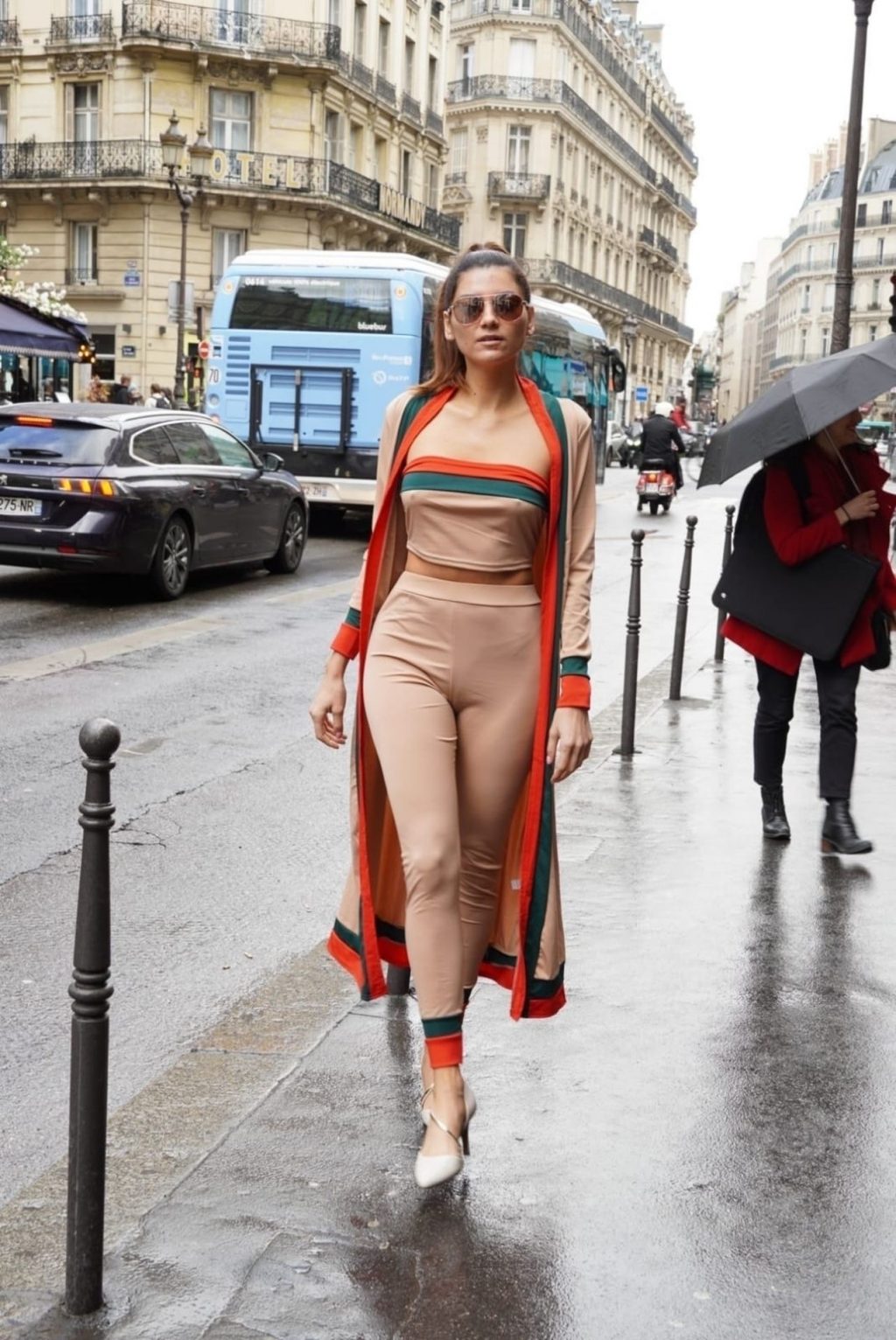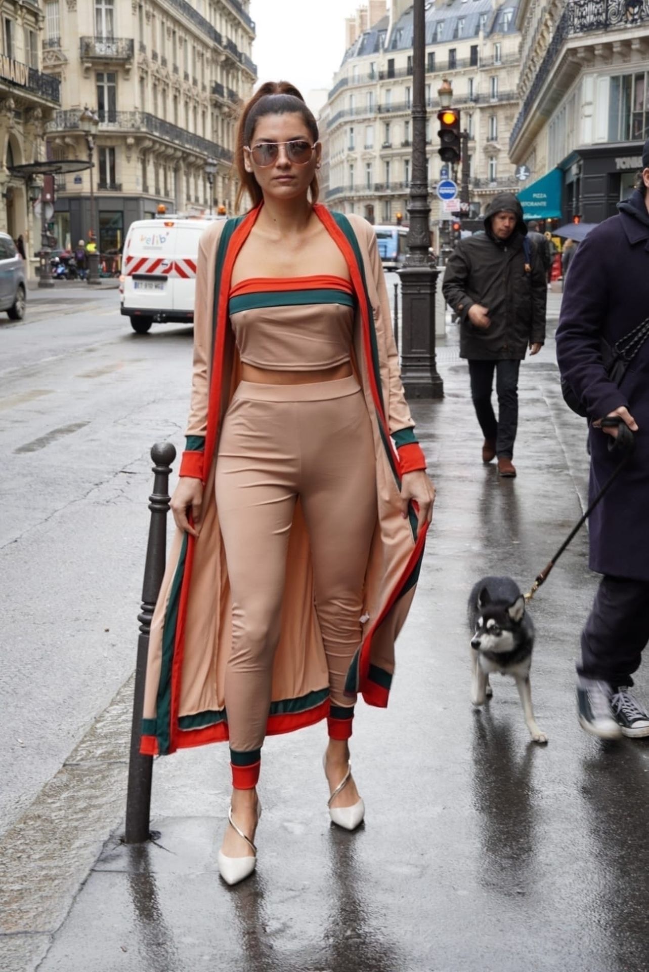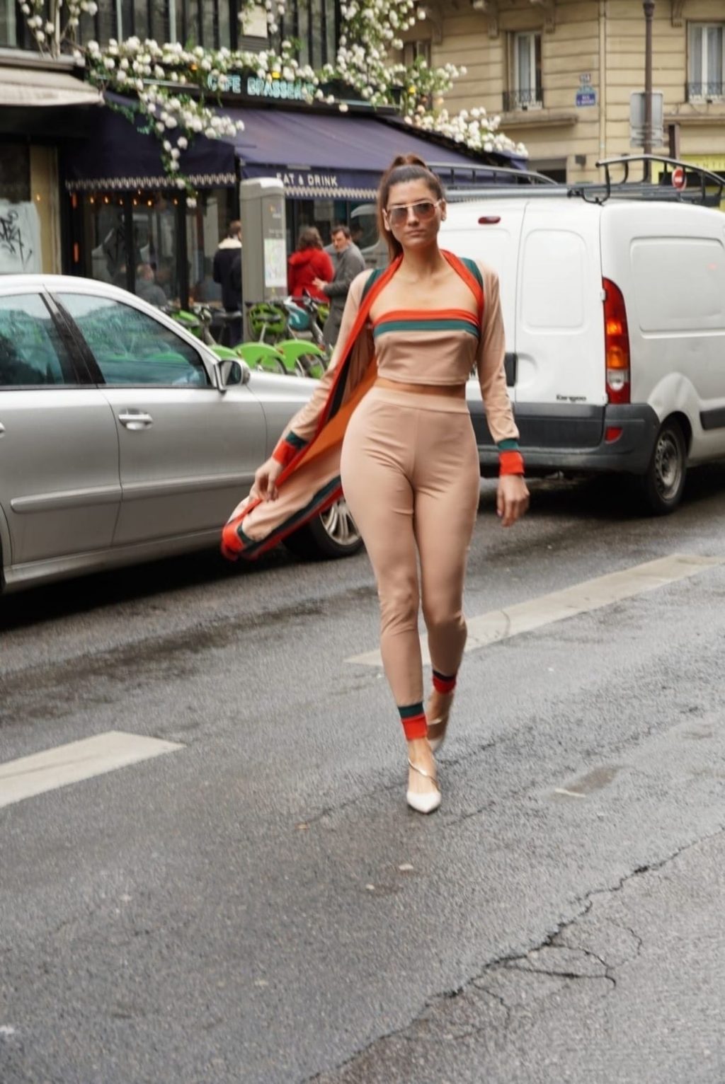 Actriz Blanca Blanco (39) posa para la Semana de la Moda de París, 01/03/2020. Ella posaba afuera sin sujetador.