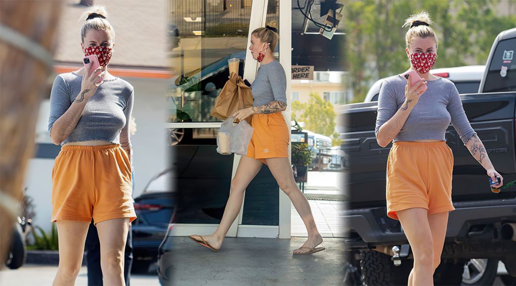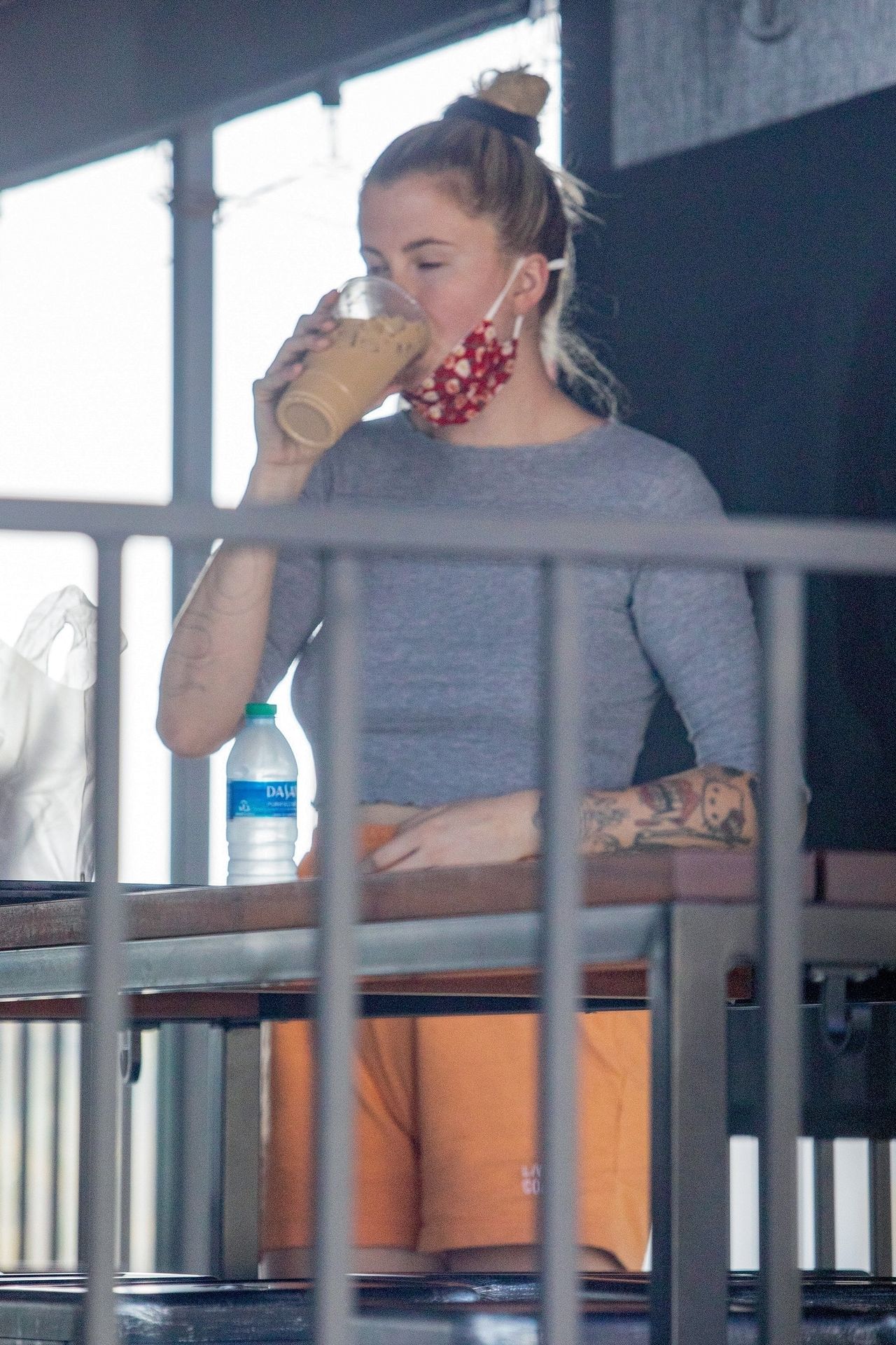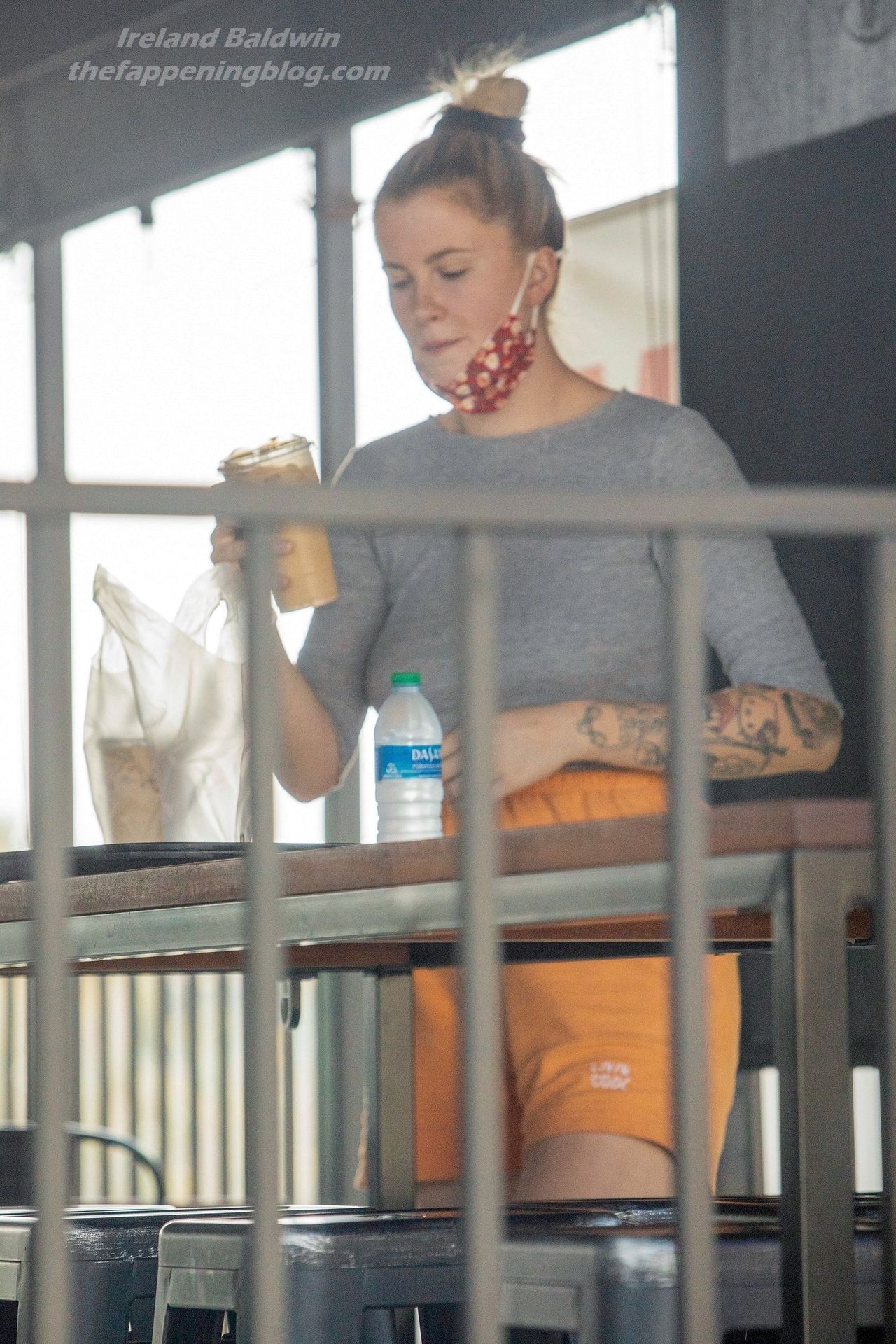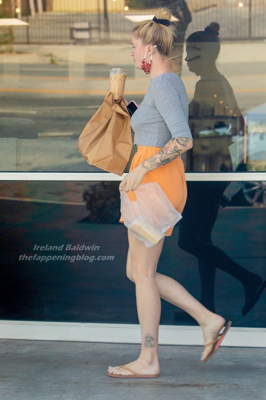 La modelo Ireland Baldwin toma su bebida de café helado mientras se detiene a comer comida mexicana en el restaurante Que Ricos Tacos en Los Ángeles sin usar sujetador, 21/10/2020.