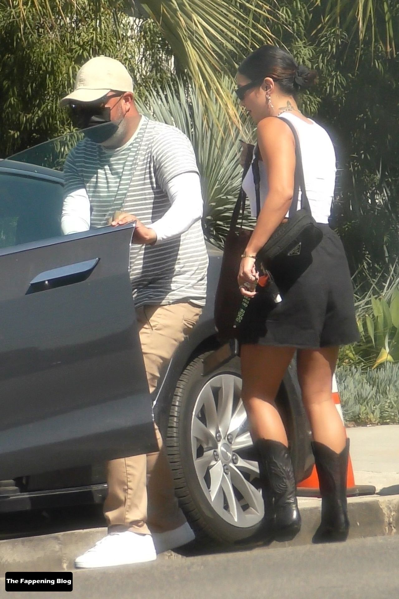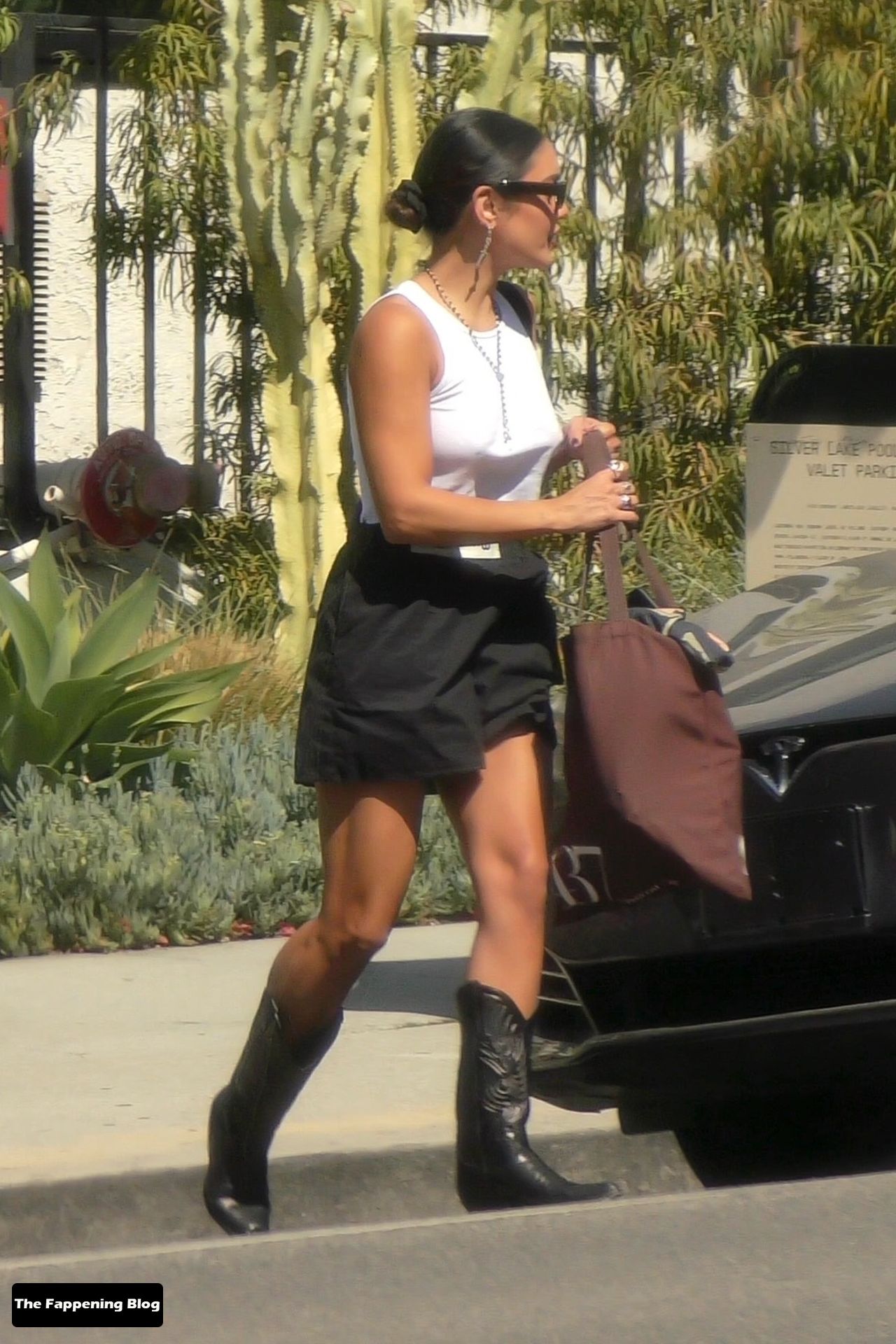 La estrella morena de Fappening llevaba el cabello recogido en un moño, una camiseta blanca sin mangas y shorts negros de Miu Miu que combinaban con sus botas de cuero estilo vaquera.