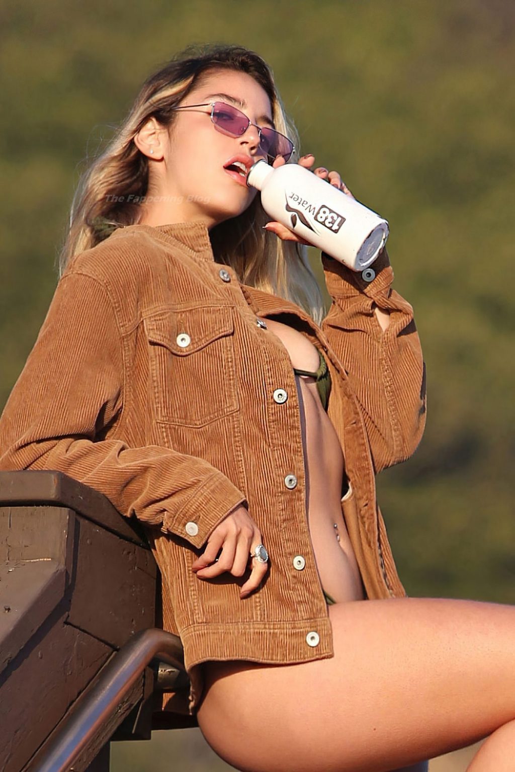 ¡Aquí viene el sol! La modelo colombiana Bridgette Audrey se siente radiante mientras posa para la marca 138 en Malibu, 26/02/2021. La modelo muestra sus curvas con un sexy bikini oliva.