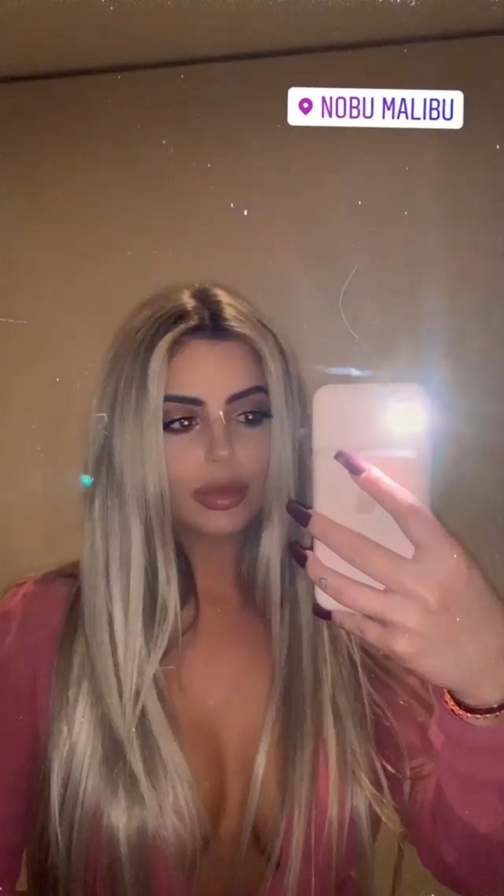 La personalidad de la televisión de realidad Brielle Biermann muestra su escote mientras cena con sus amigos en West Hollywood, 10/10/2019.