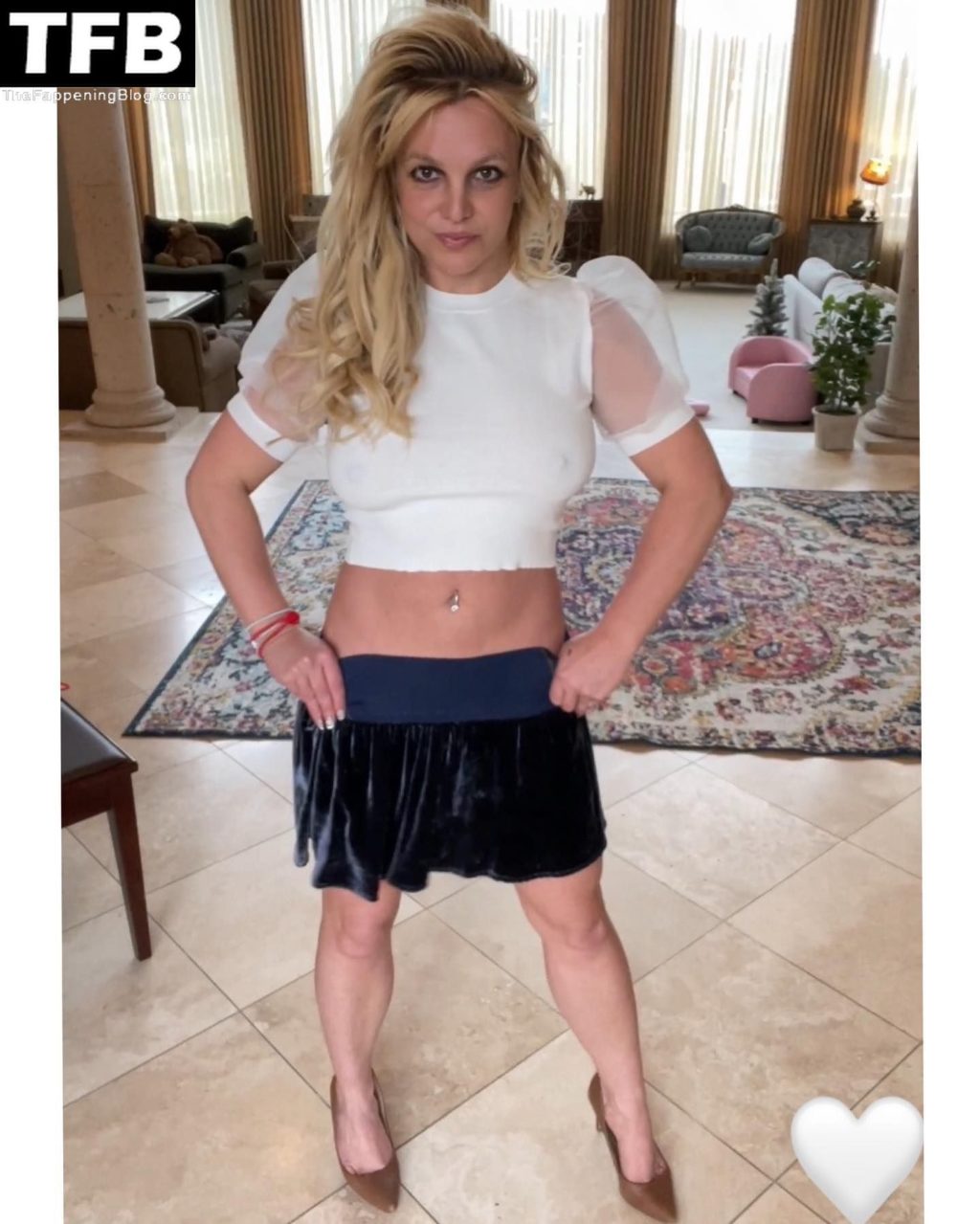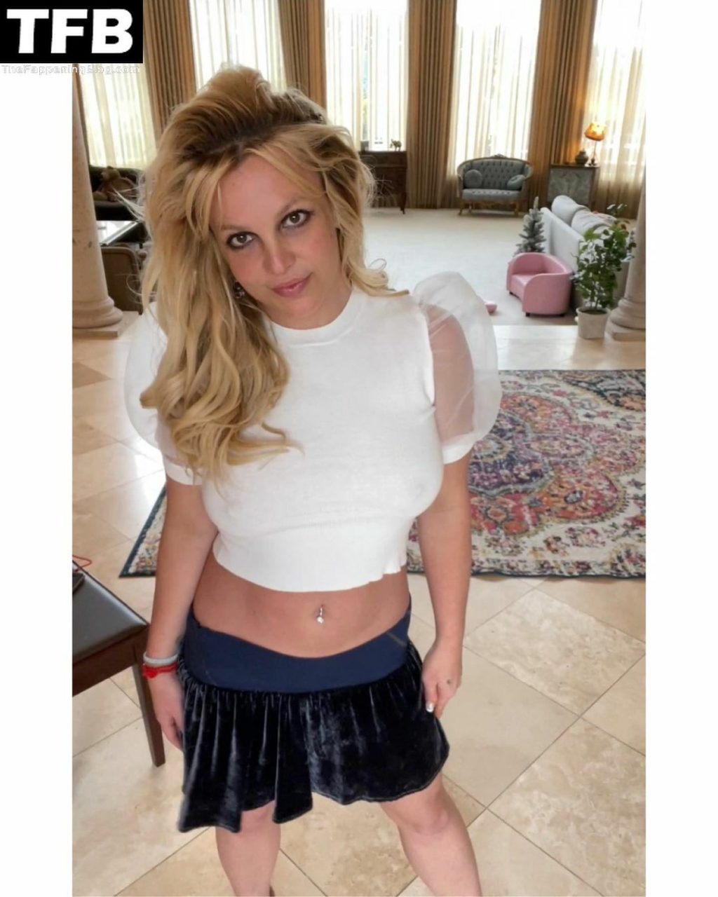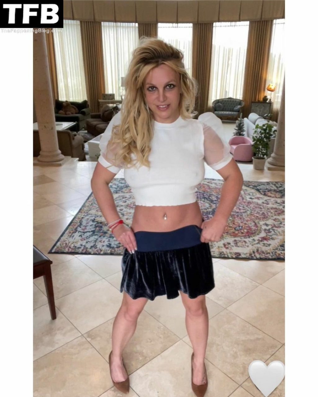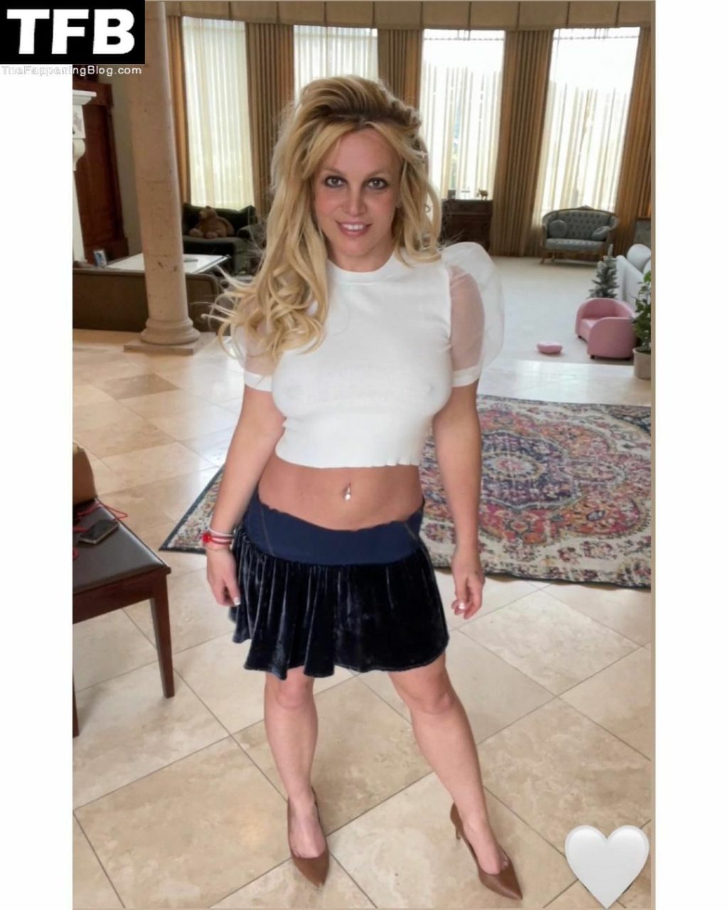 Cantante Britney Spears posa sin sujetador con una camiseta blanca y una falda azul para sus seguidores en su cuenta restaurada de Instagram, 18/03/2022.