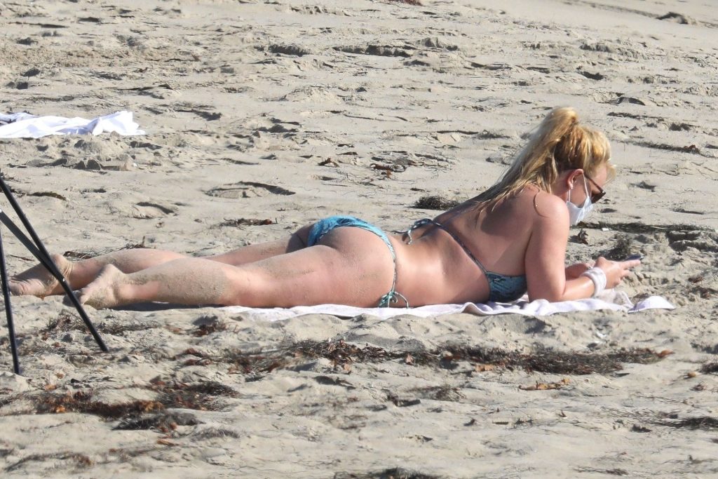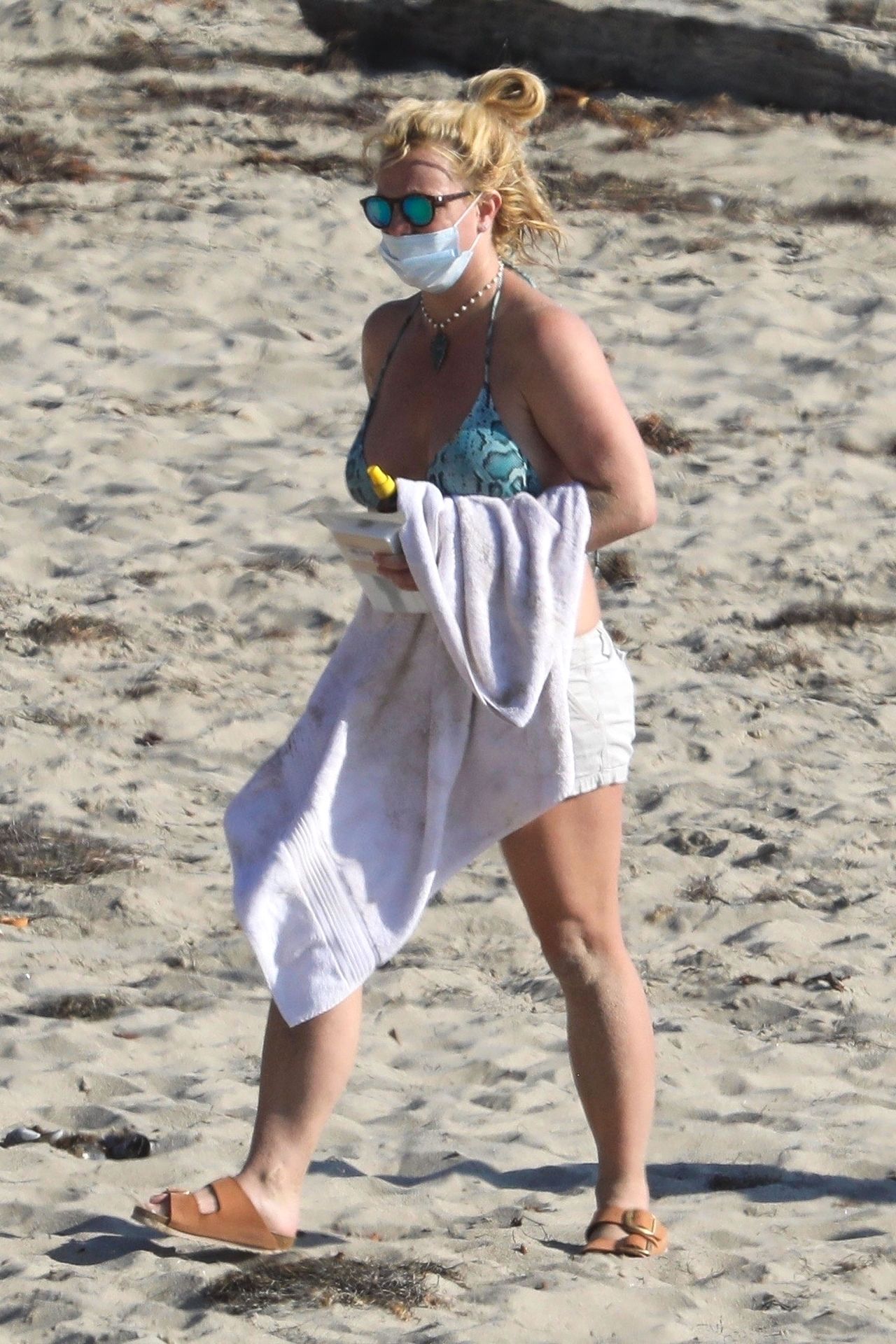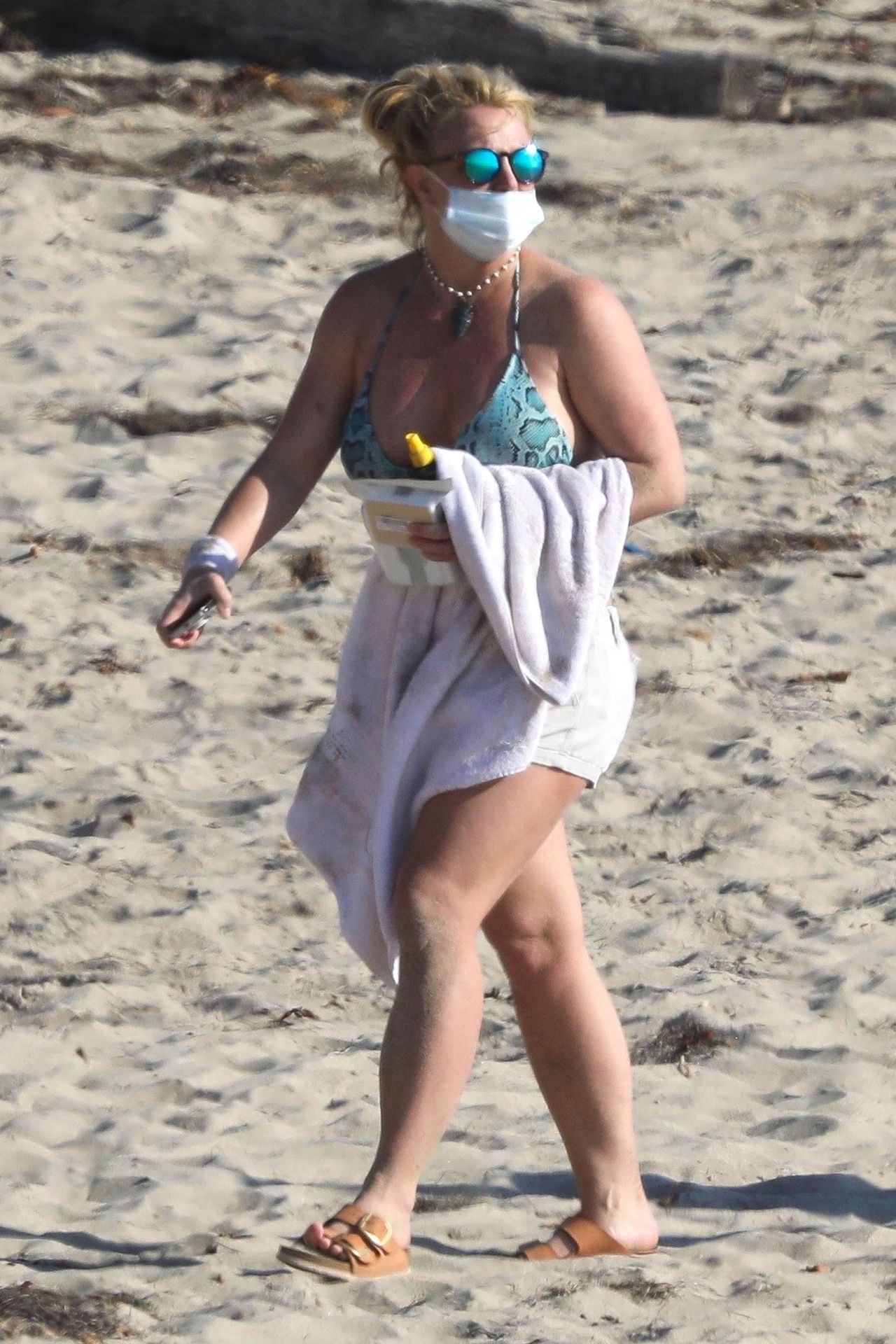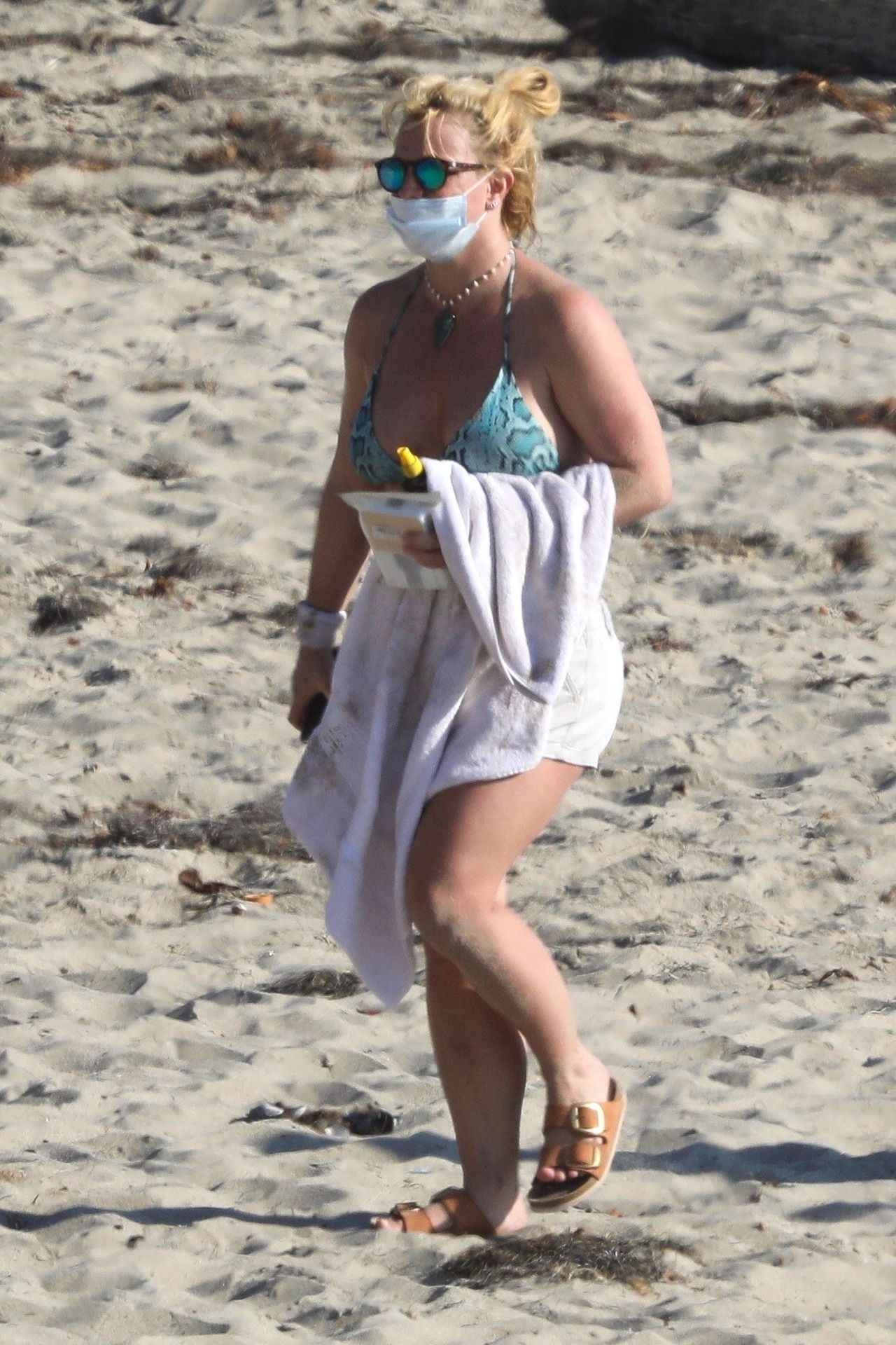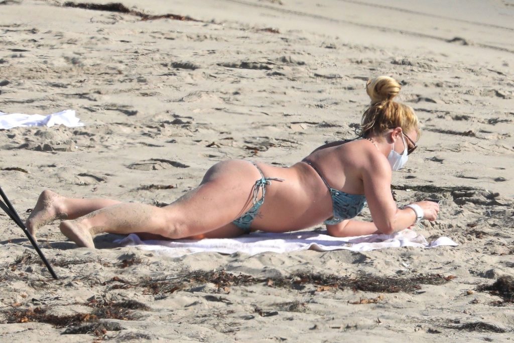 La cantante y compositora estadounidense Britney Spears lleva su mascarilla protectora mientras toma el sol en la playa de Malibu, mostrando su cuerpo playero y vistiendo un bikini de dos piezas con estampado animal bajo el sol abrasador, 15/10/2020.