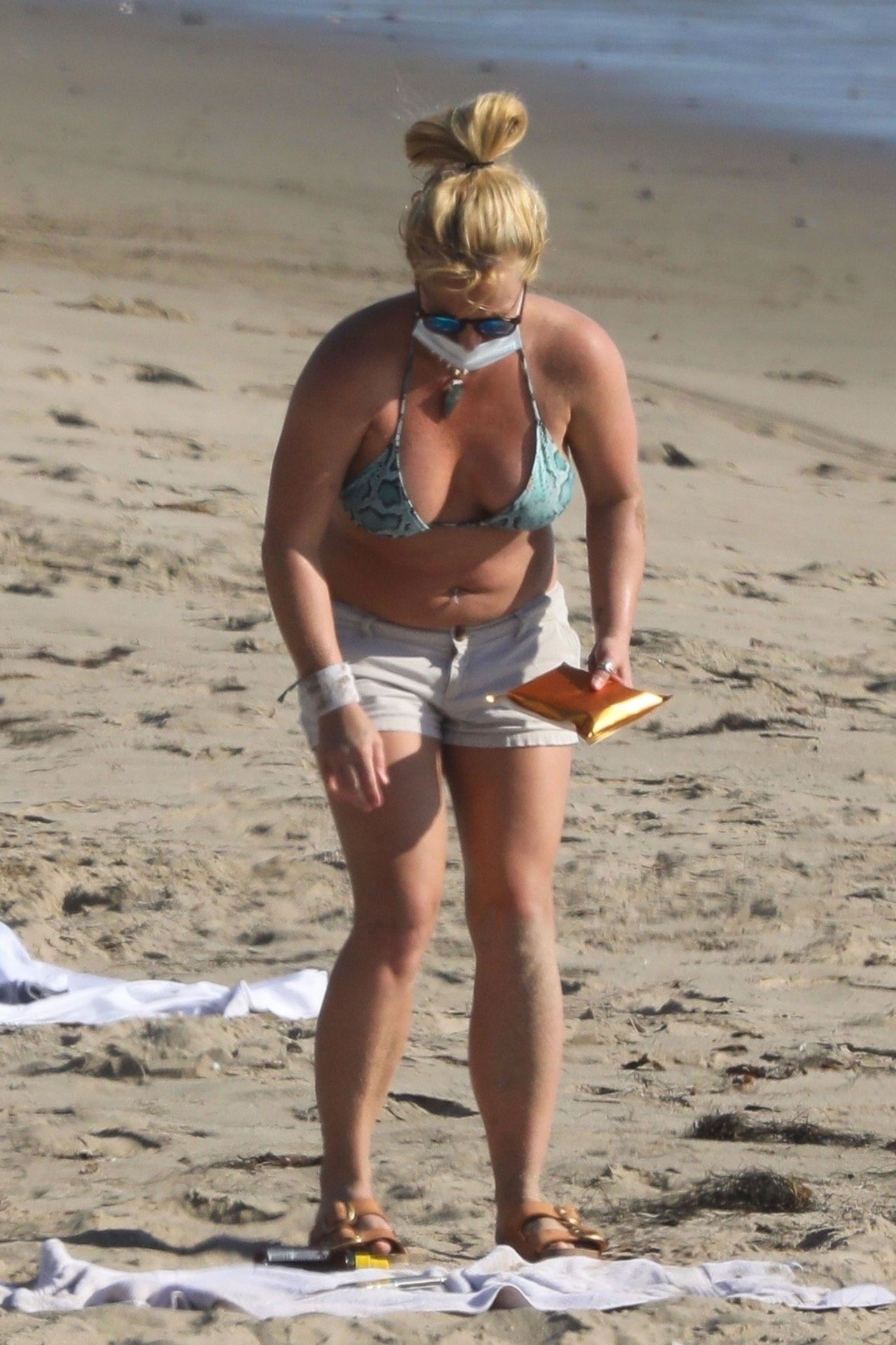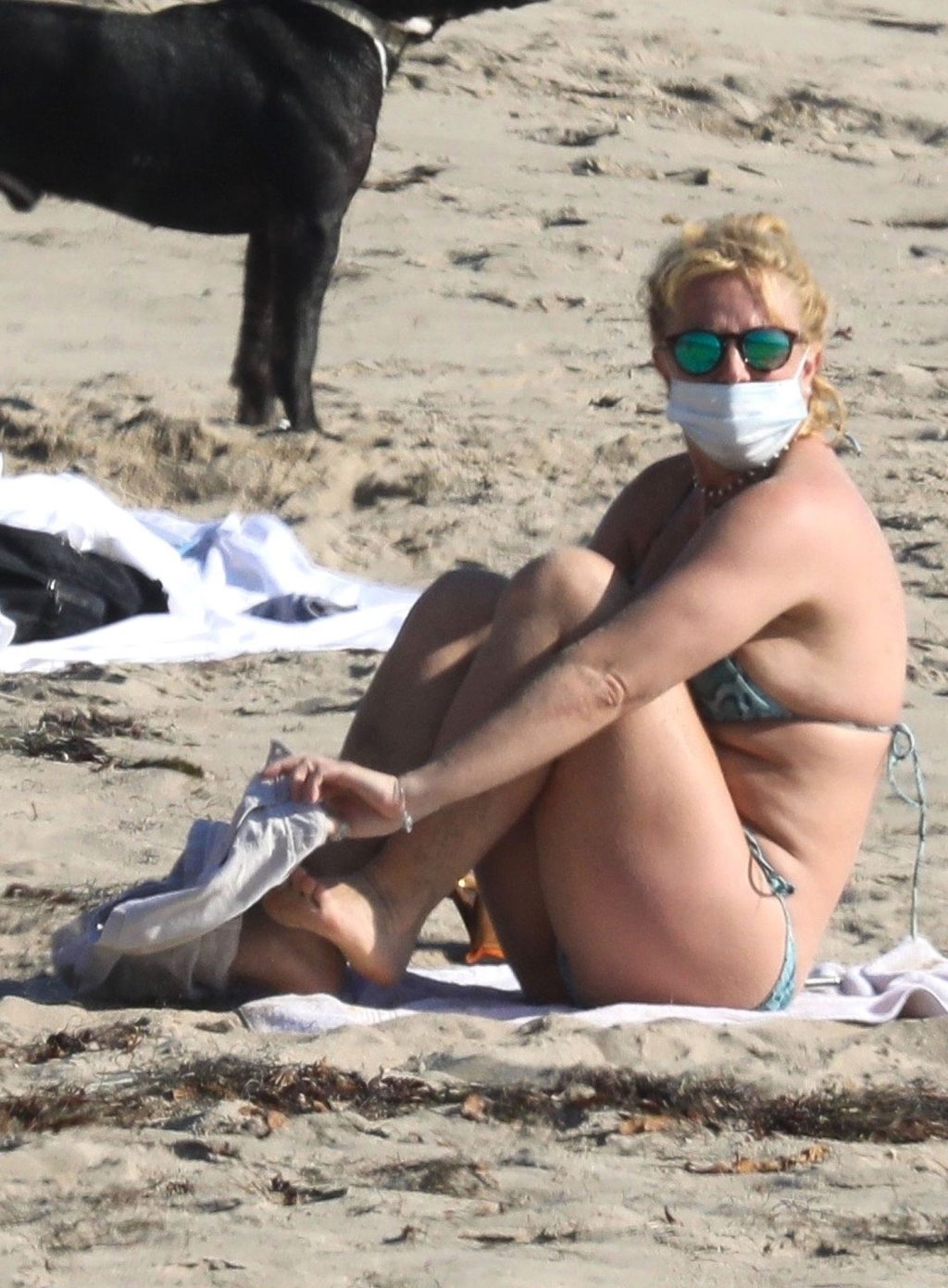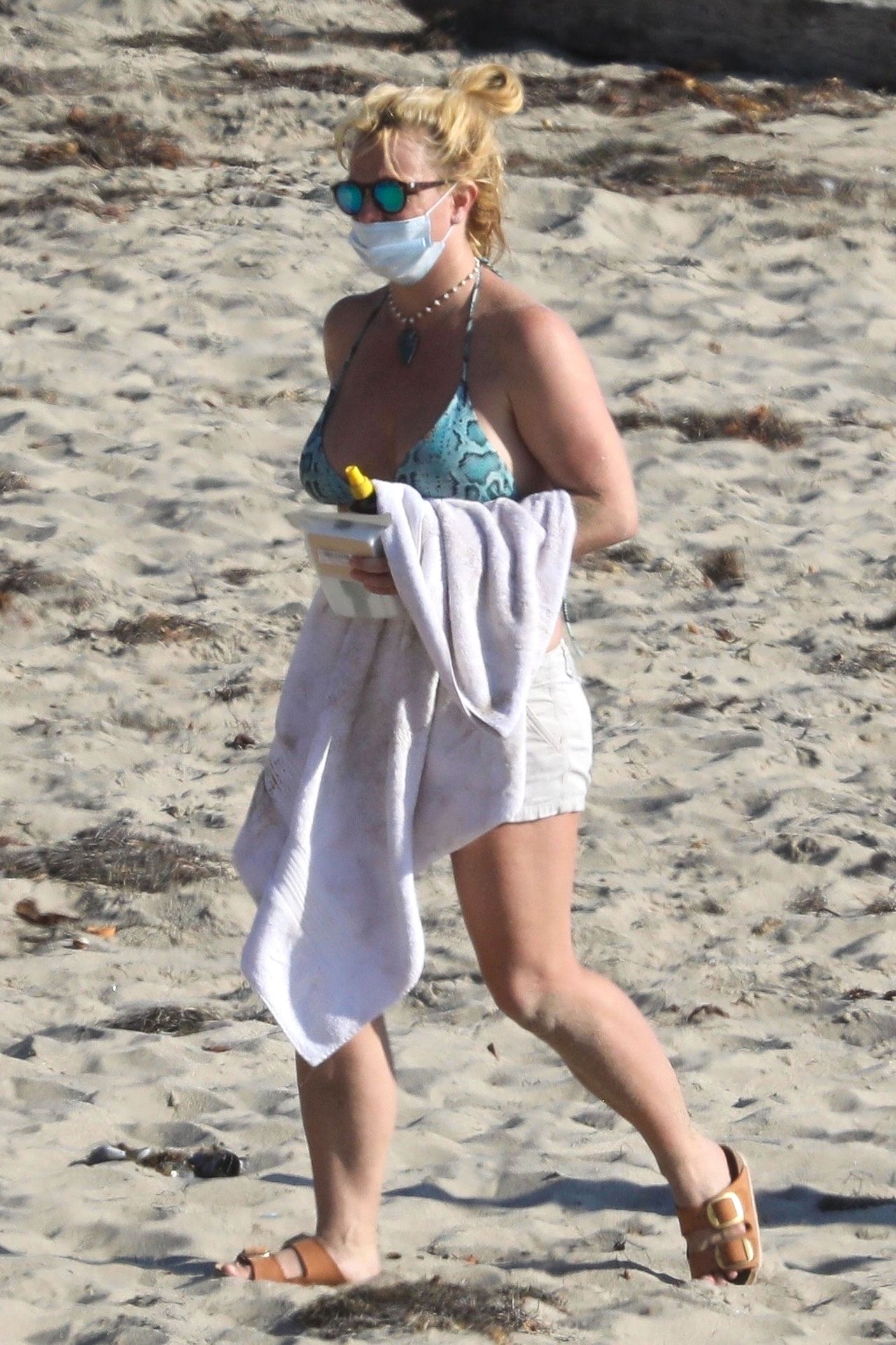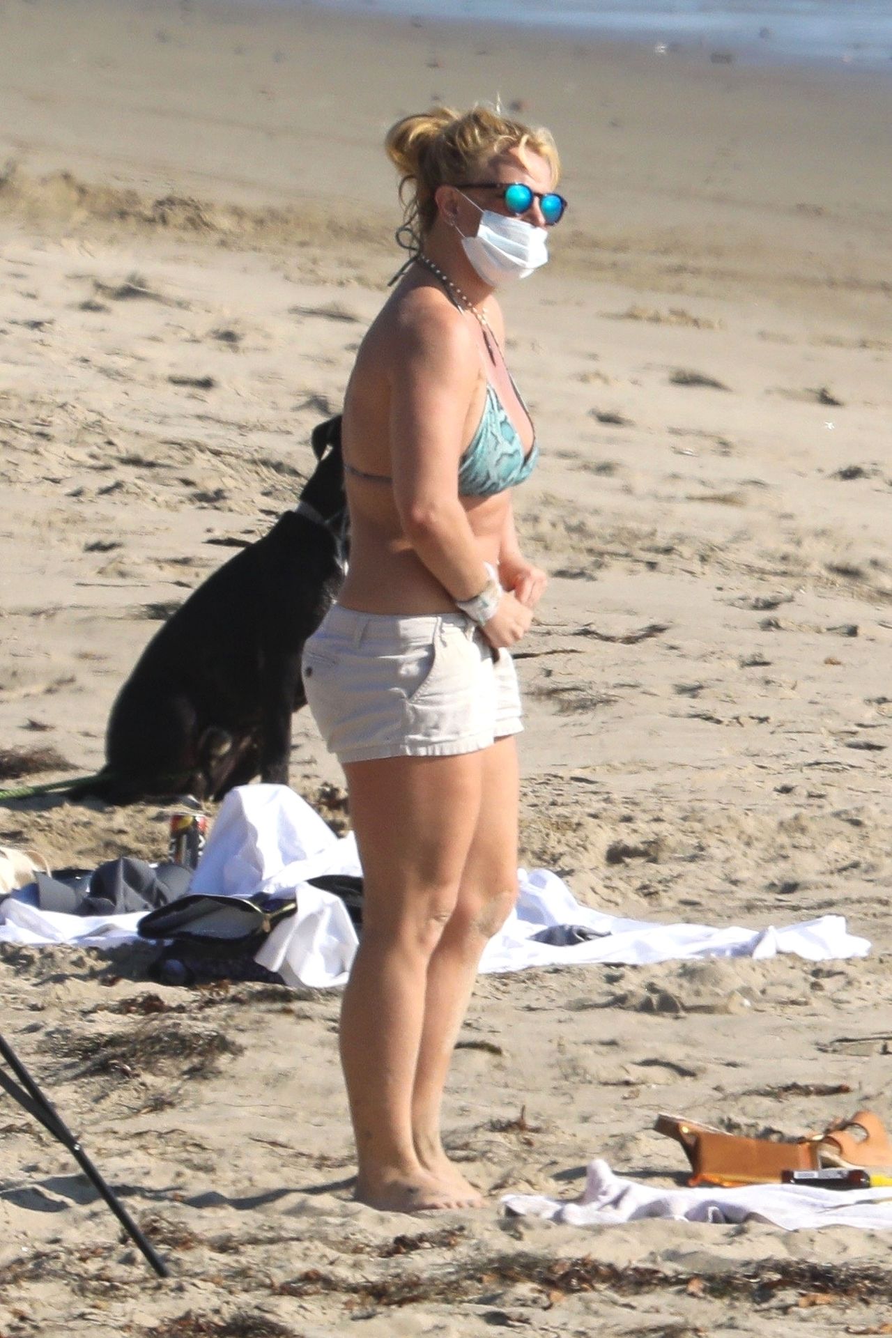 La cantante y compositora estadounidense Britney Spears lleva su mascarilla protectora mientras toma el sol en la playa de Malibu, mostrando su cuerpo playero y vistiendo un bikini de dos piezas con estampado animal bajo el sol abrasador, 15/10/2020.
