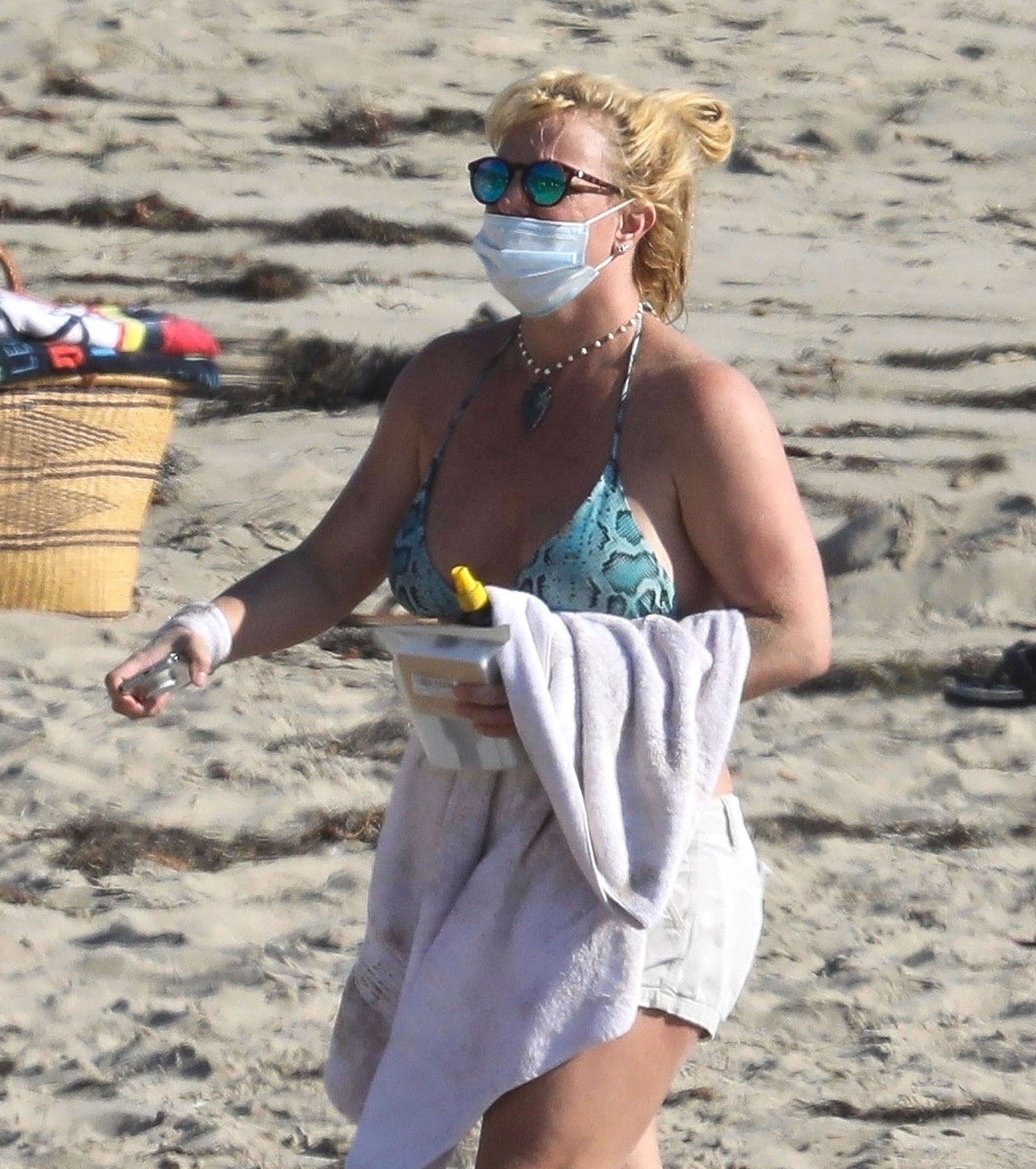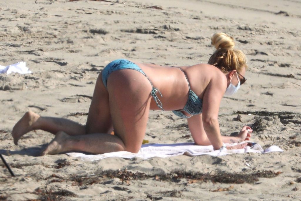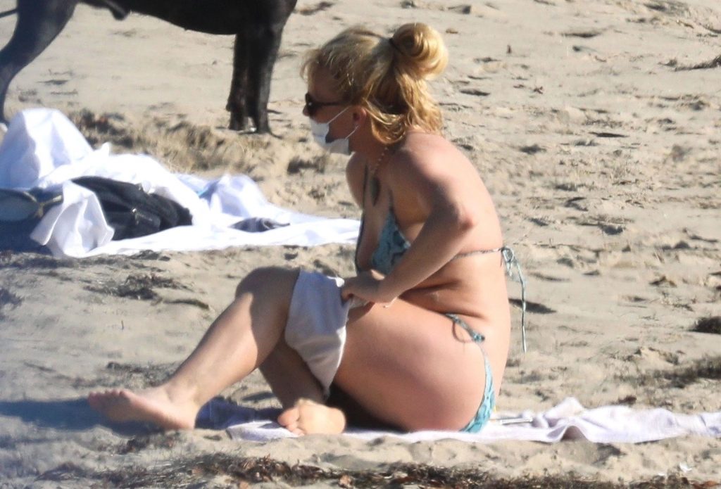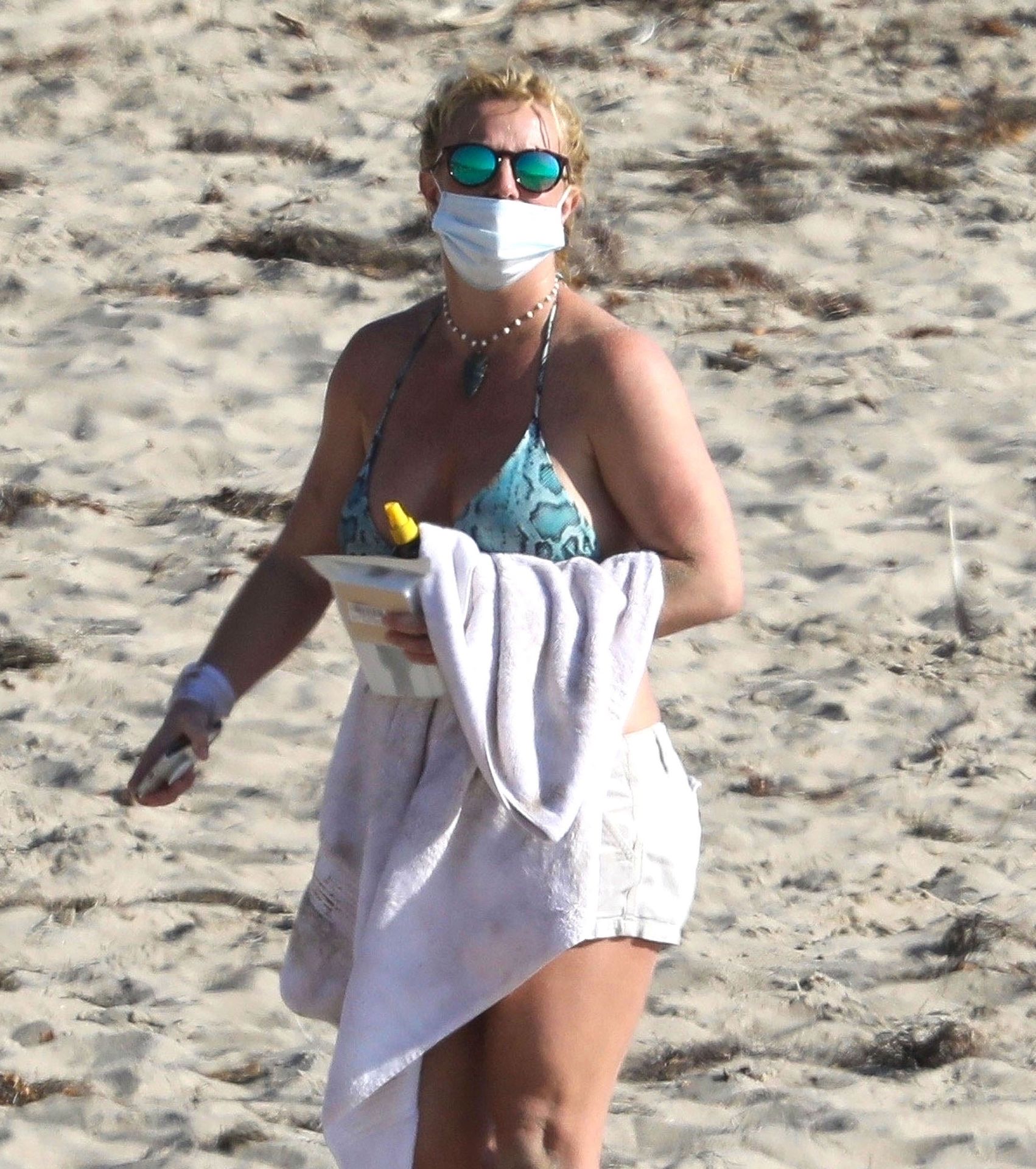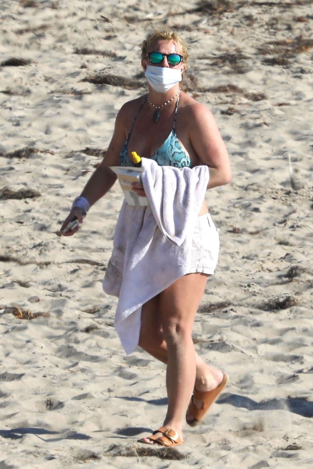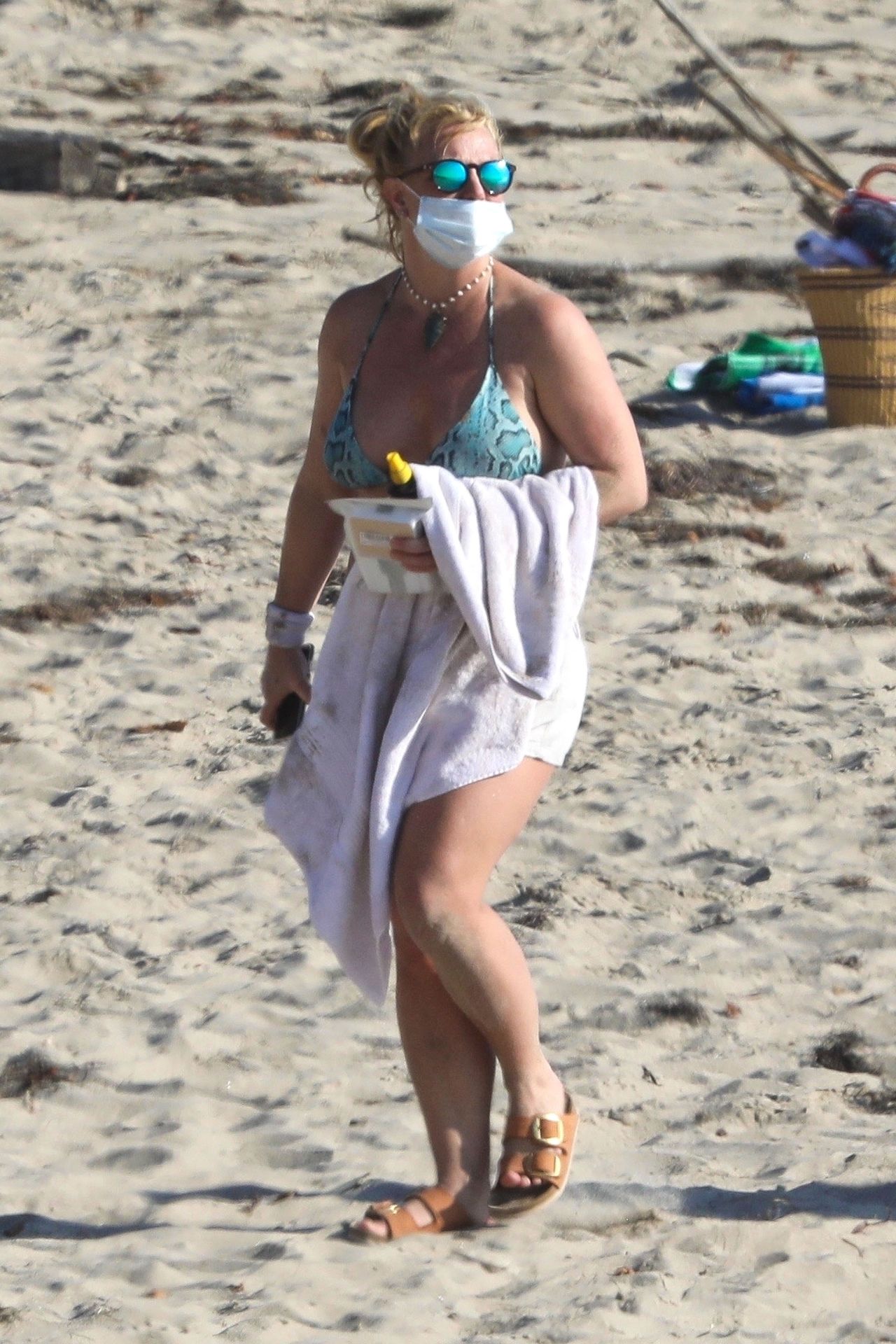 La cantante y compositora estadounidense Britney Spears lleva su mascarilla protectora mientras toma el sol en la playa de Malibu, mostrando su cuerpo playero y vistiendo un bikini de dos piezas con estampado animal bajo el sol abrasador, 15/10/2020.