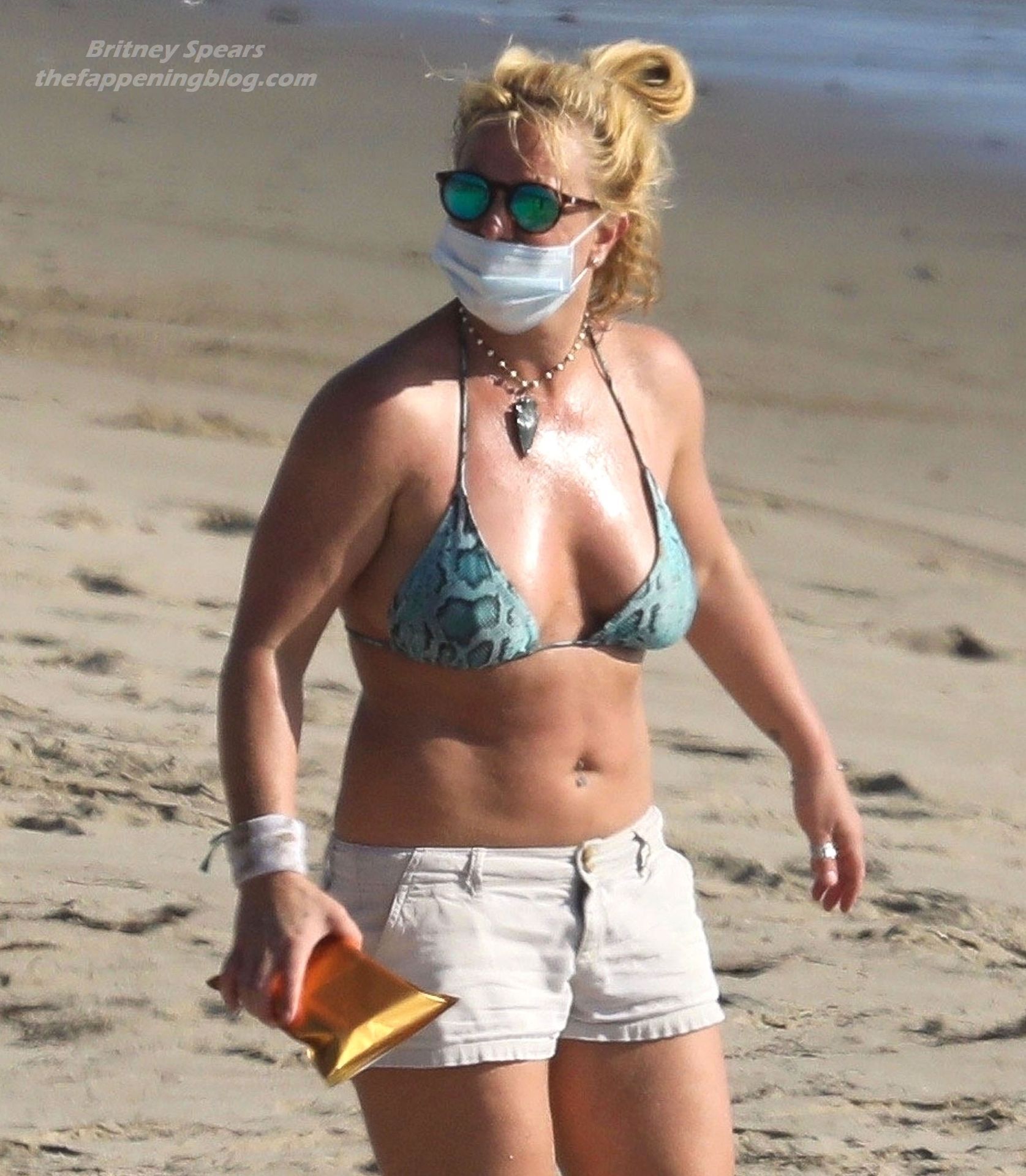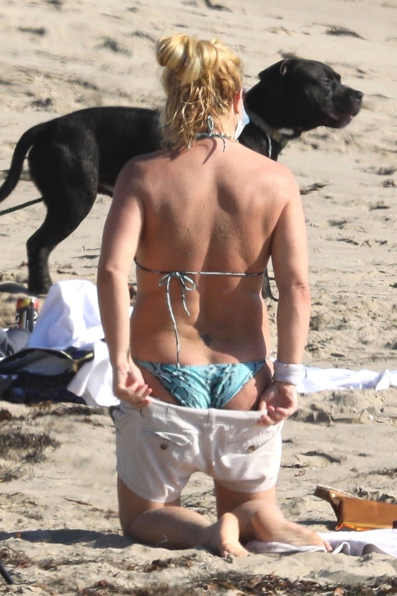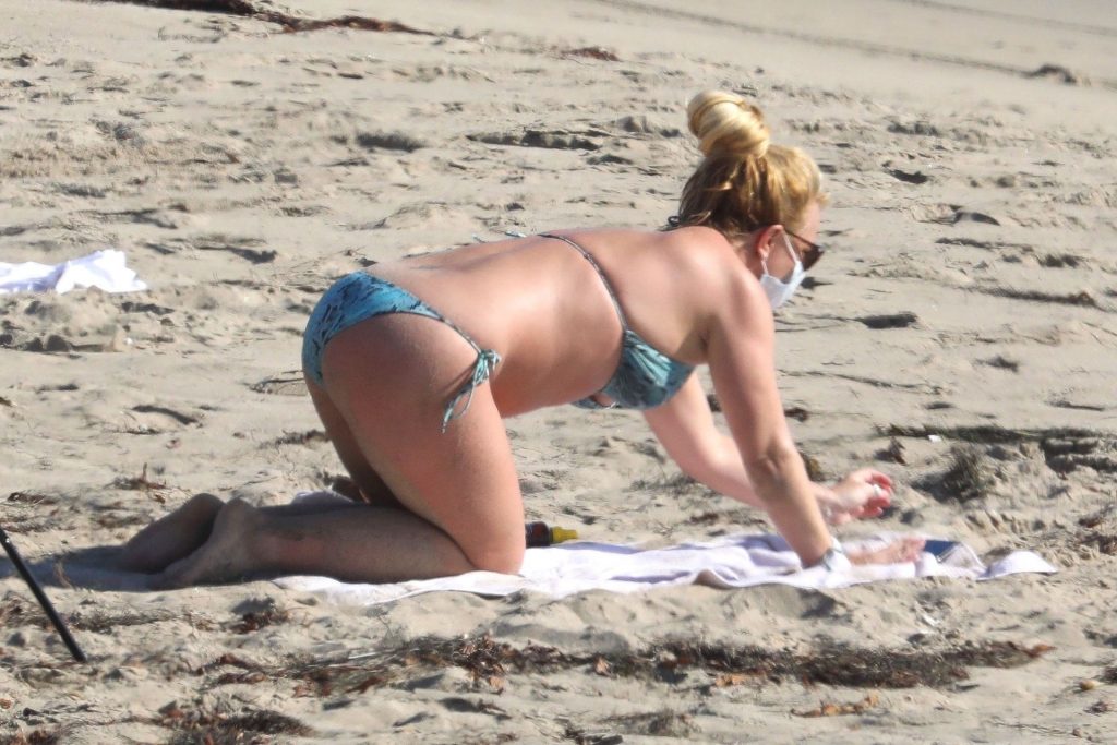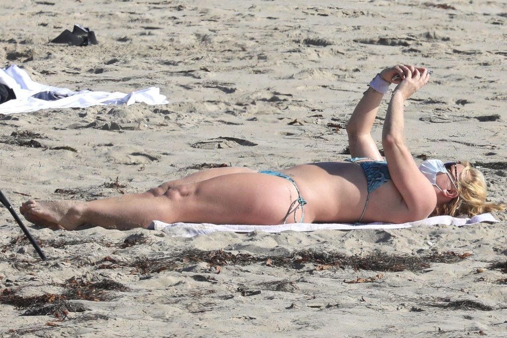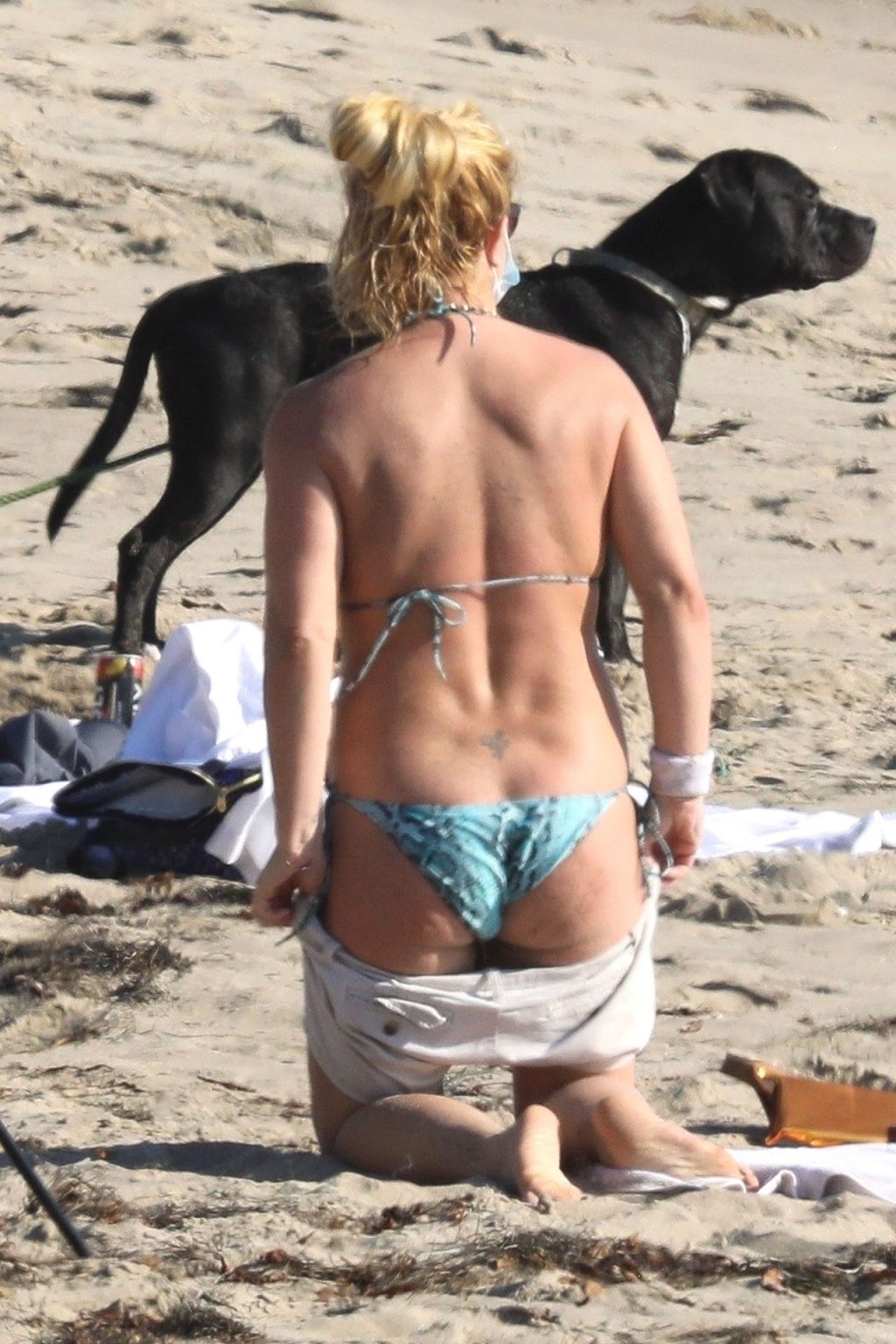 La cantante y compositora estadounidense Britney Spears lleva su mascarilla protectora mientras toma el sol en la playa de Malibu, mostrando su cuerpo playero y vistiendo un bikini de dos piezas con estampado animal bajo el sol abrasador, 15/10/2020.