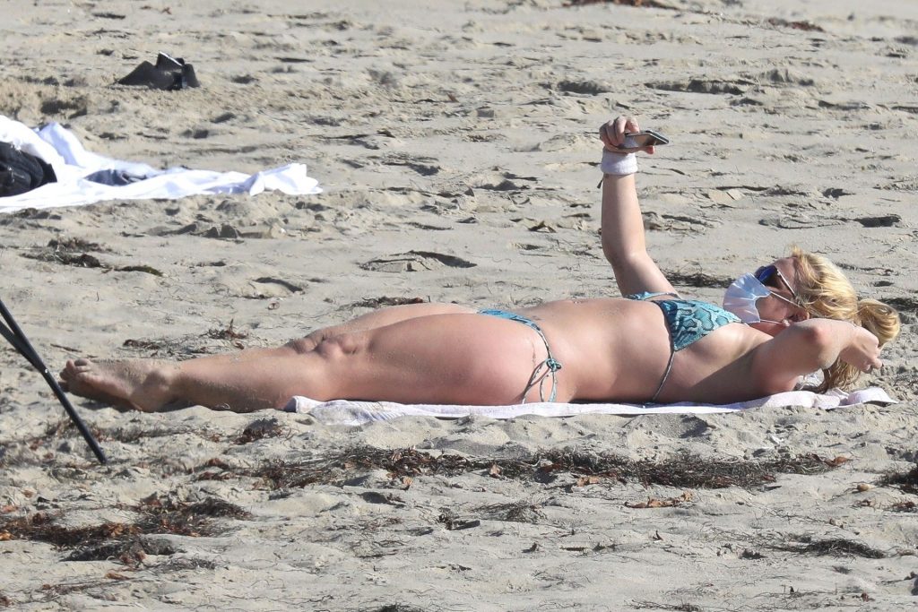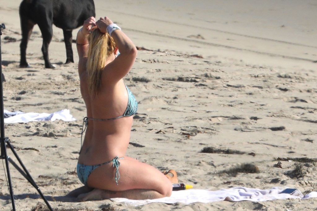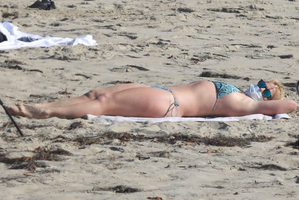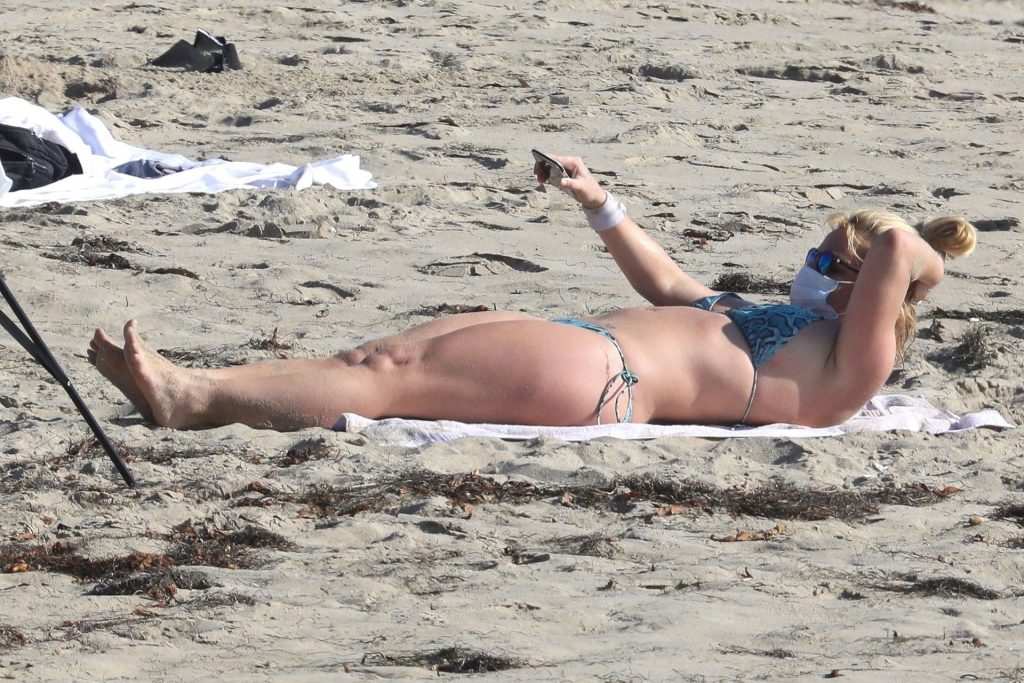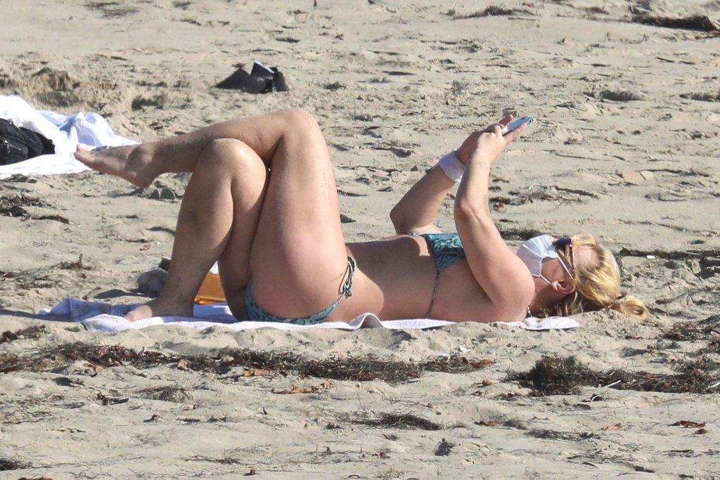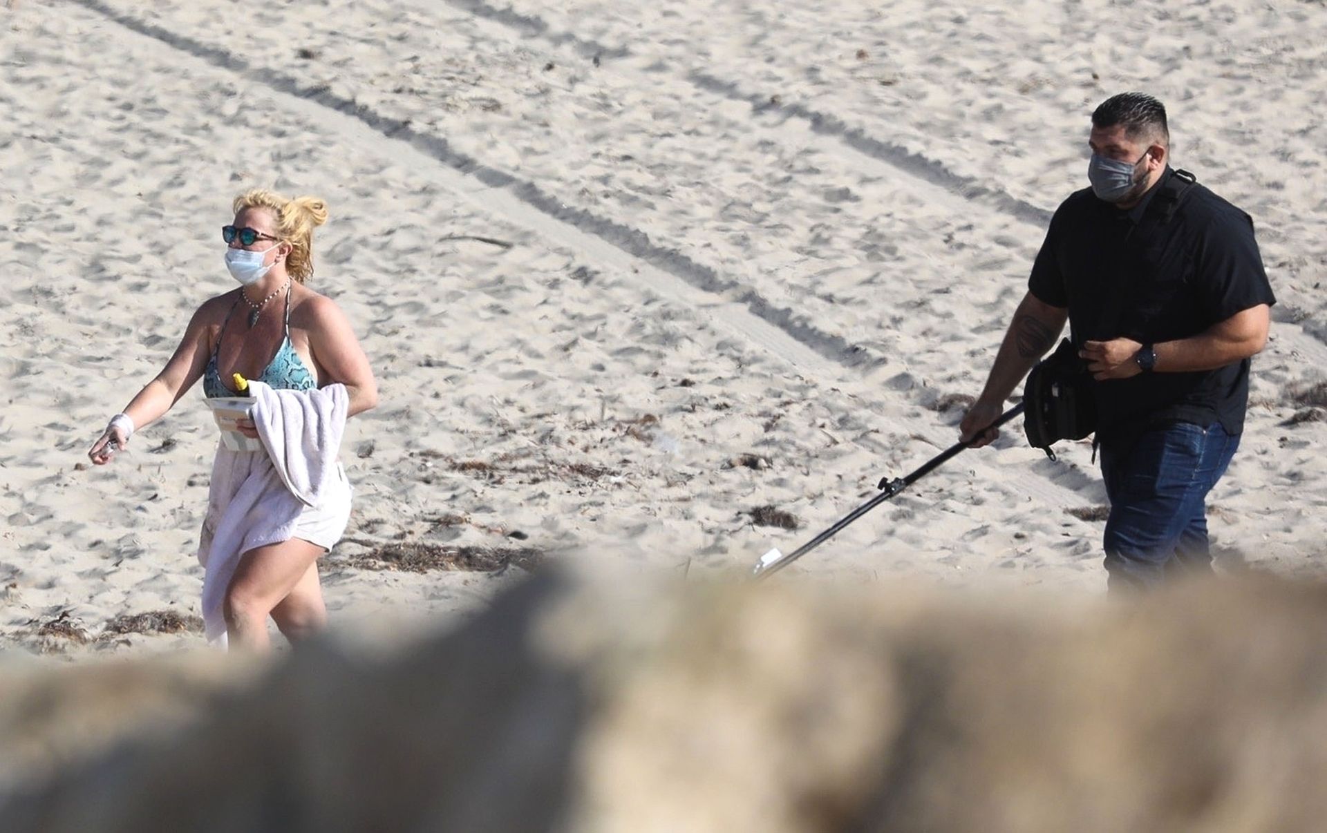 La cantante y compositora estadounidense Britney Spears lleva su mascarilla protectora mientras toma el sol en la playa de Malibu, mostrando su cuerpo playero y vistiendo un bikini de dos piezas con estampado animal bajo el sol abrasador, 15/10/2020.
